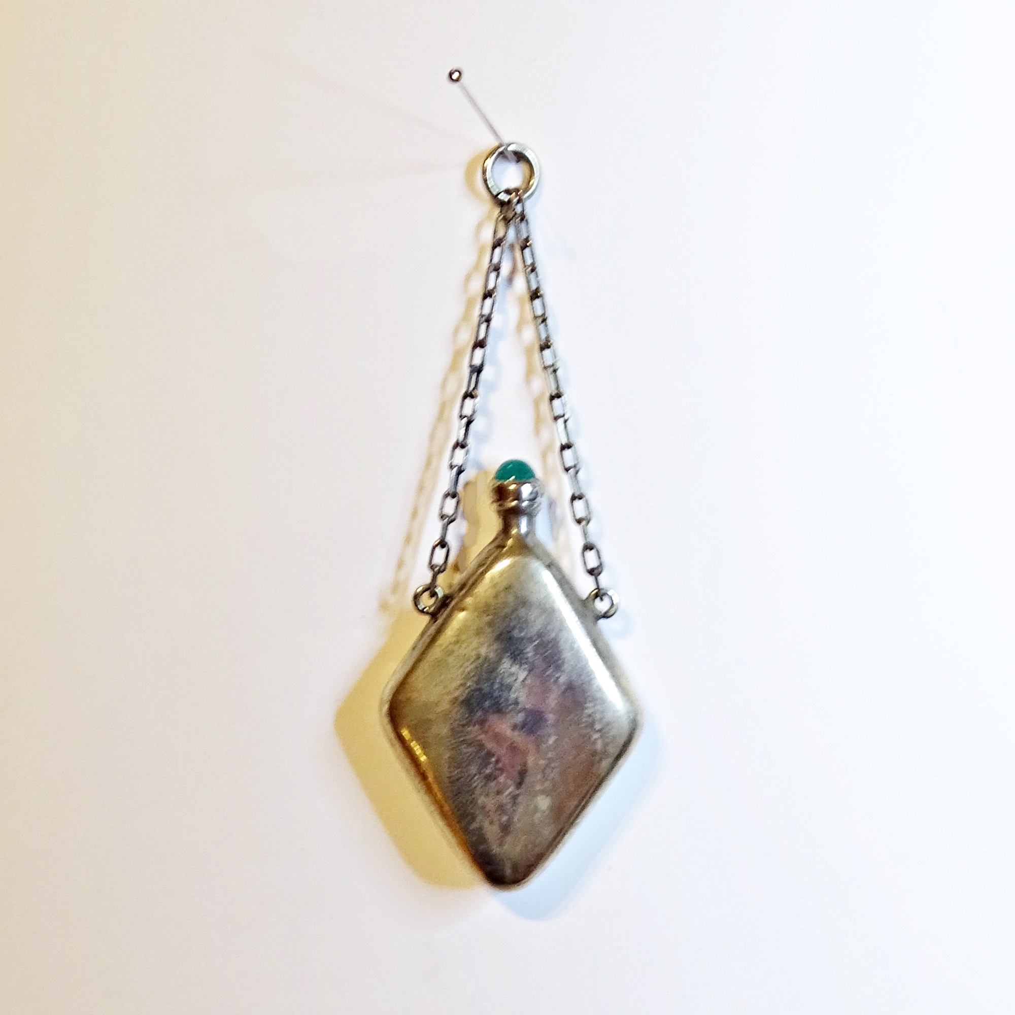 Pendant diamond-shaped scent bottle in silver with screw cap surmounted by a glass paste green stone cabochon. Suspension chain with little ring. No marks.