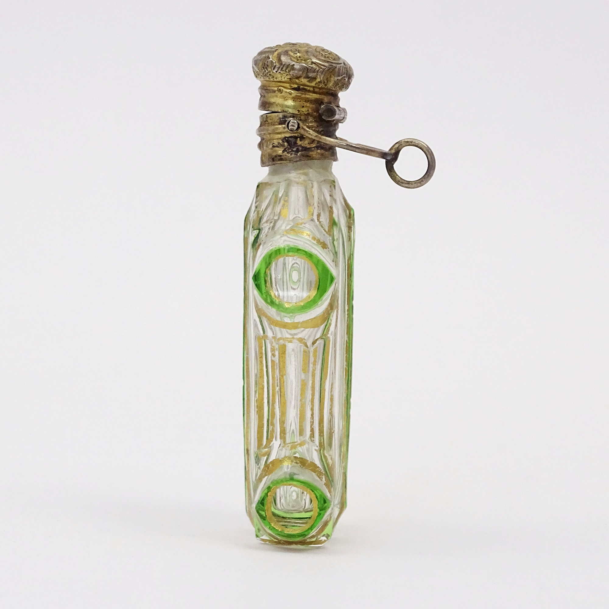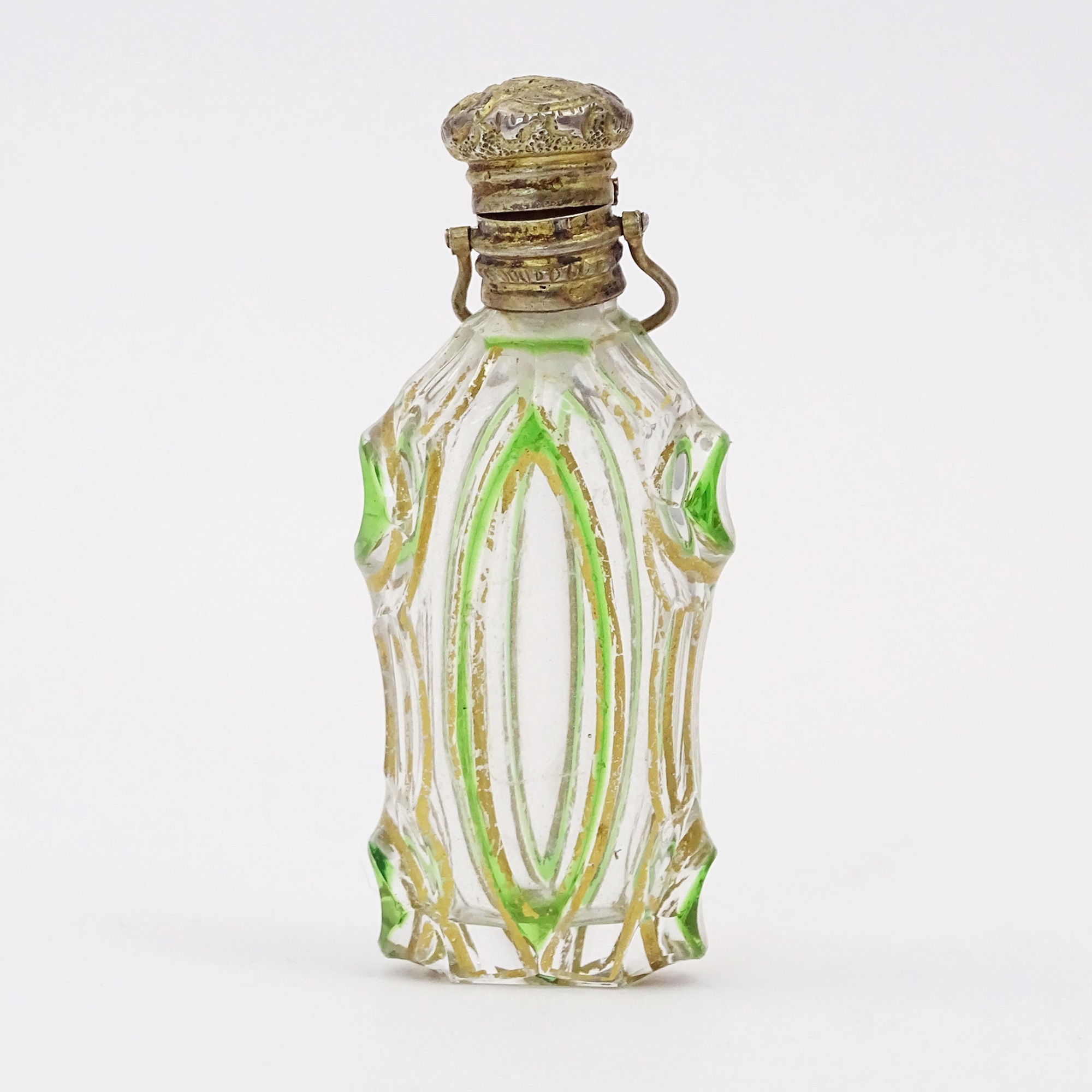 Peculiar-shaped scent bottle in double glass with a cut decor painted in gold and green along the rims. Vermeil hinged cap with marks and suspension ring.