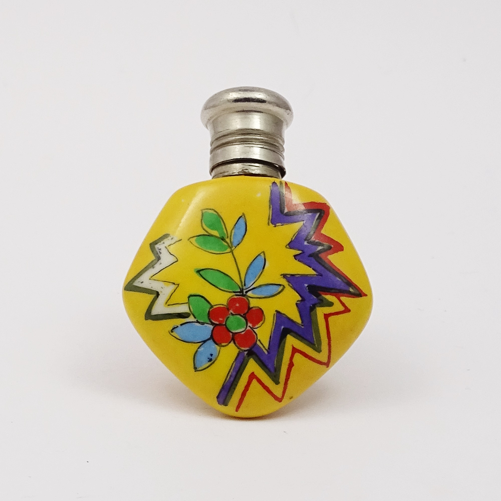 Home » Collection » Pentagonal scent bottle in yellow porcelain with abstract decor