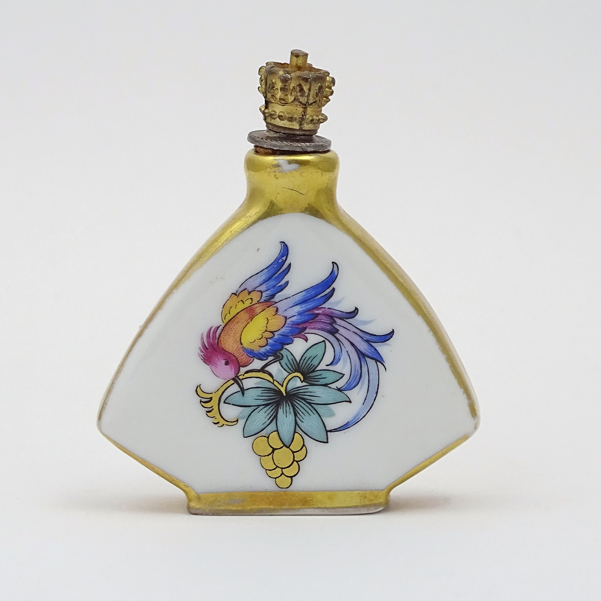 Pentagonal porcelain scent bottle with decal of a Paradise Bird on the front and a little decor on the back, both gilded framed. Gilded metal crown top. By Weiss, Kuhnert & Company.