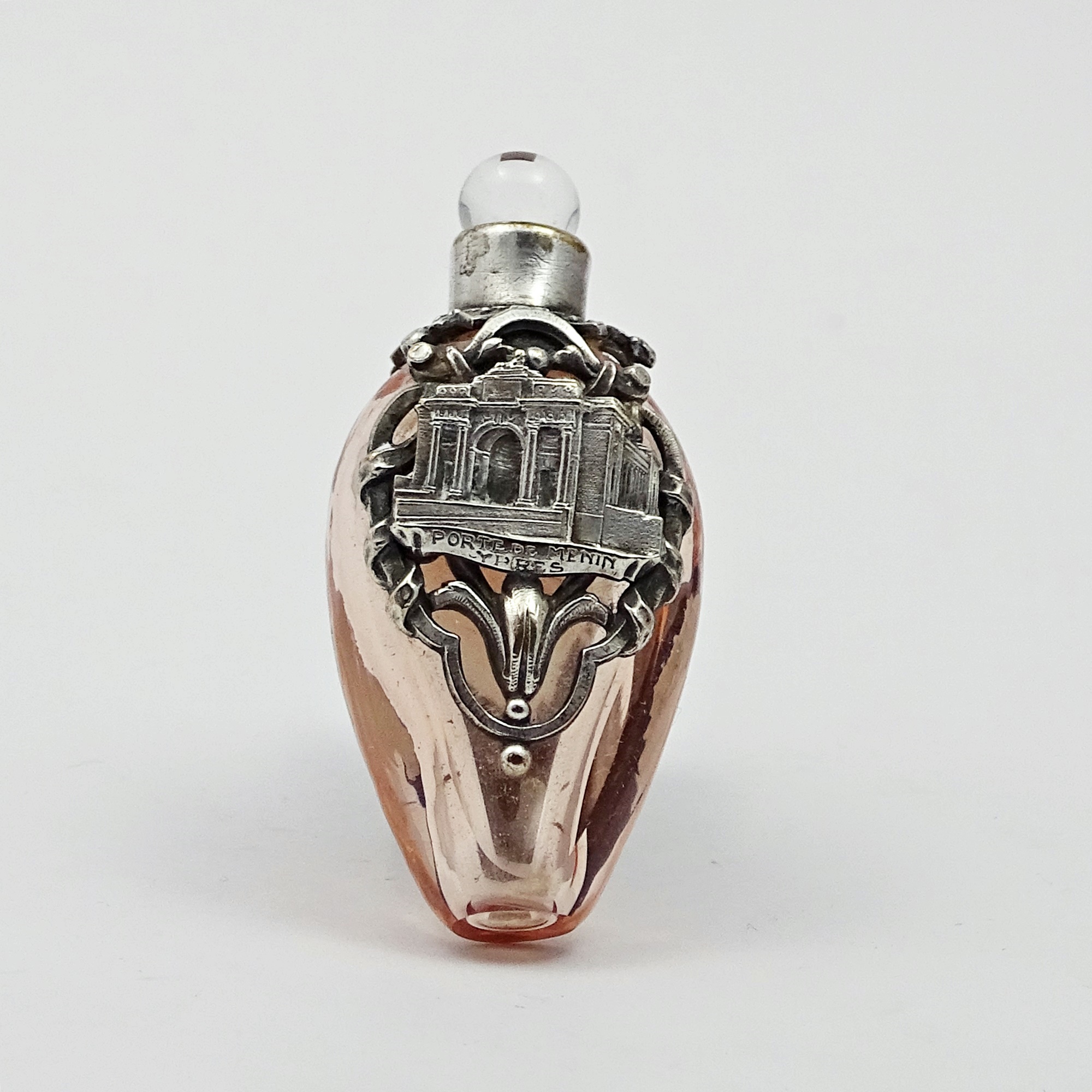Scent bottle made of thick blown glass of a delicate peach pink. It bears a silver plaque showing a building and the inscription “PORTE DE MENIN YPRES”. Round, long-drop blown glass stopper. Suspension ring. No marks.