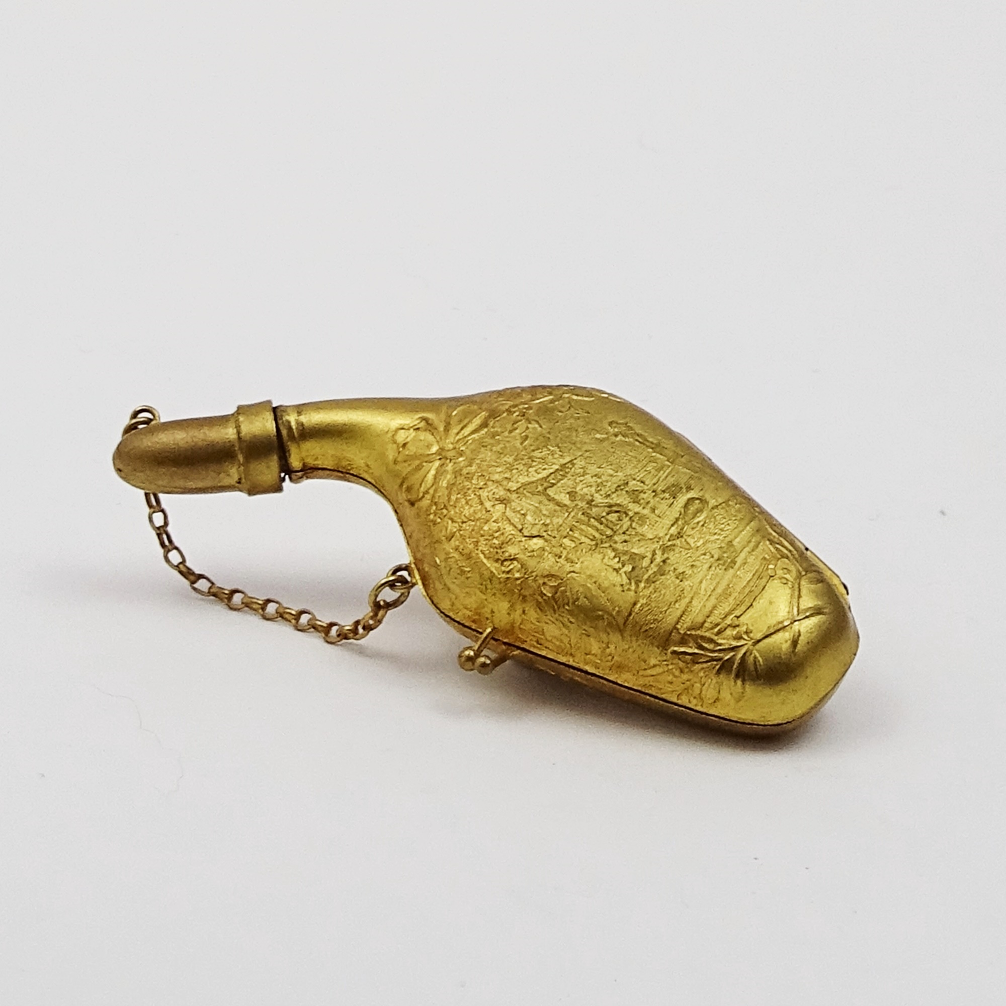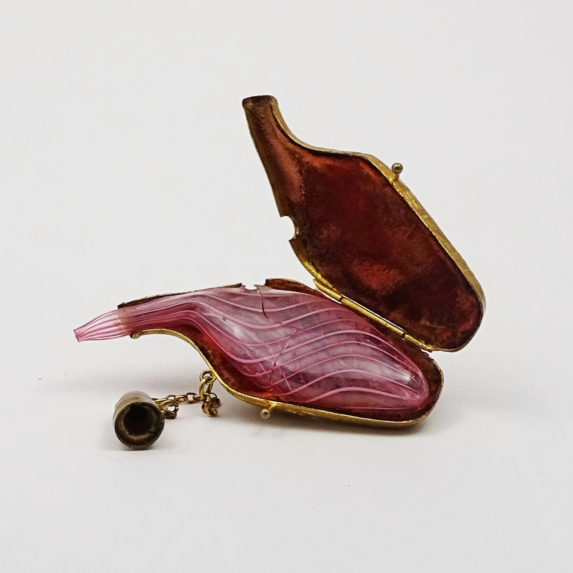 So called “pistolet” scent bottle, referring to the shape of the small striped glass blown bottle. They were fitted with a rubber atomizer bulb (missing) and they sold in a fancy silvered metal case lined with red velvet which follows the shape of the atomizer. In this case there is a courting scene showing a couple in a 18th Century costume: the woman is sitting on a bench, the man indicates a statue of Cupid, god of Love. These bottles were first manufactured by Mokins of Paris.