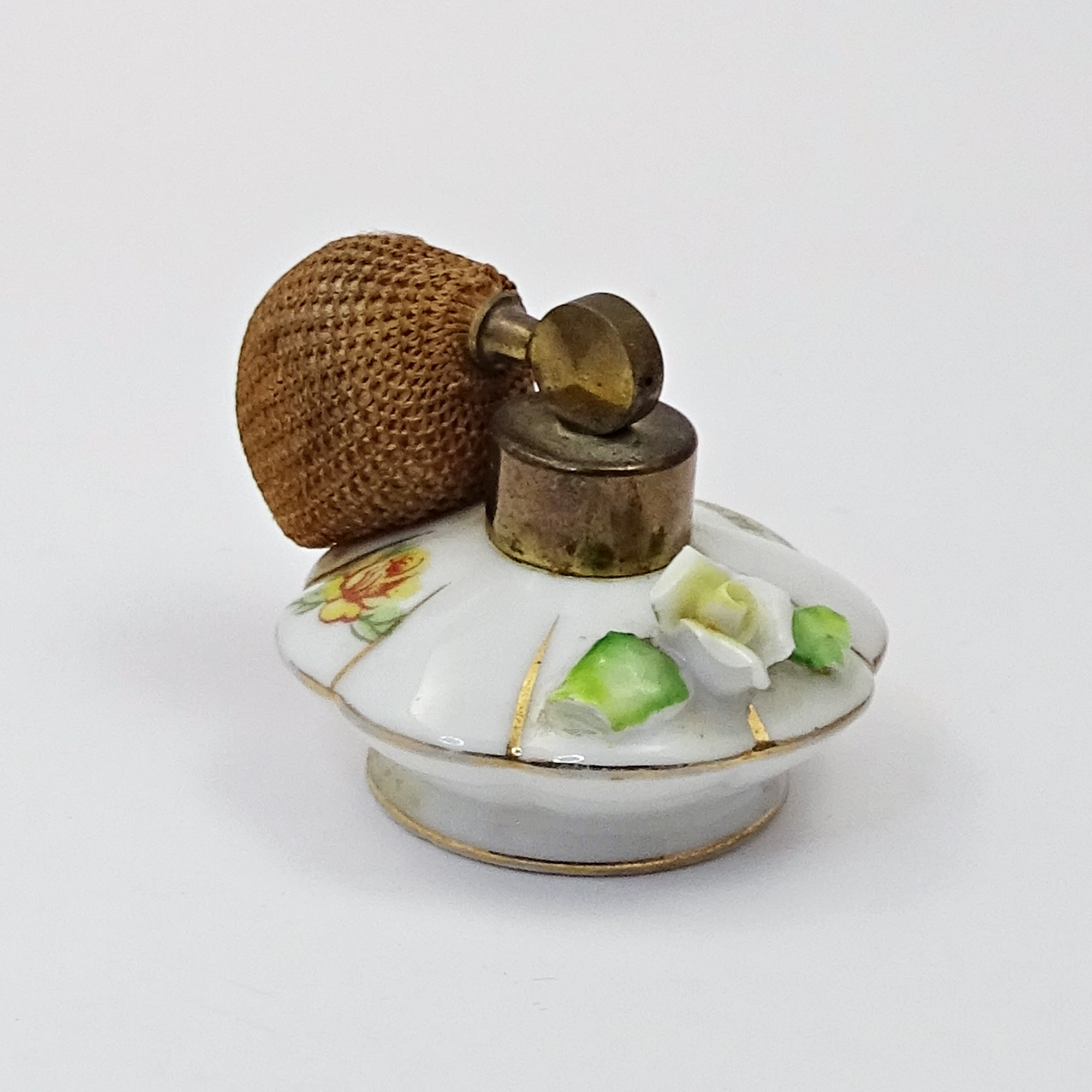Porcelain atomizer with encrusted roses. Metal hardware with original rubber and cotton bulb. On the bottom: “Genuine Porcelain”.