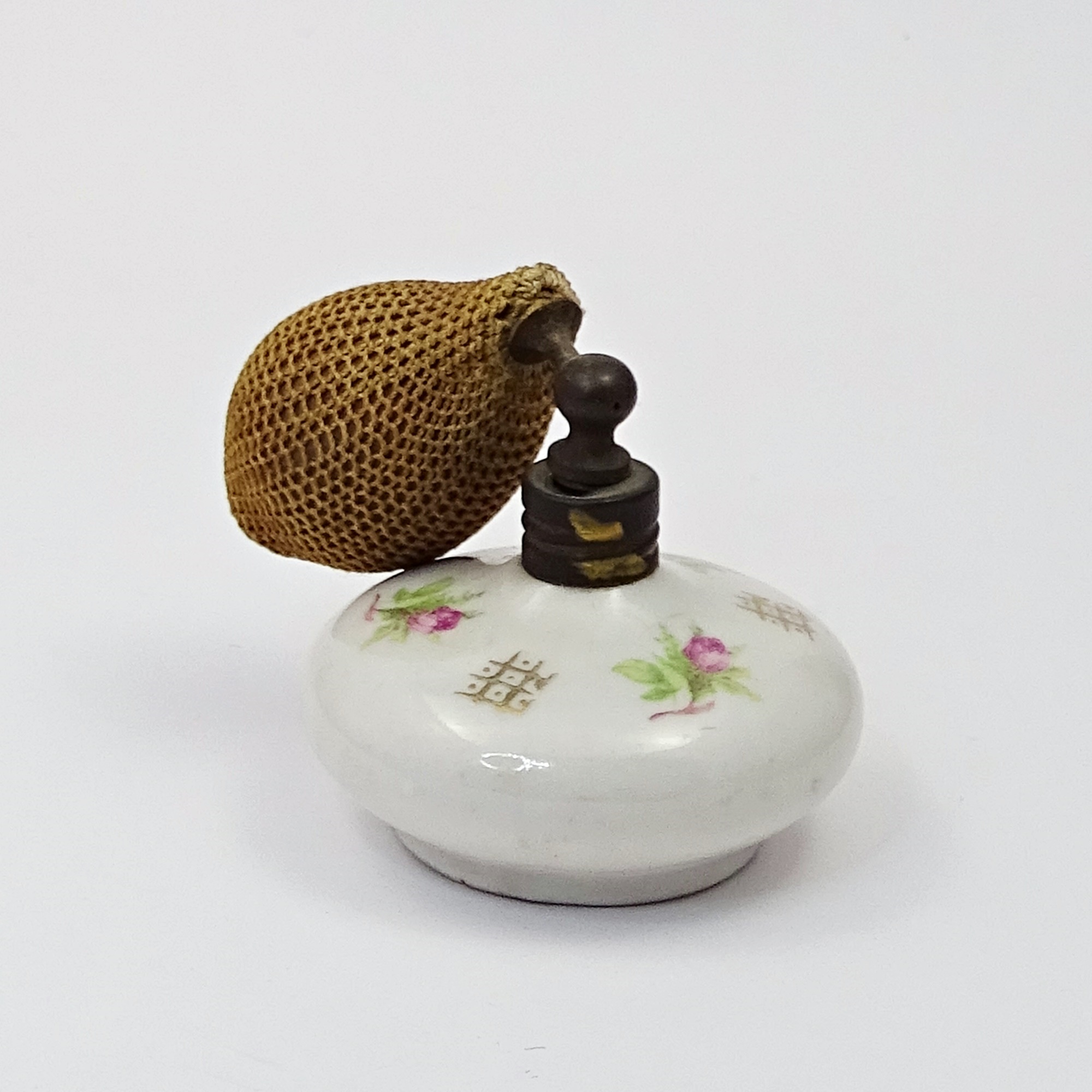 Home » Collection » Porcelain atomizer with rosebuds decals and little gold touches