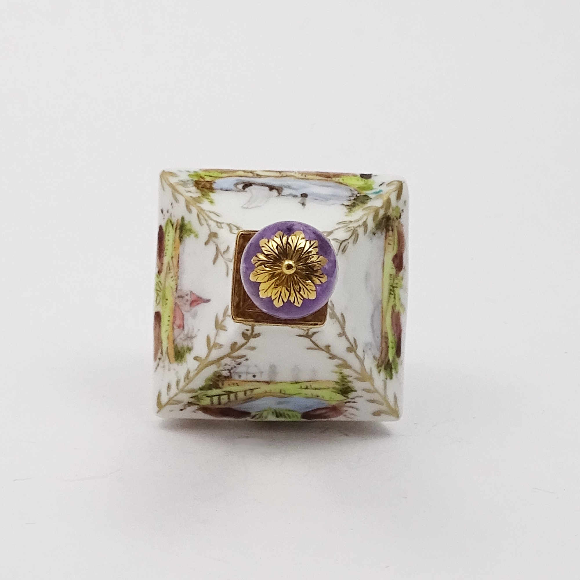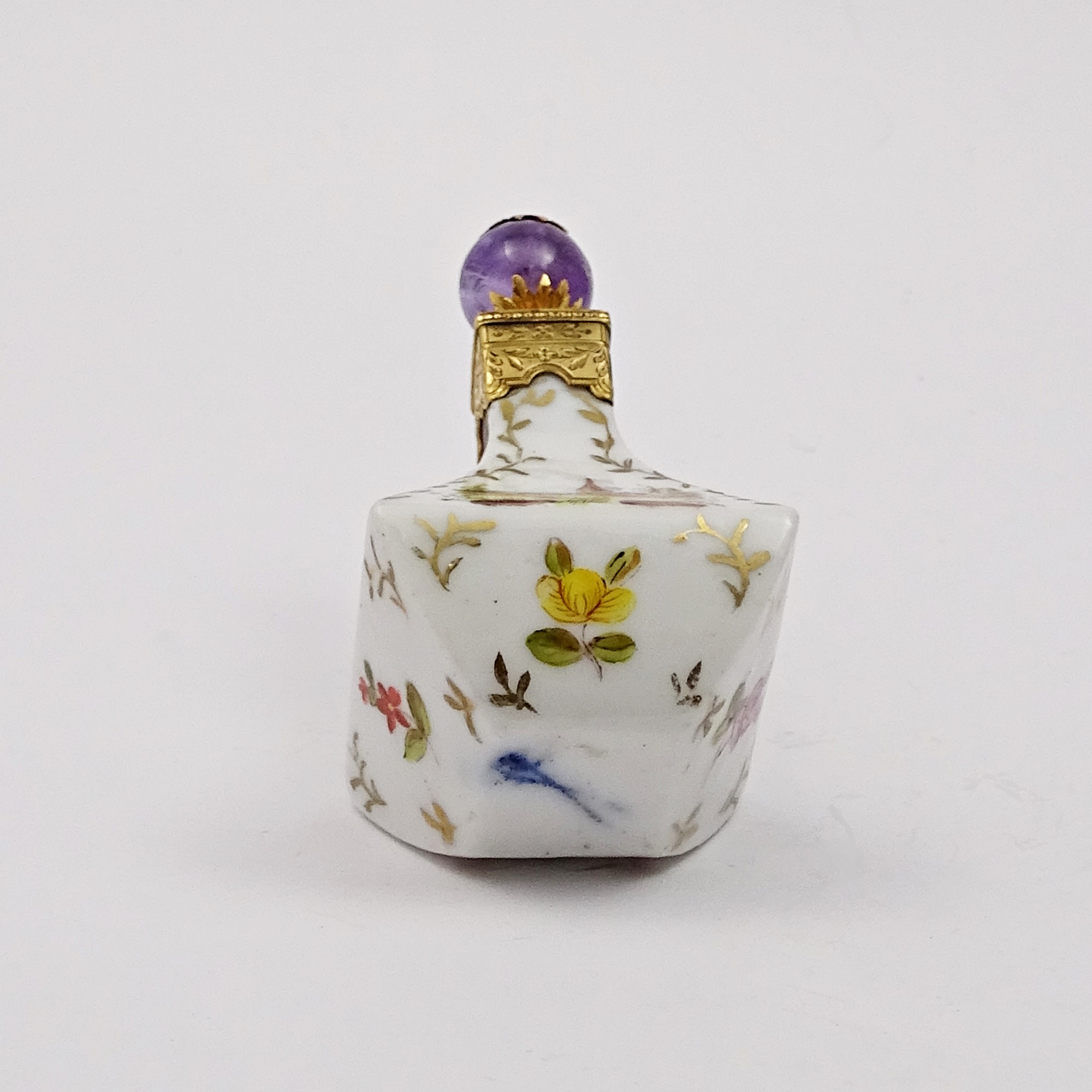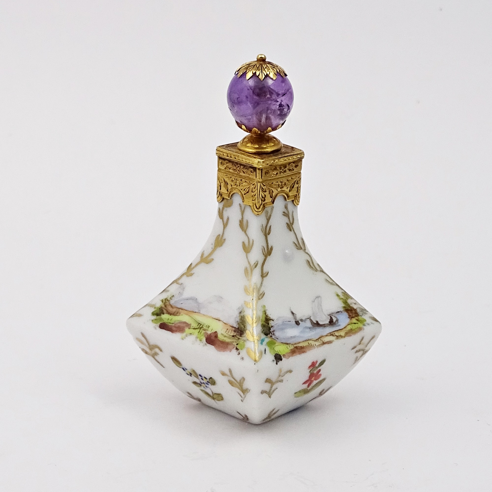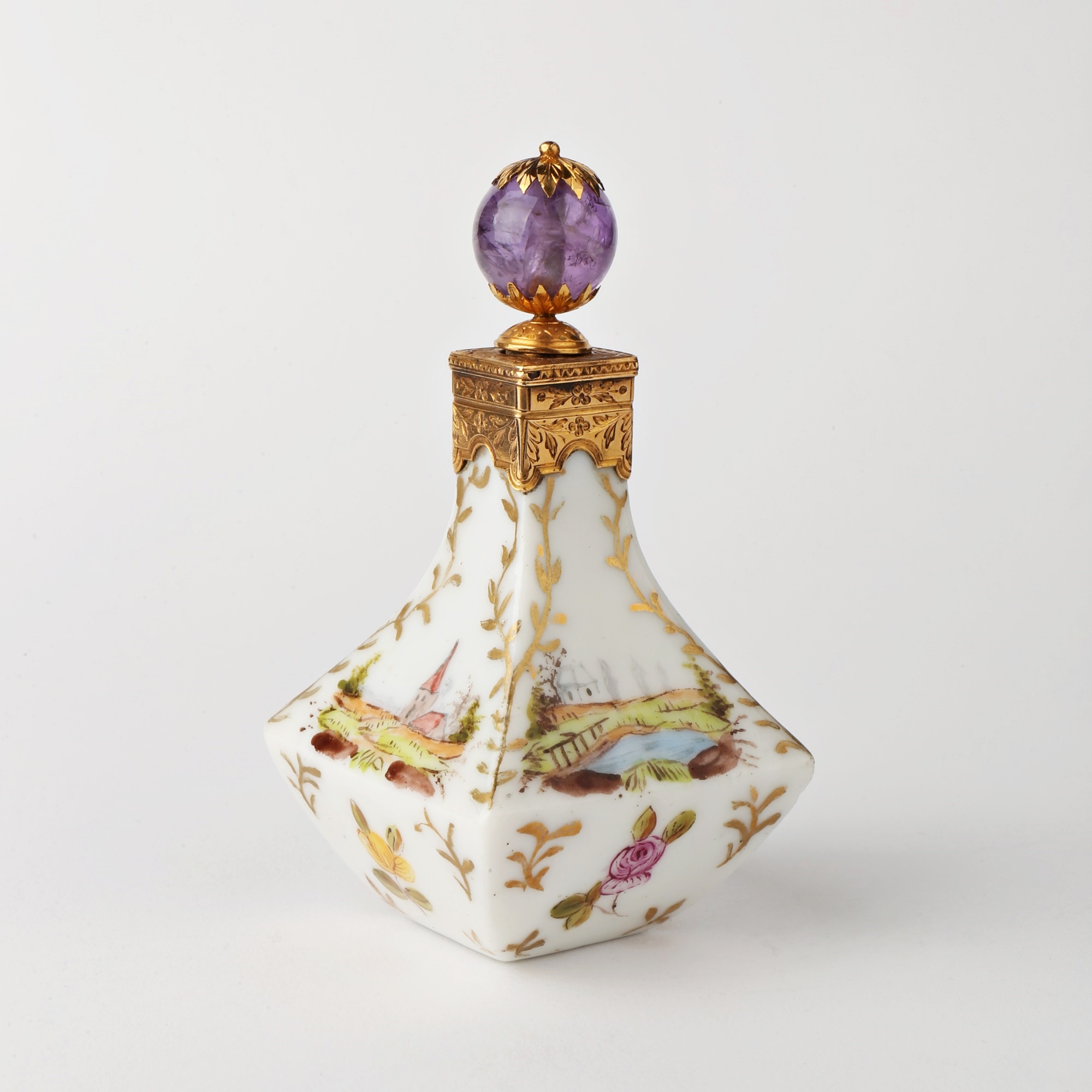 Hand-painted porcelain scent bottle, baluster-shaped. Each side has a different decor of a landscape and a flower. Red gold mount and the stopper ends in a real faceted amethyst. Blue mark for Meissen.