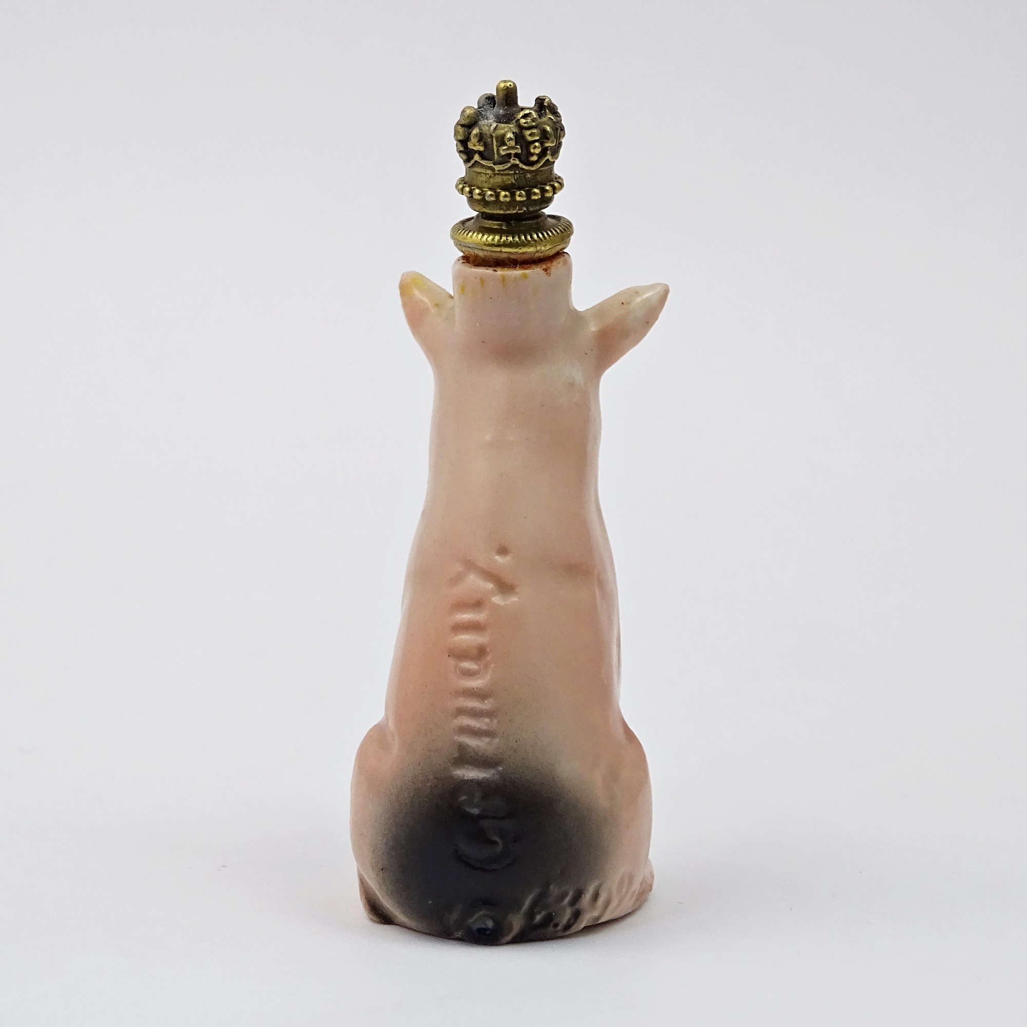Porcelain bottle depicting a sitting pig. The word Germany is engraved on the back Gilt metal crown top.