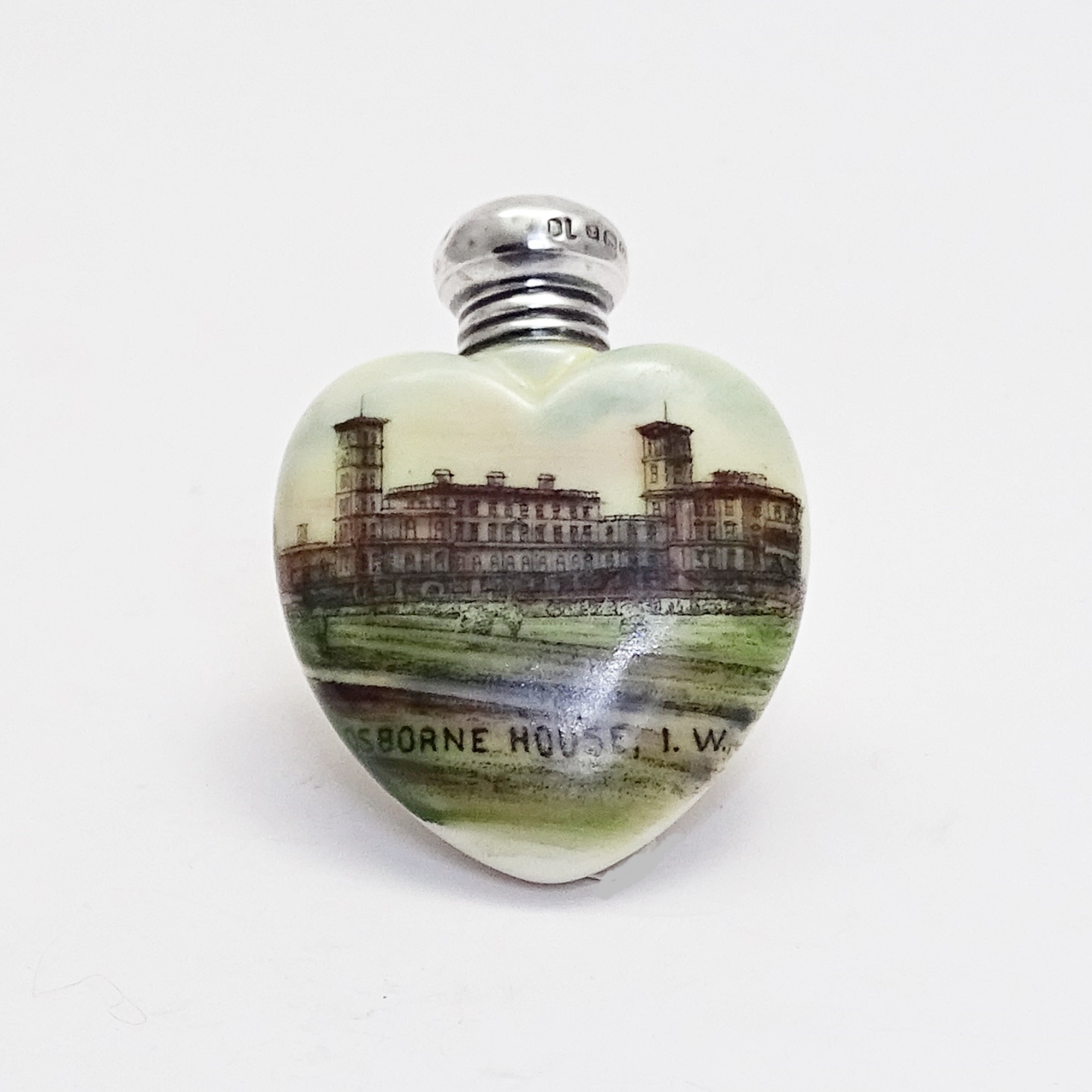 Heart-shaped scent bottle in porcelain, showing a decal of a building and the words “Osborne House I.W.”. Srew silver cap hallmarked for Birmingham, 1912, DL for David Loebl, silversmith.
