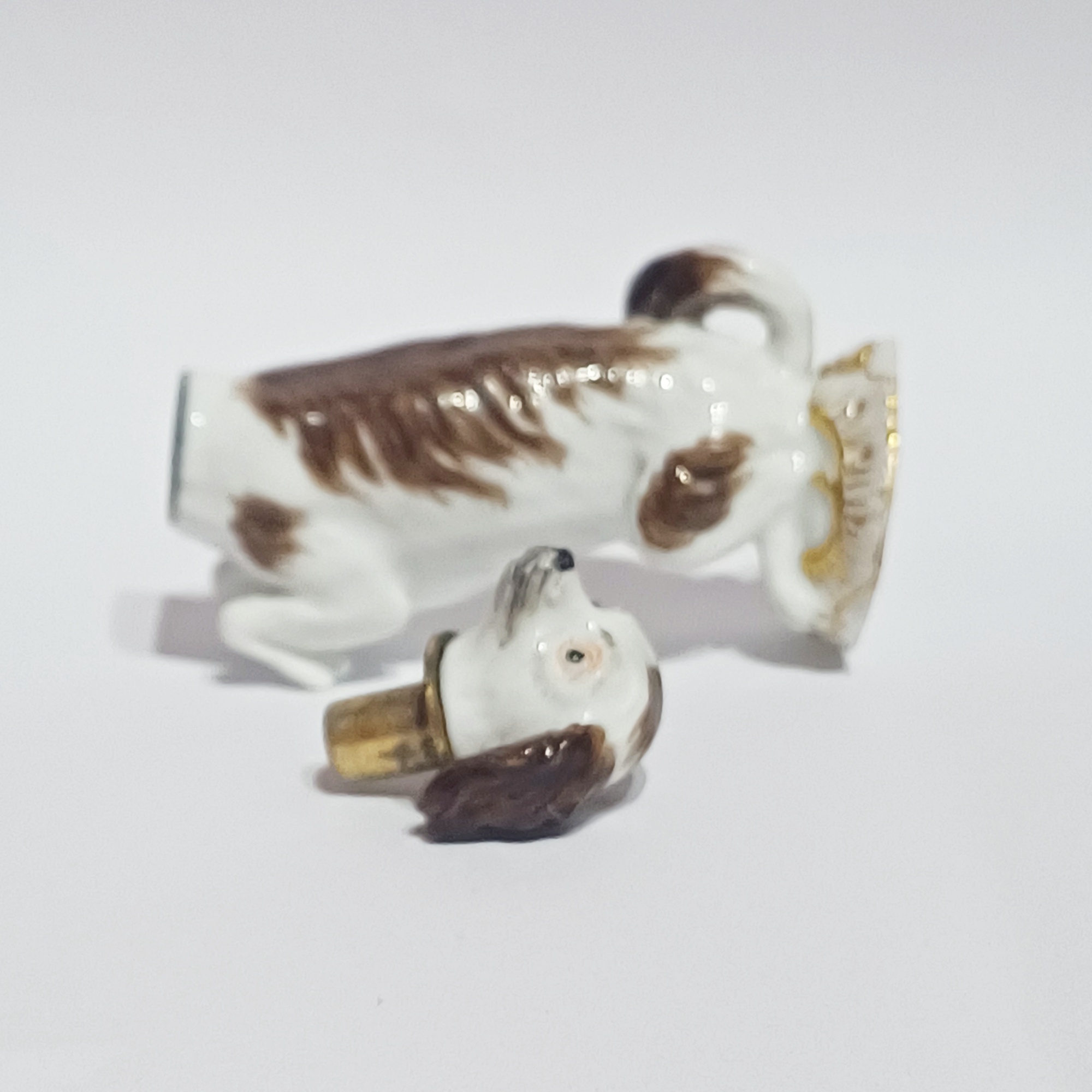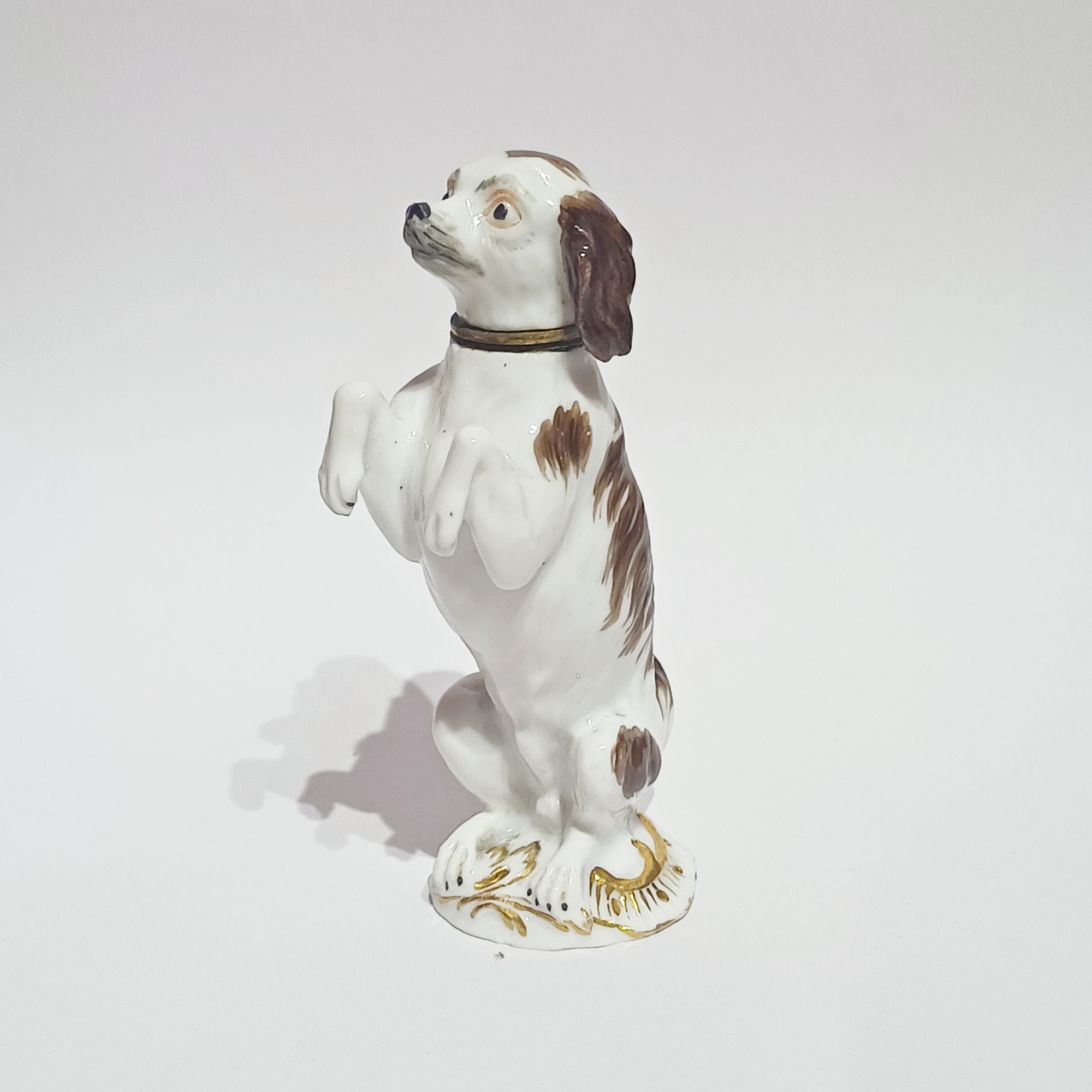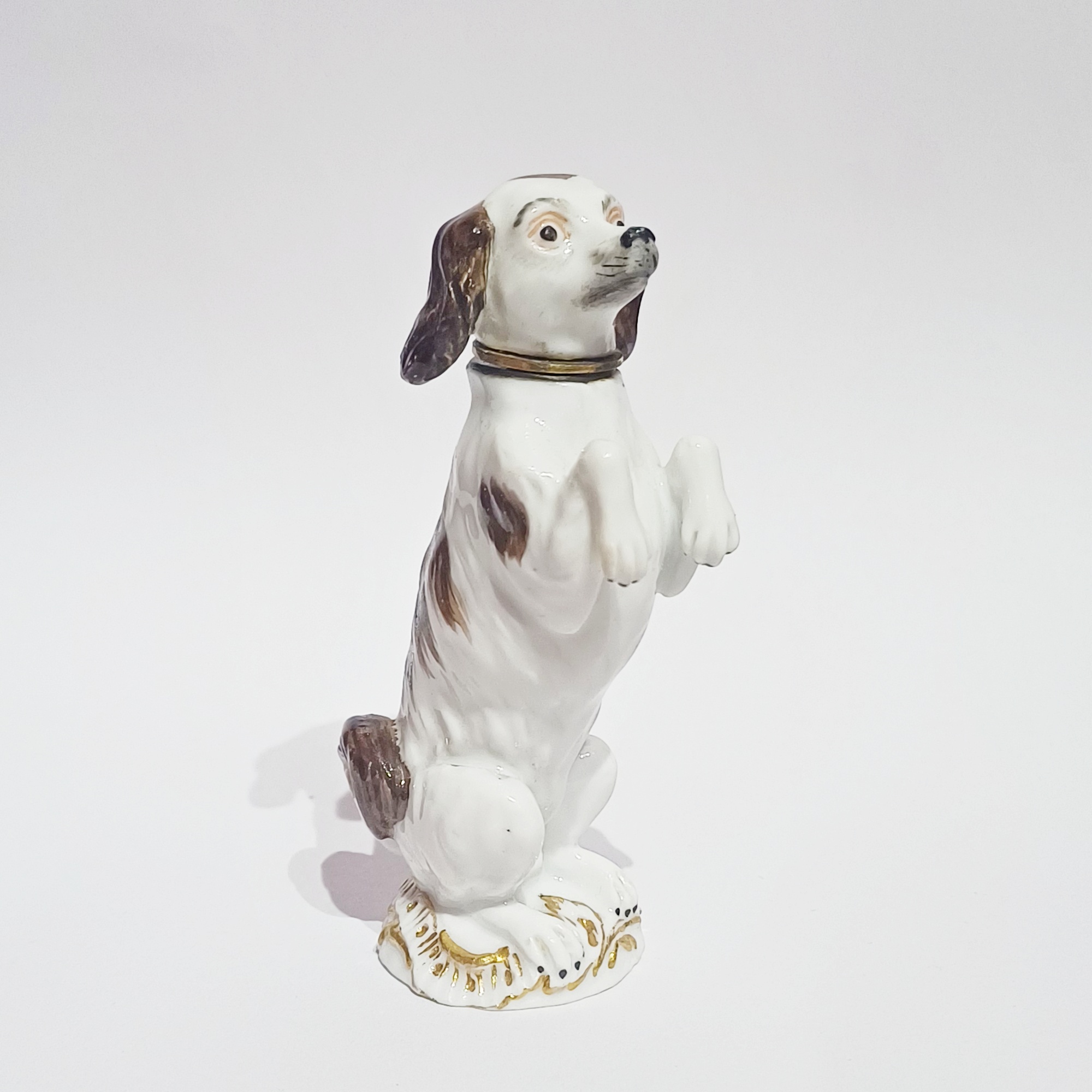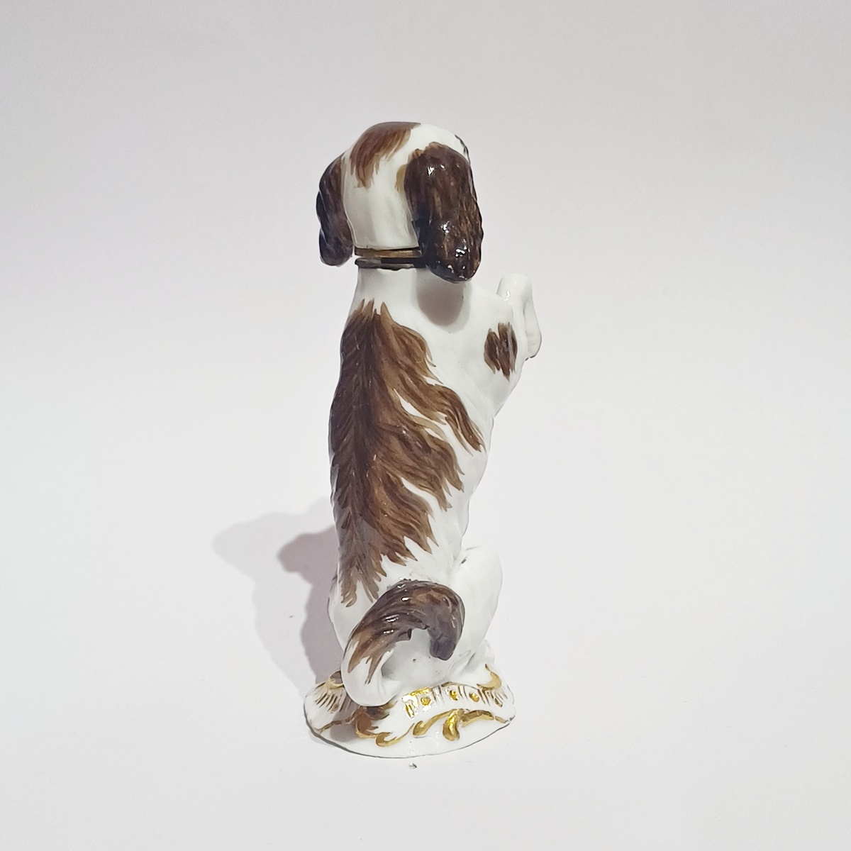 Porcelain scent bottle depicting a Bolognese dog standing on a rocaille relief, partially gold-painted plinth, standing on its hind legs, both front paws raised, after a design by Johann Joachim Kaendler around 1750. Underglaze blue sword mark Meissen on the bottom.