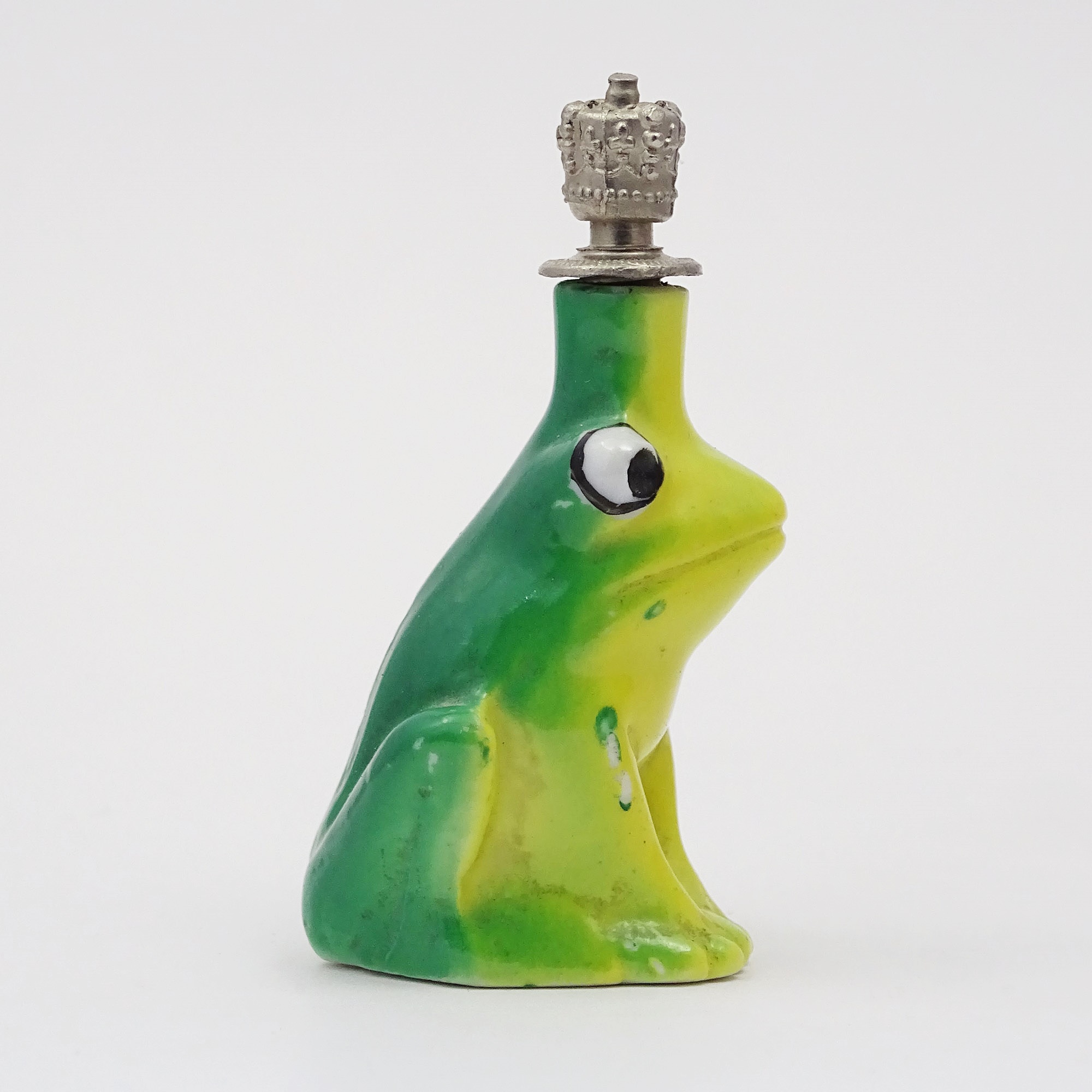 Porcelain scent bottle depicting a frog. Metal crown top.