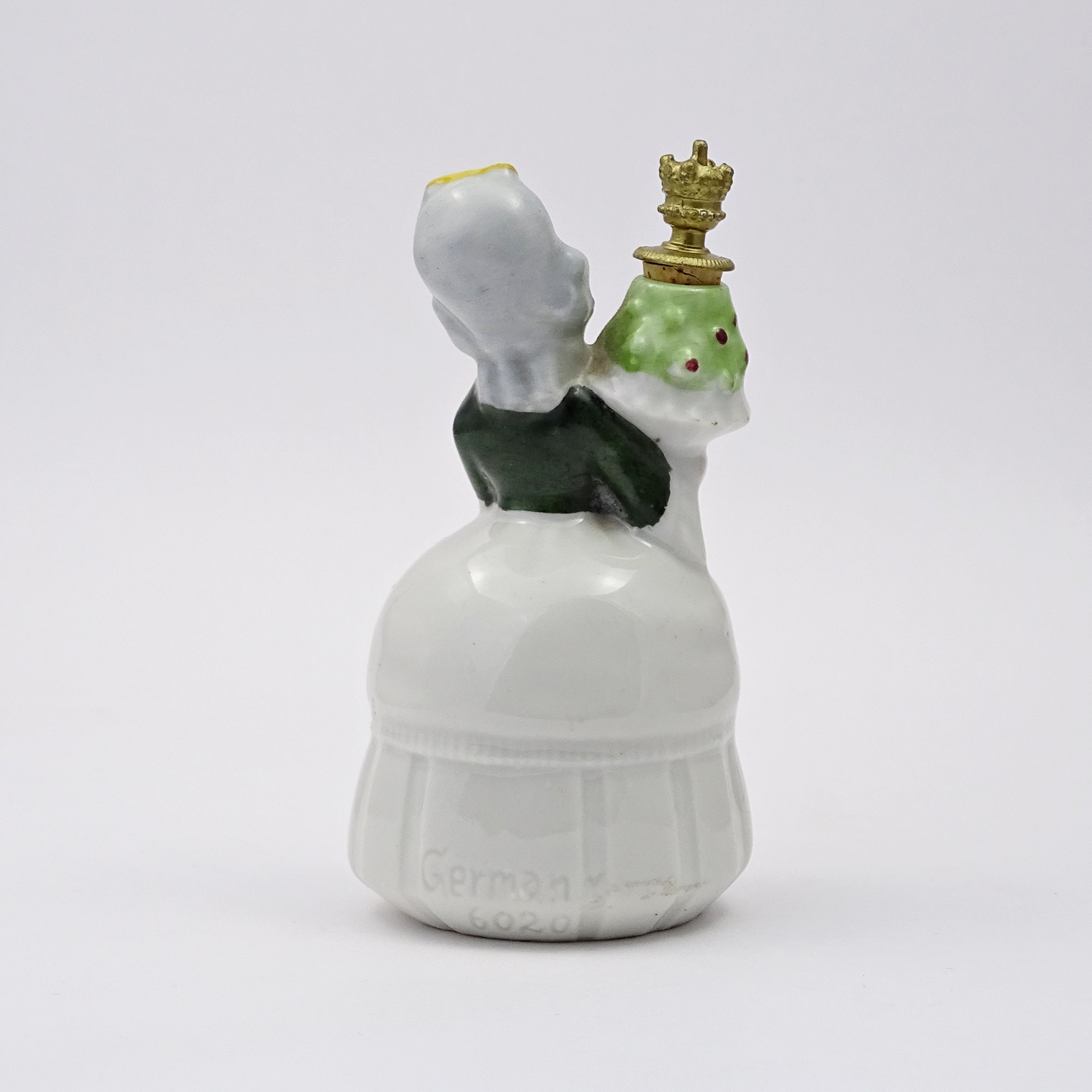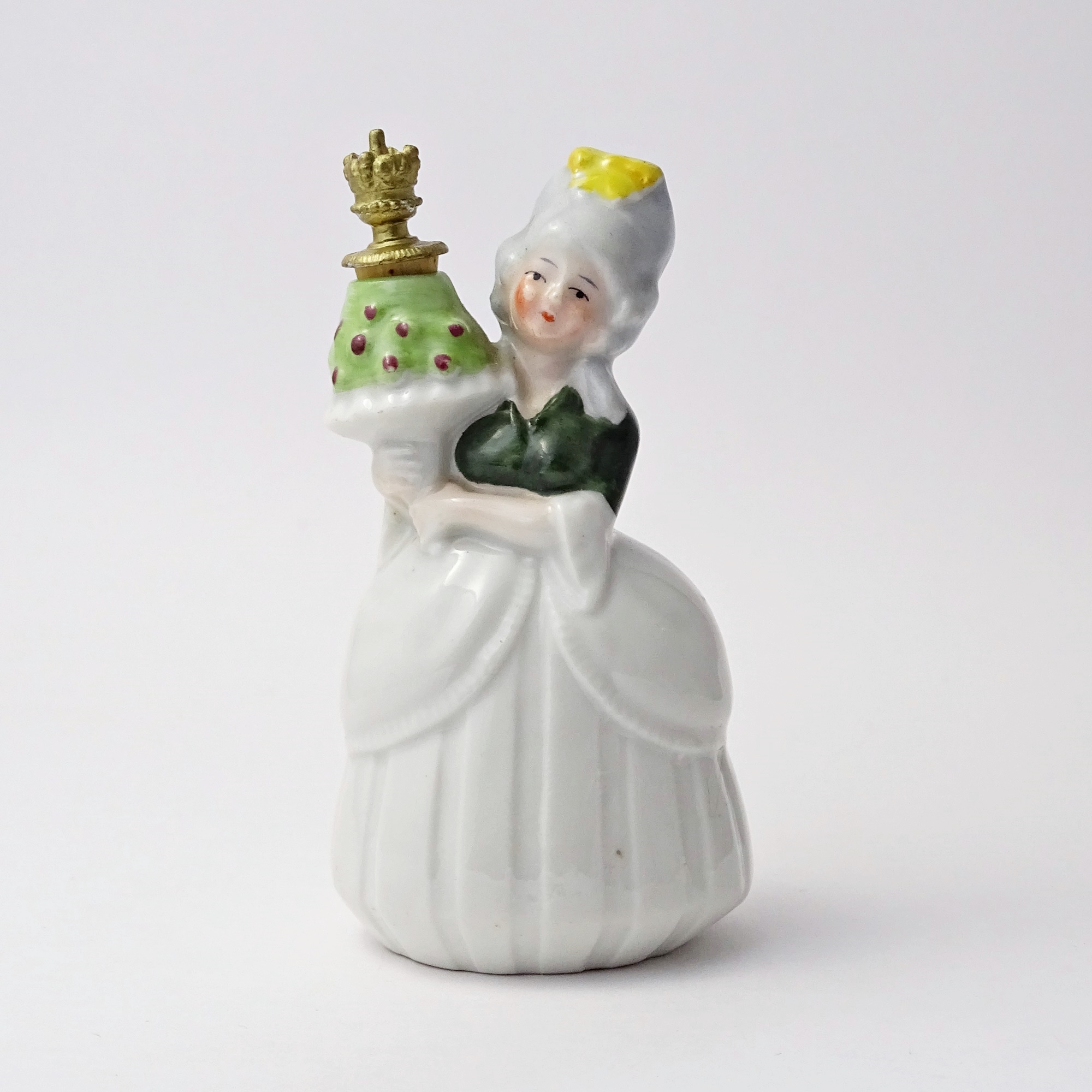 Porcelain scent bottle depicting a lady in elegant gown and white wig holding a floral urn. Gilt metal crown top. The number 6020 and the word Germany are carved on the bottom. By Heinz & Company.