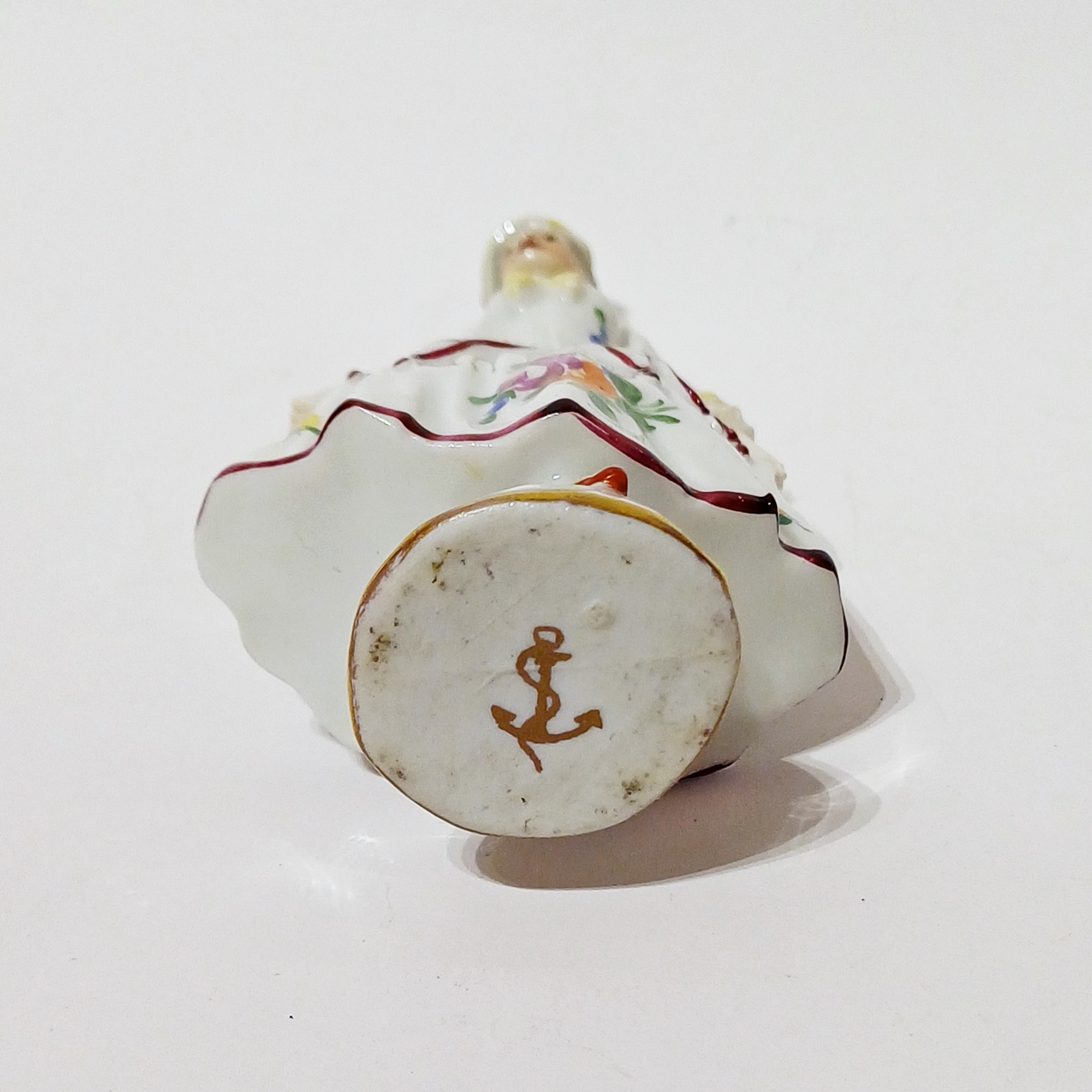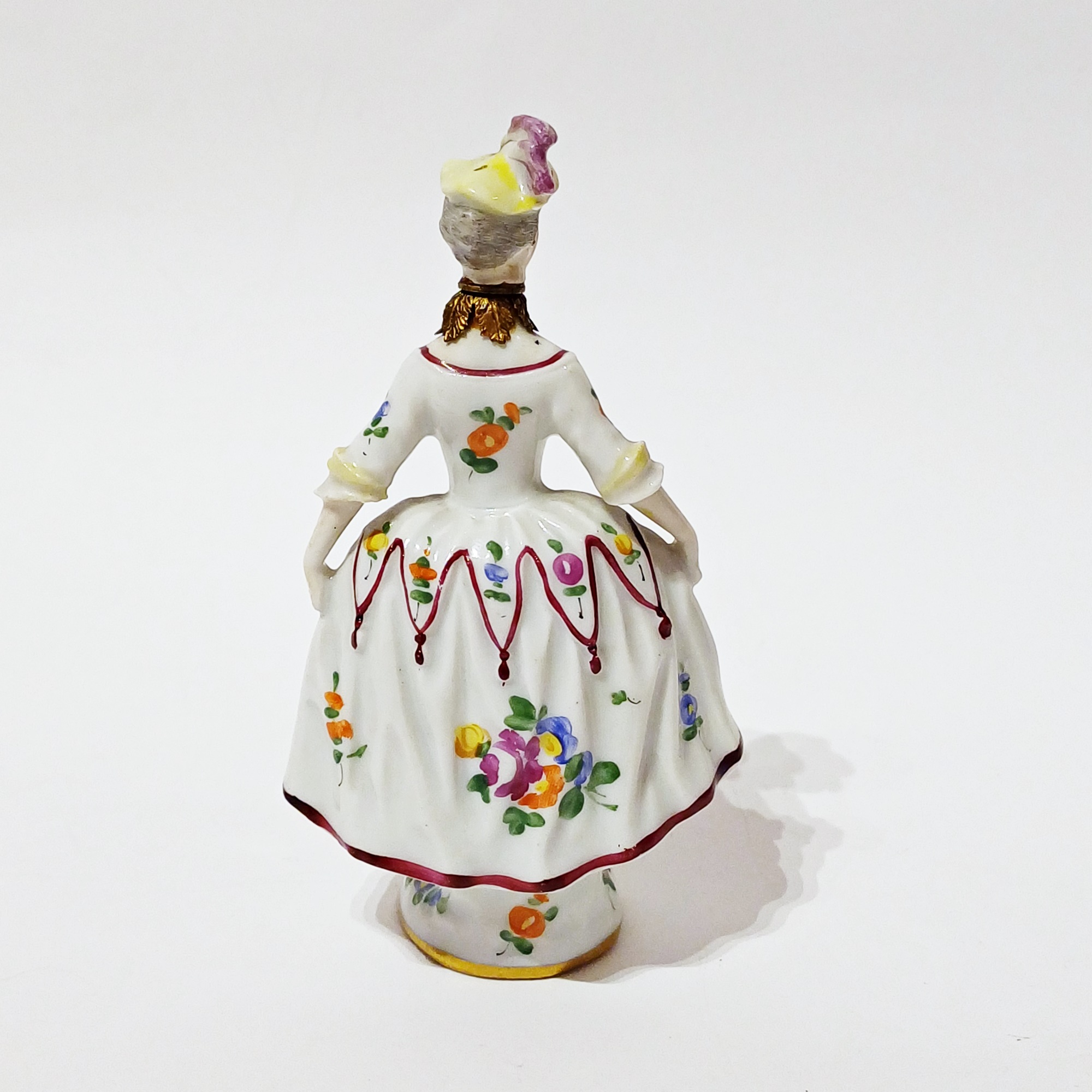 Porcelain scent bottle depicting a lady, in white gown and yellow hat. Probably she represents Columbine, a character from the Commedia dell’Arte. The head with metal mount is the stopper. Gold anchor mark for Chelsea, 1750-1769.
