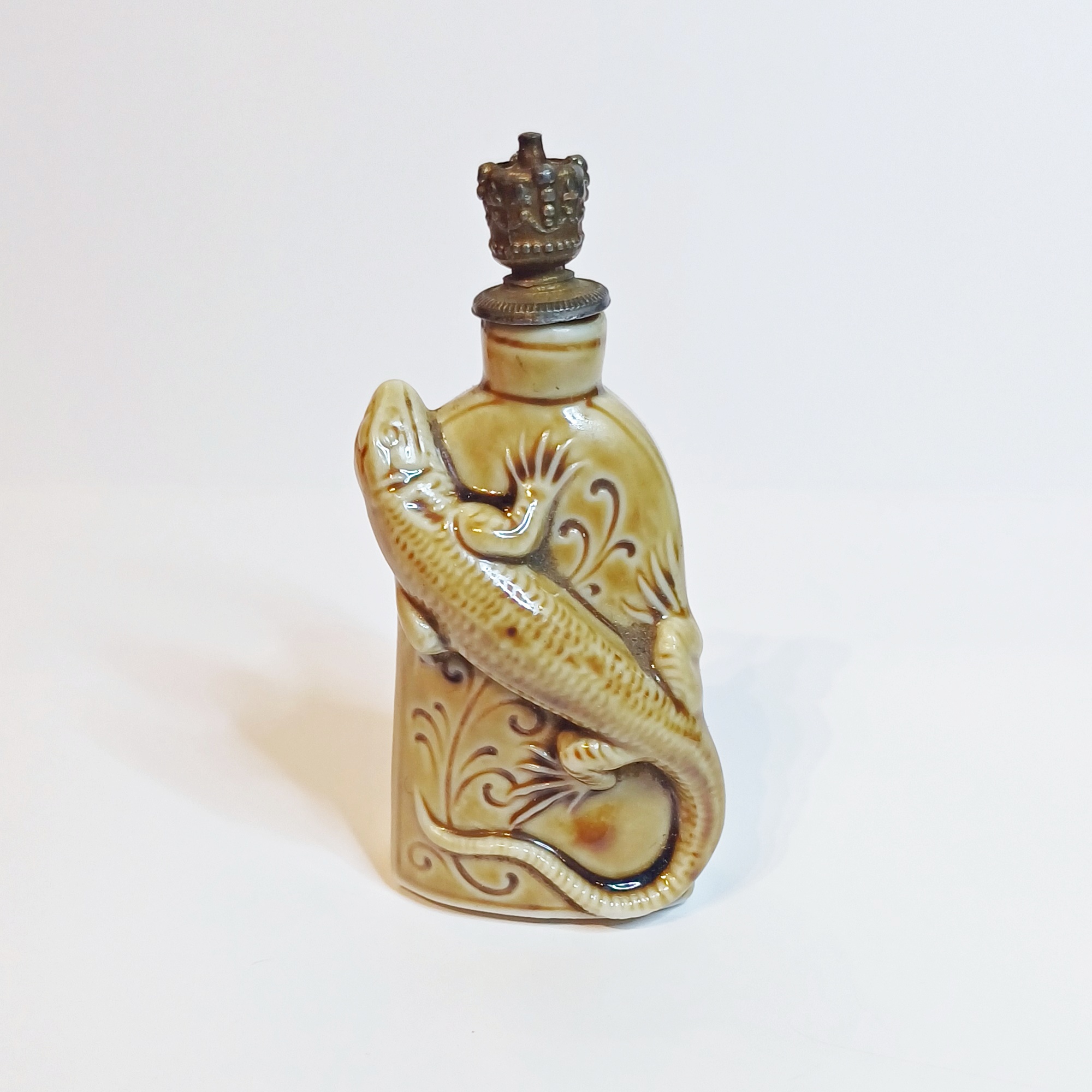 Monochrome porcelain scent bottle depicting a lizard on a rock. Metal crown top.