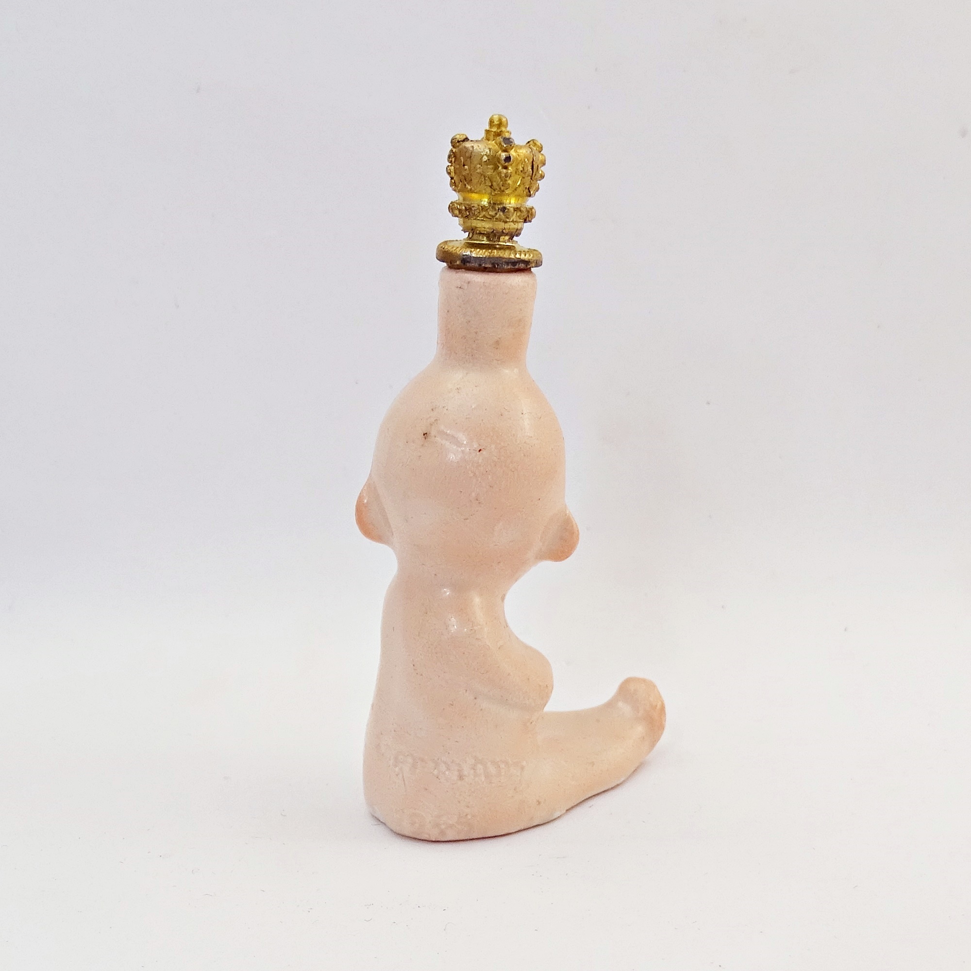 Porcelain scent bottle depicting a sitting Kewpie doll. Gilt metal crown top. These models are attributed to the Heinz porcelain factory.