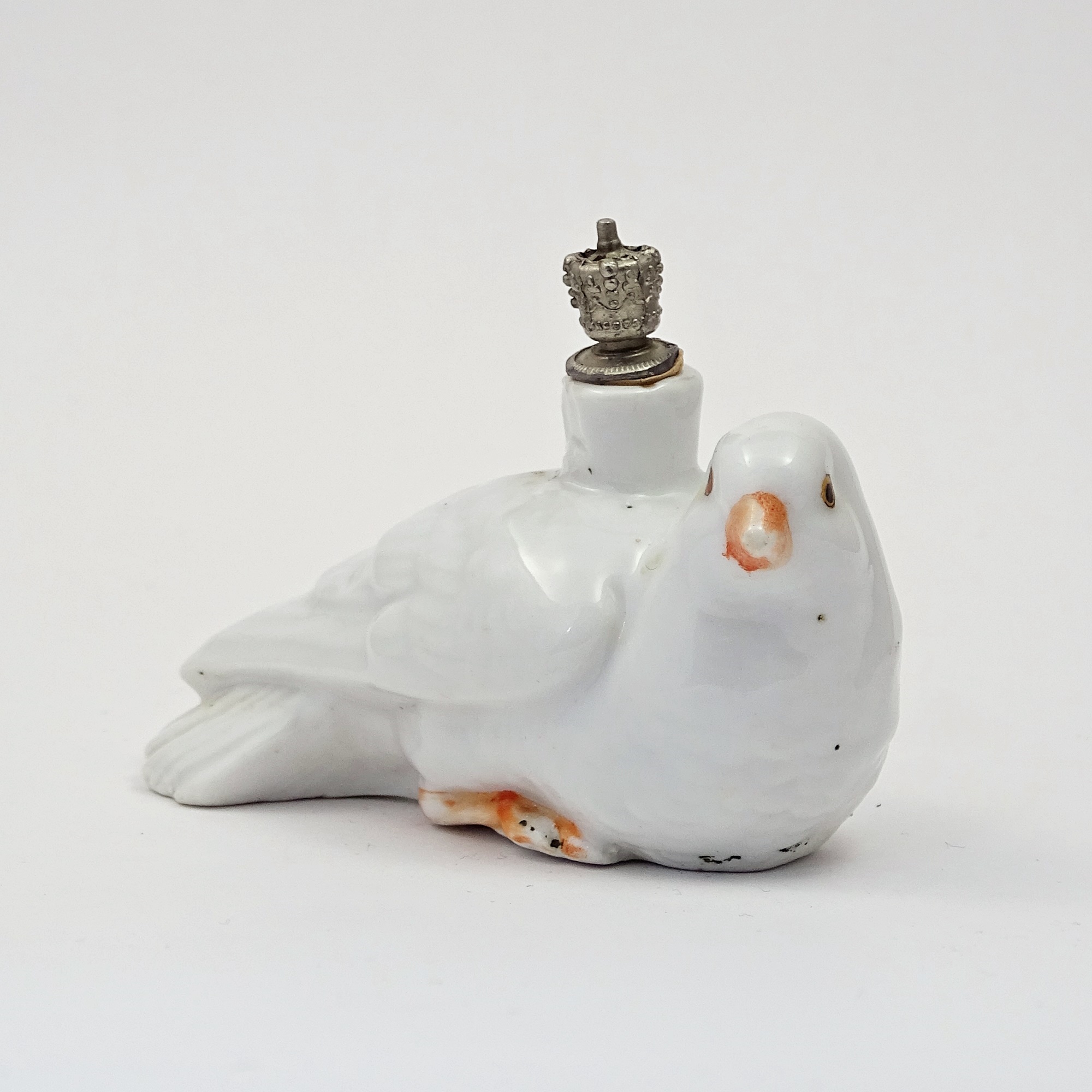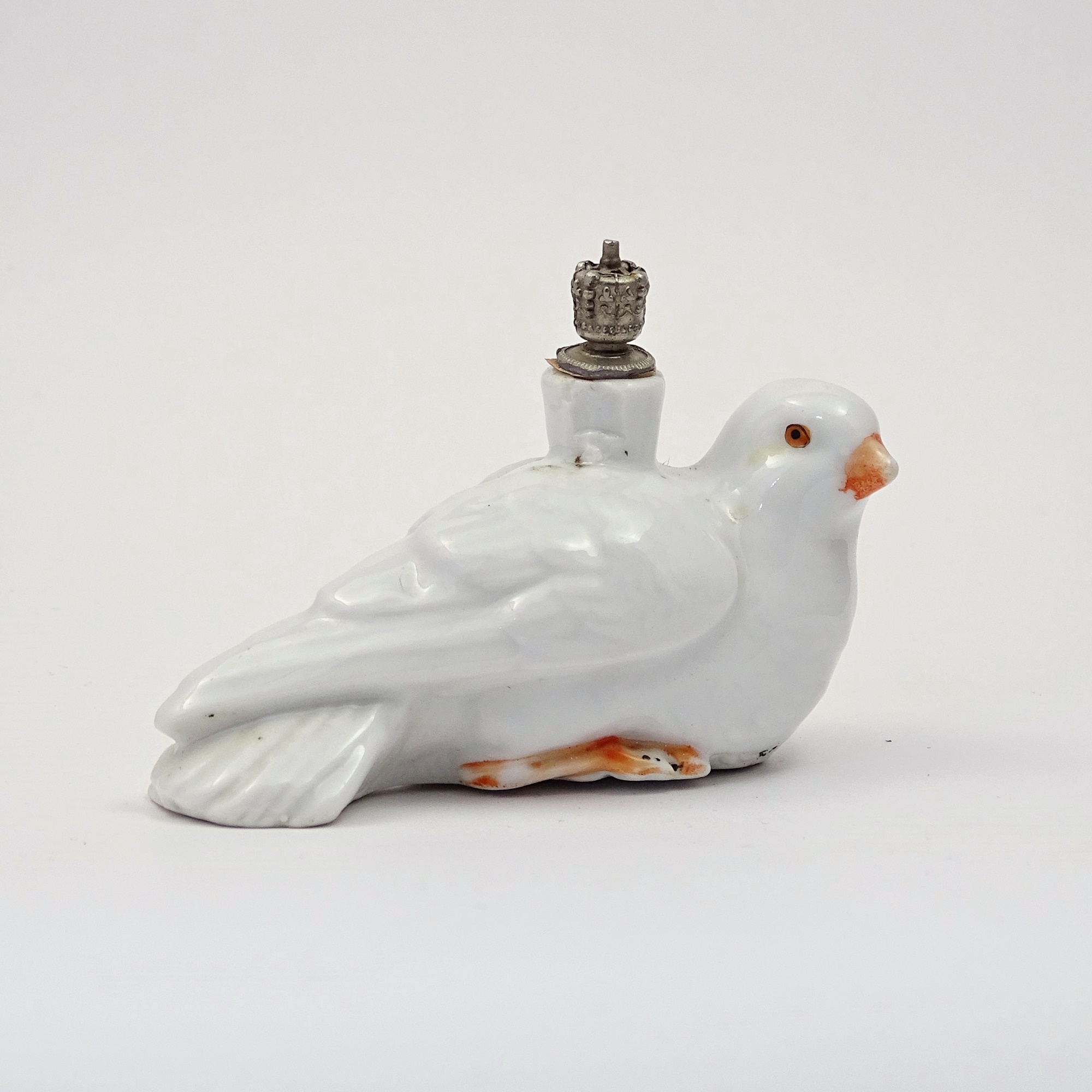 Porcelain scent bottle depicting a white dove. Metal crown top.