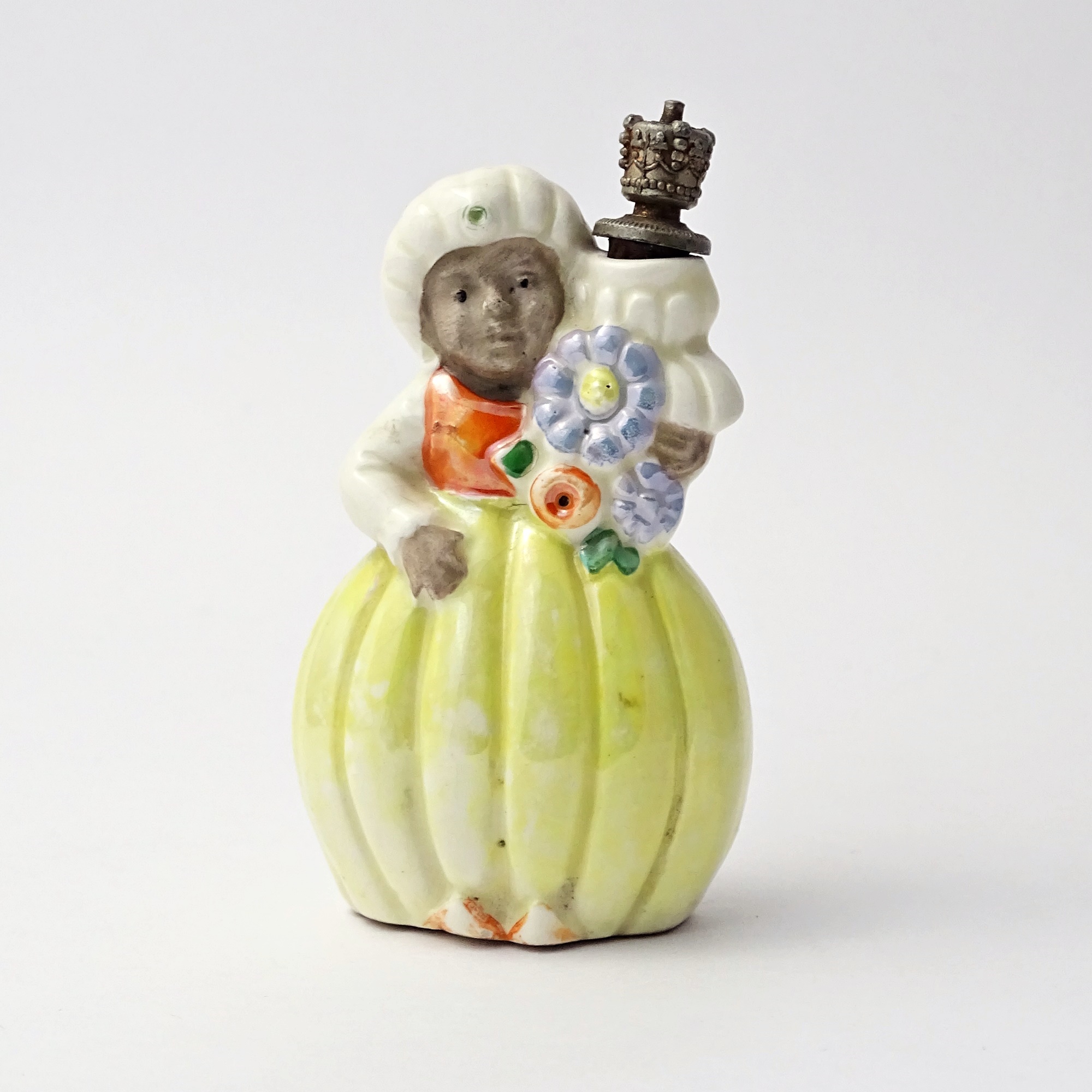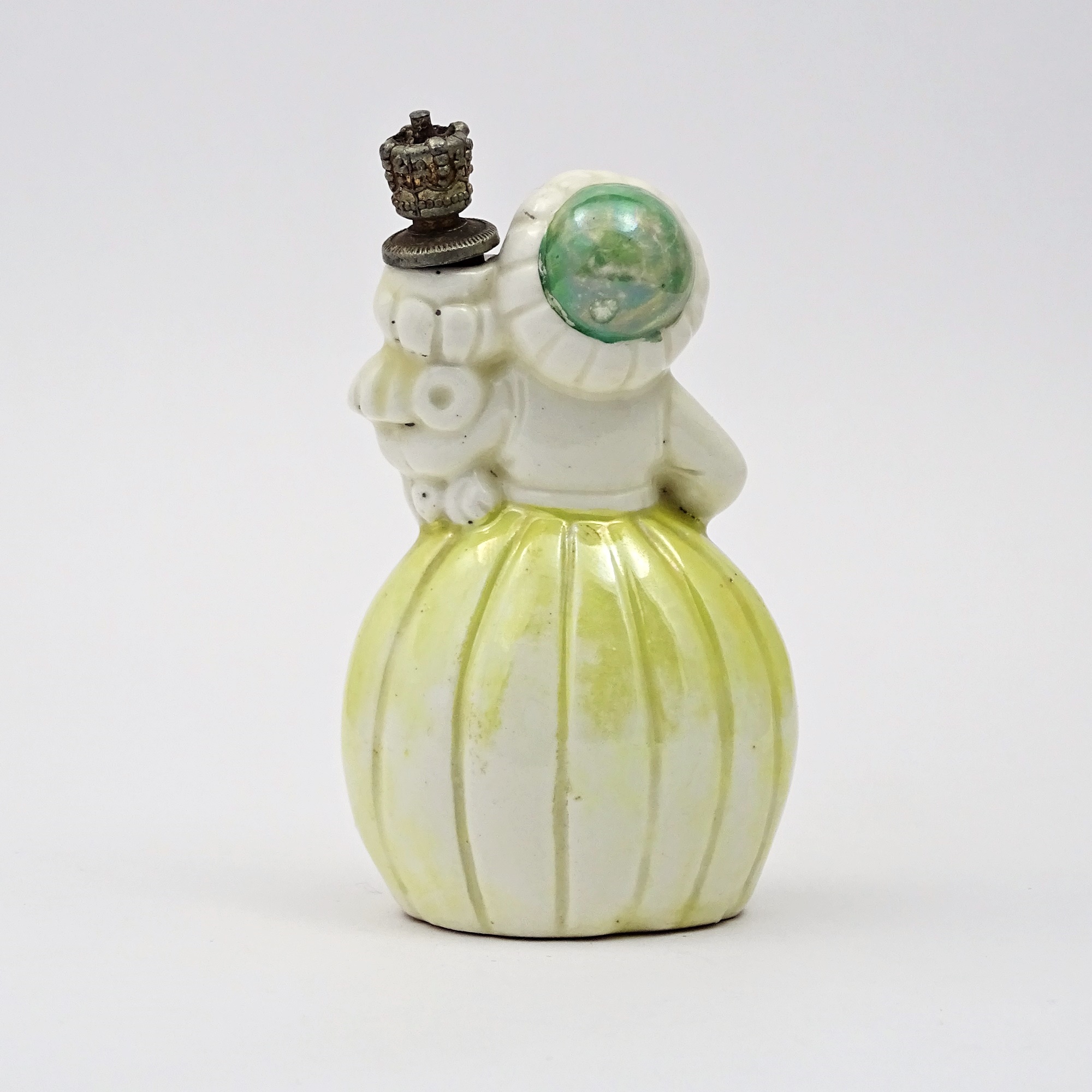 Pottery scent bottle depicting an Arab lady holding some flowers and a white decorated vase. She wears a white turban with a little pearl. Metal crown top.
