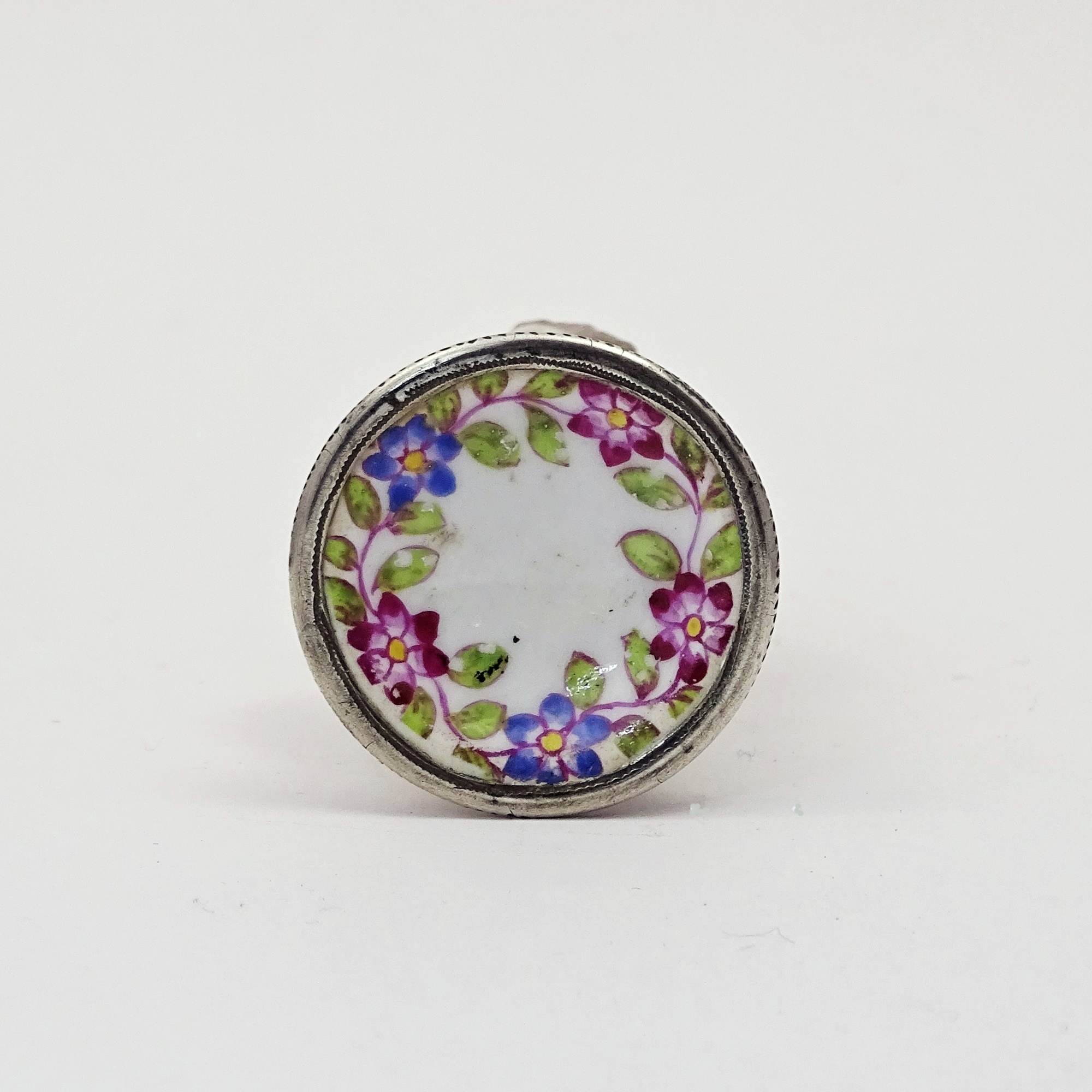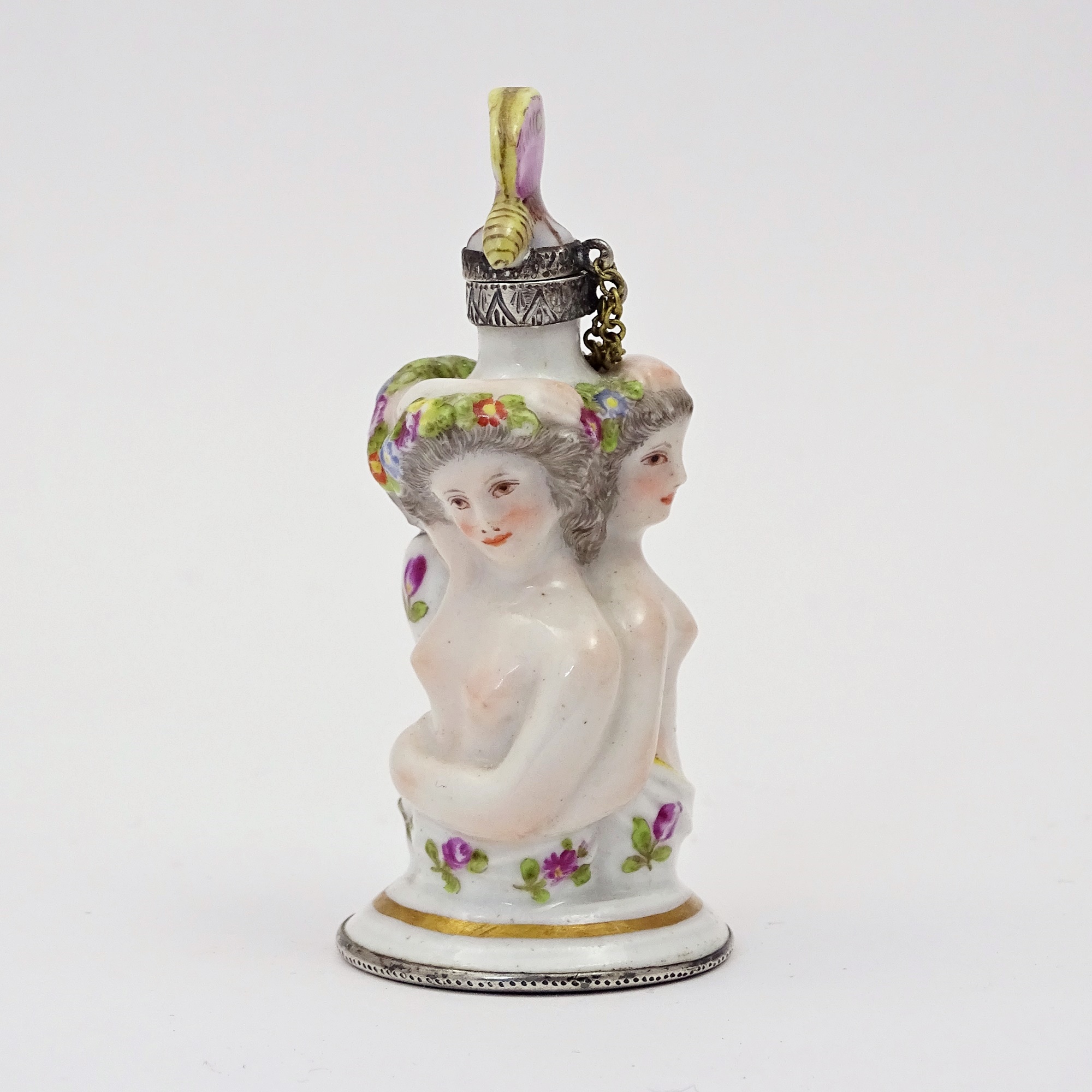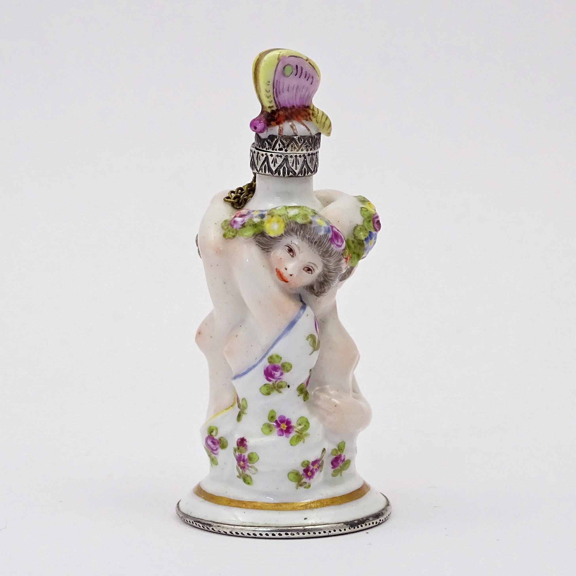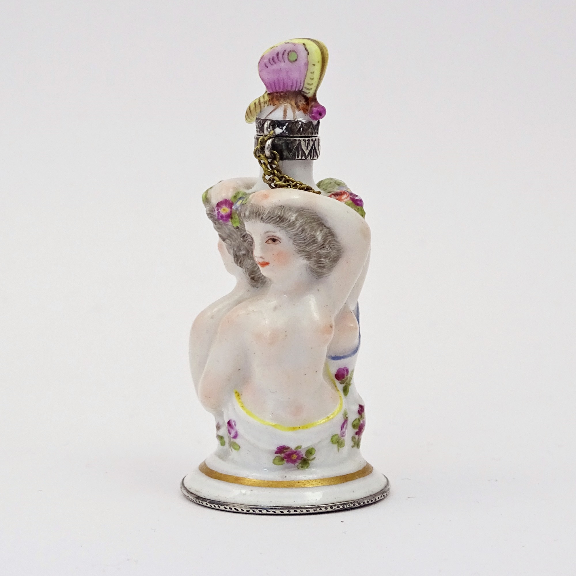 Porcelain scent bottle depicting the Three Graces. Silver mount linked to a porcelain stopper shaped as a butterfly with a short chain. Under the silver rimmed base, a decor of leaves and roses. No visible mark. Possibly by Chelsea.