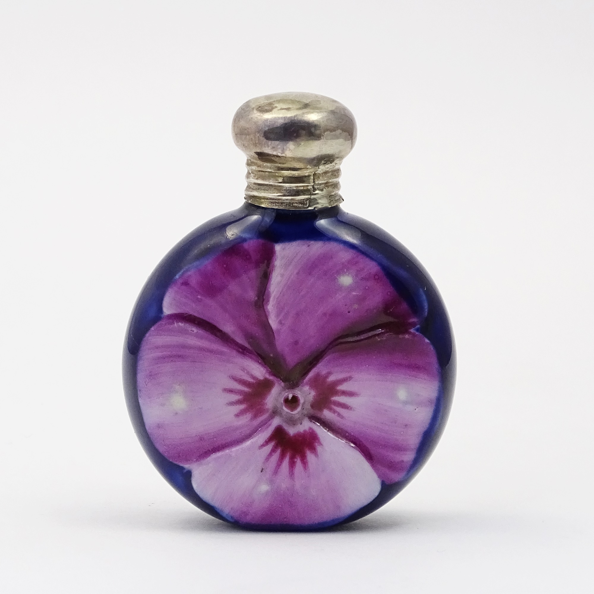 Moorcroft style porcelain scent bottle in a form of two pansies of different colour. Hallmarked for Birmingham, 1905. Illegible silversmith mark, it he should be for Charles Rowley & Co. silvrsmith.