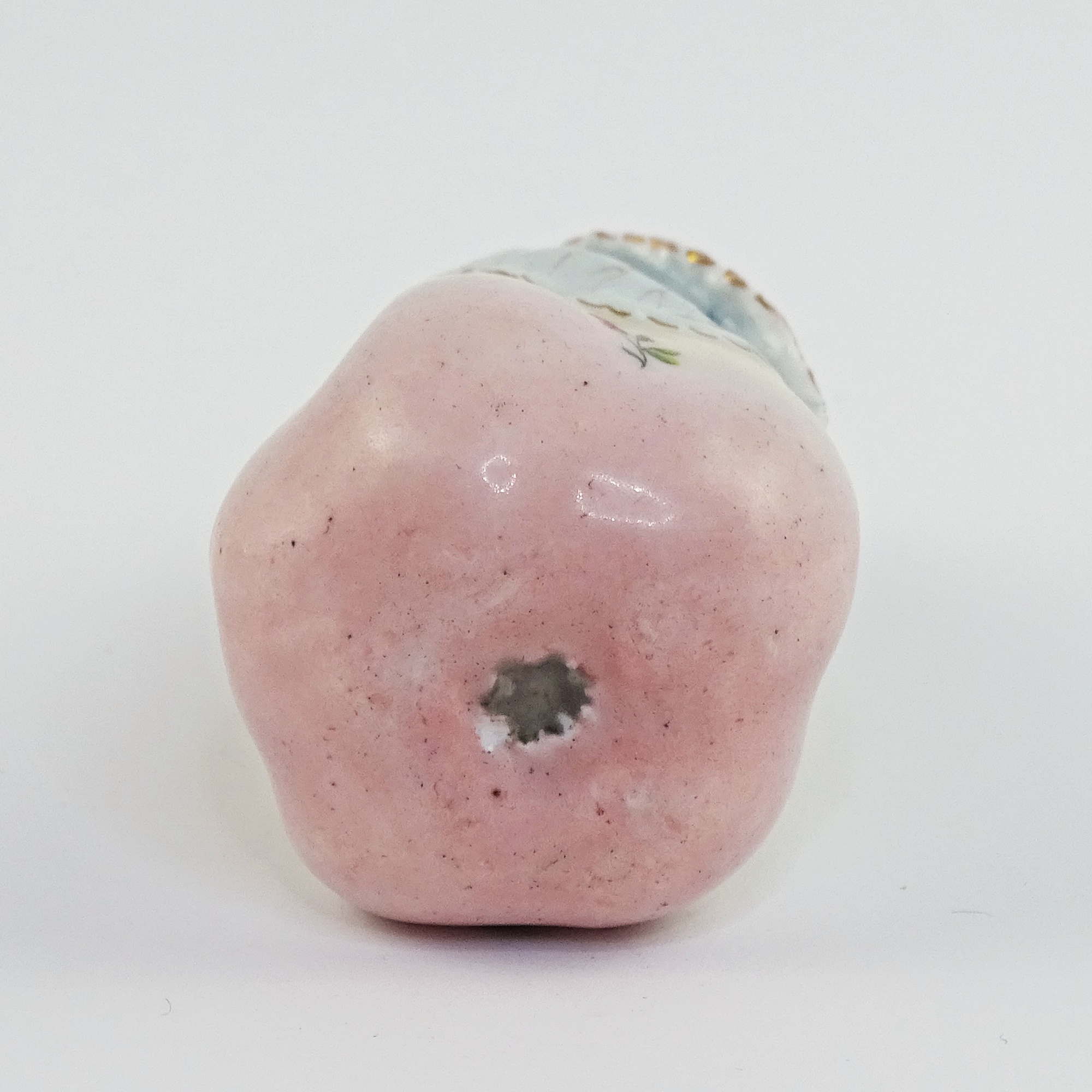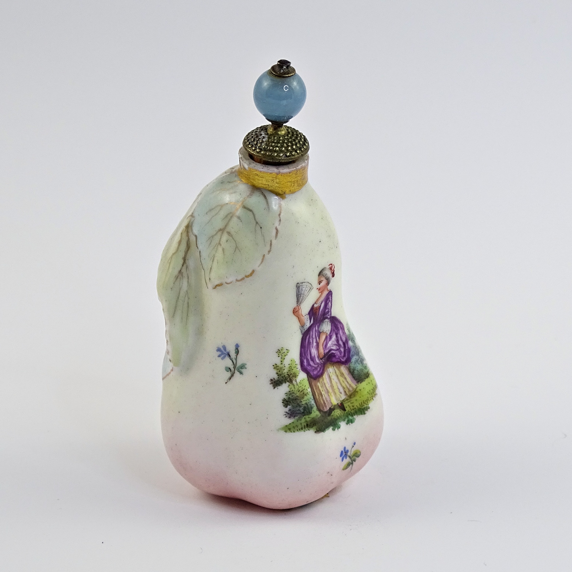 Porcelain scent bottle in the form of a pear, shaded ground cream to pink, the leaves picked out in blue, painted a figure of a girl in hee 17th century gown.