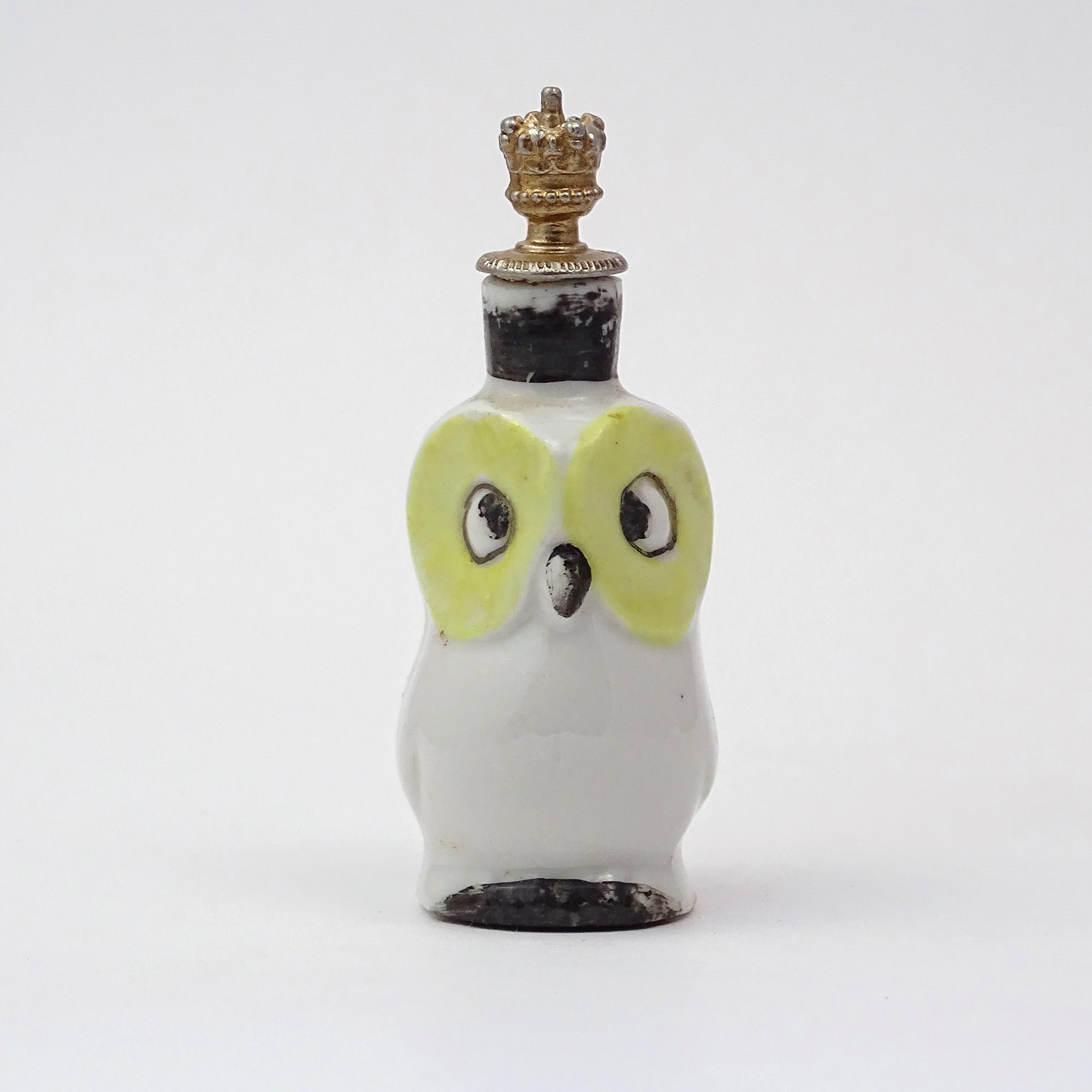 Porcelain scent bottle representing a coquette. Gilt metal crown top.