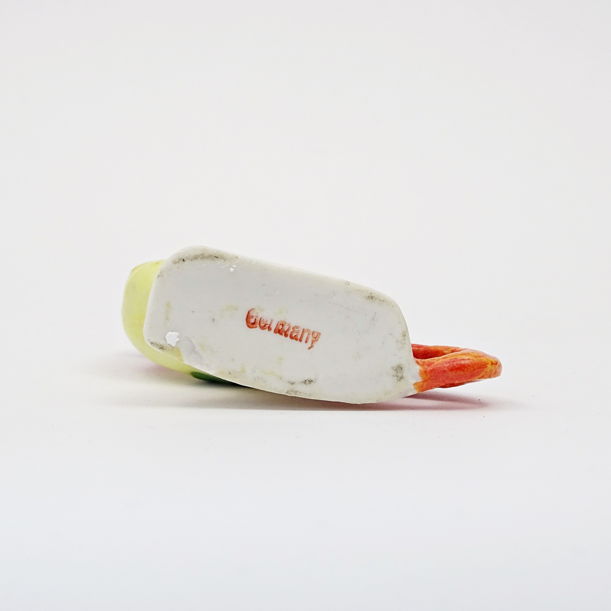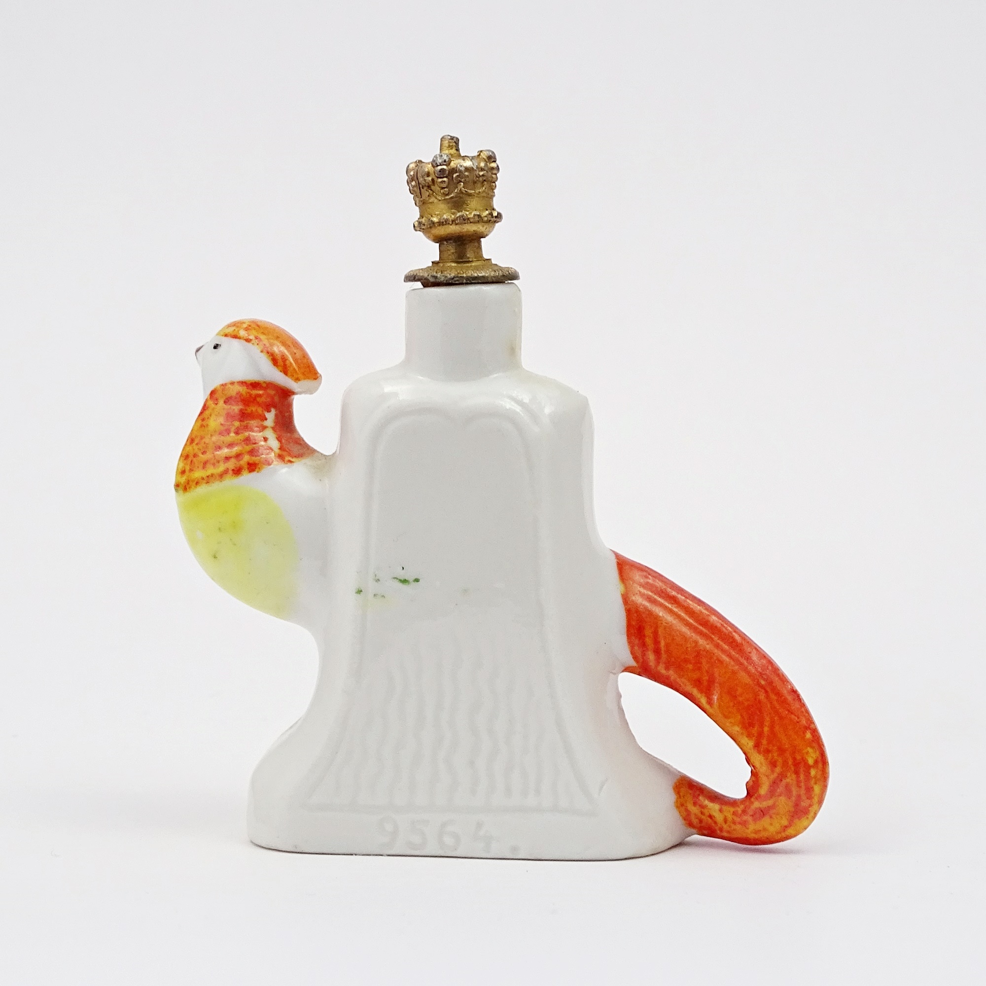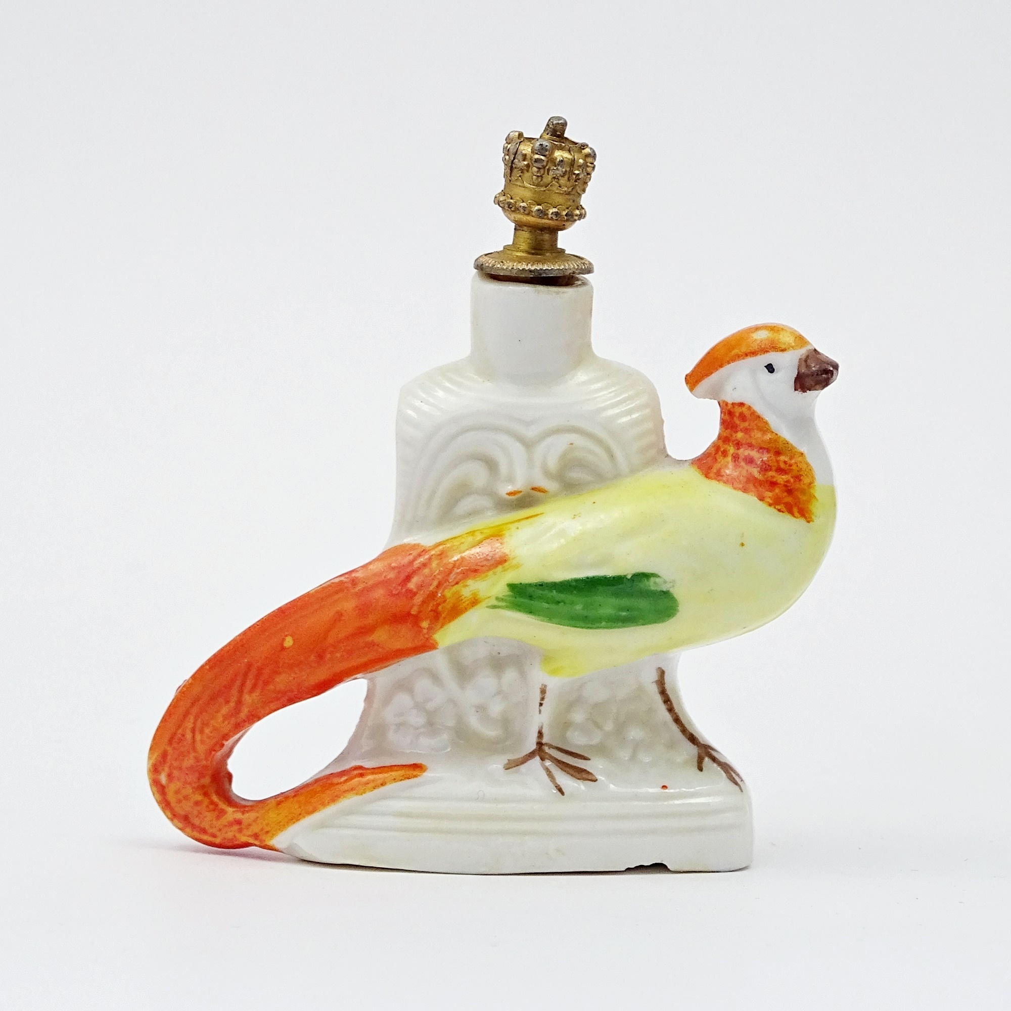 Porcelain scent bottle representing a pheasant. Gilded metal crown top. Model No. 9564 by Heinz & Company