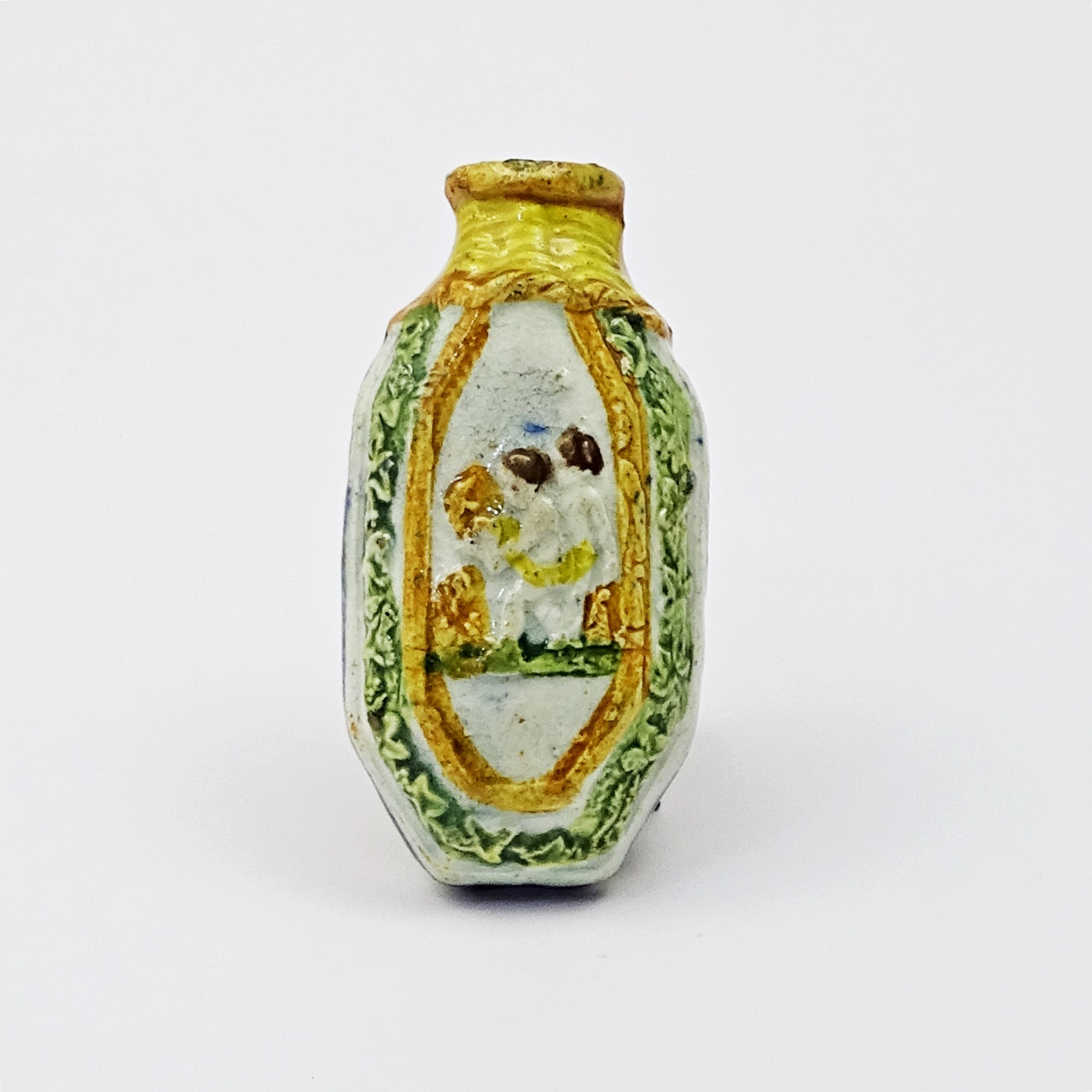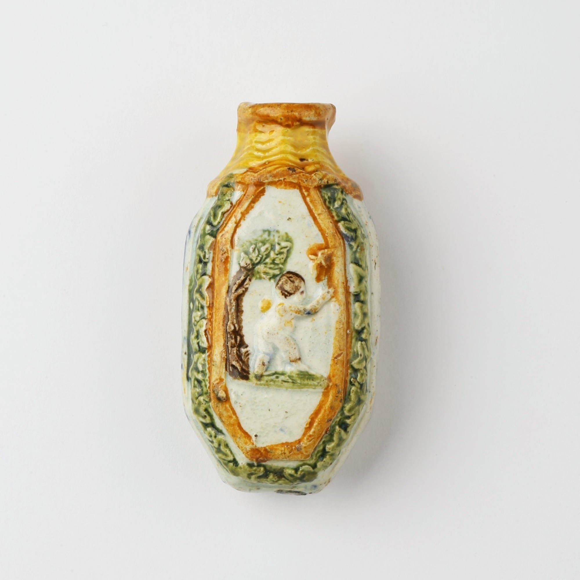 Prattware pottery scent bottle showing on one side a tree and a cherub catching a butterfly or a bird. On the other side two cherubs playingin a field. Missing stopper, possibly a cork. Cream, yellow and green are the typical colours of this manufacture.