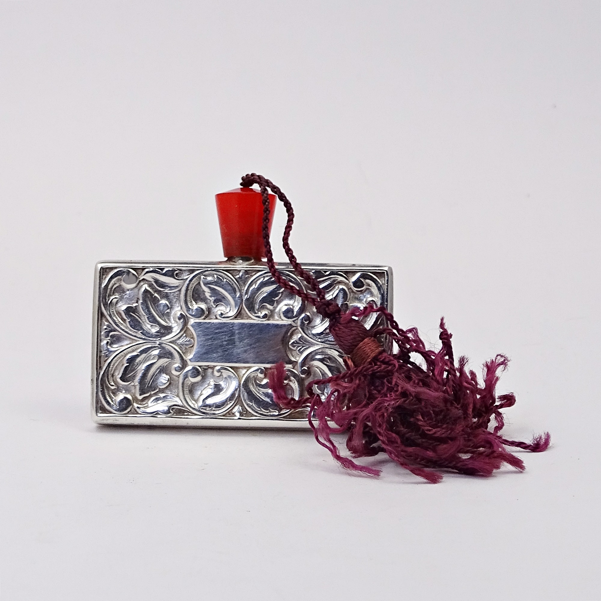 Rectangular scent bottle in stamped silver with foliage decor on both sides. On the front space for the monogram. Orange Bakelite cap with an amaranth tassel. Silver marks.