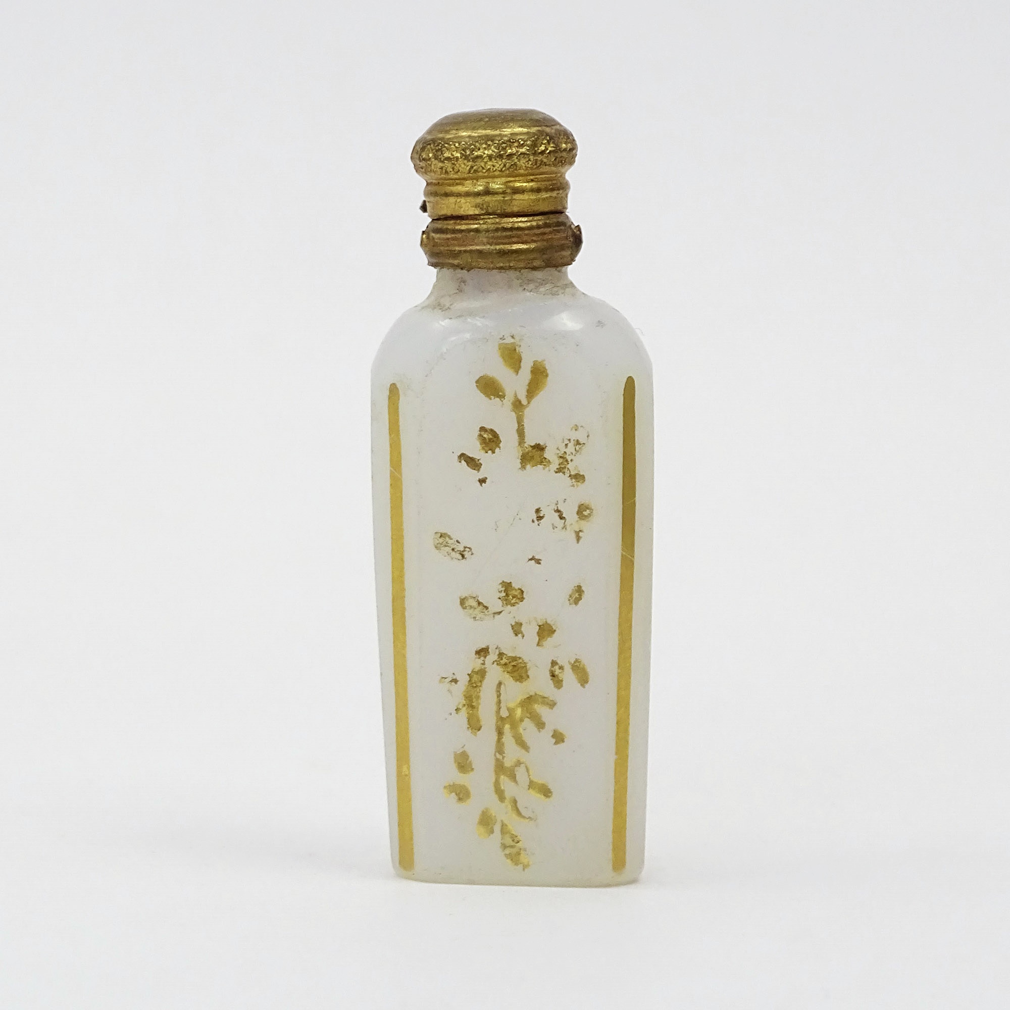 Home » Collection » Rectangular scent bottle in white opaline with gold decor partially faded.
