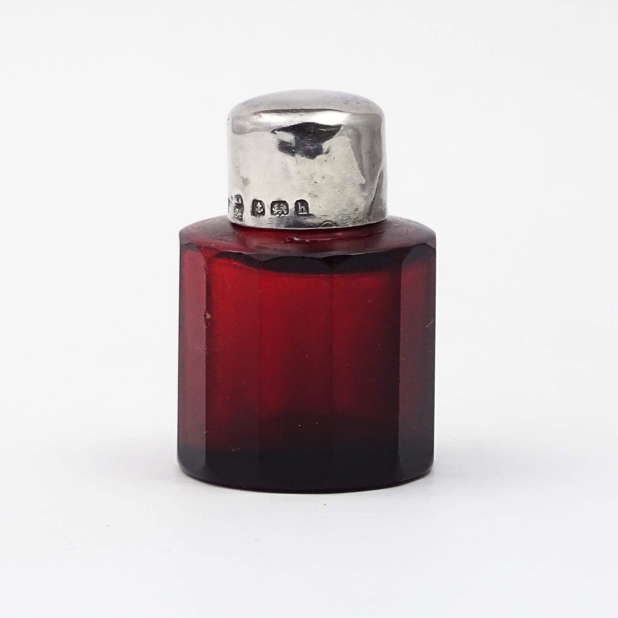 Twelve faces red cut glass scent bottle. Silver screw cap full hallmarked for Birmingham, 1907, illegible silversmith mark..