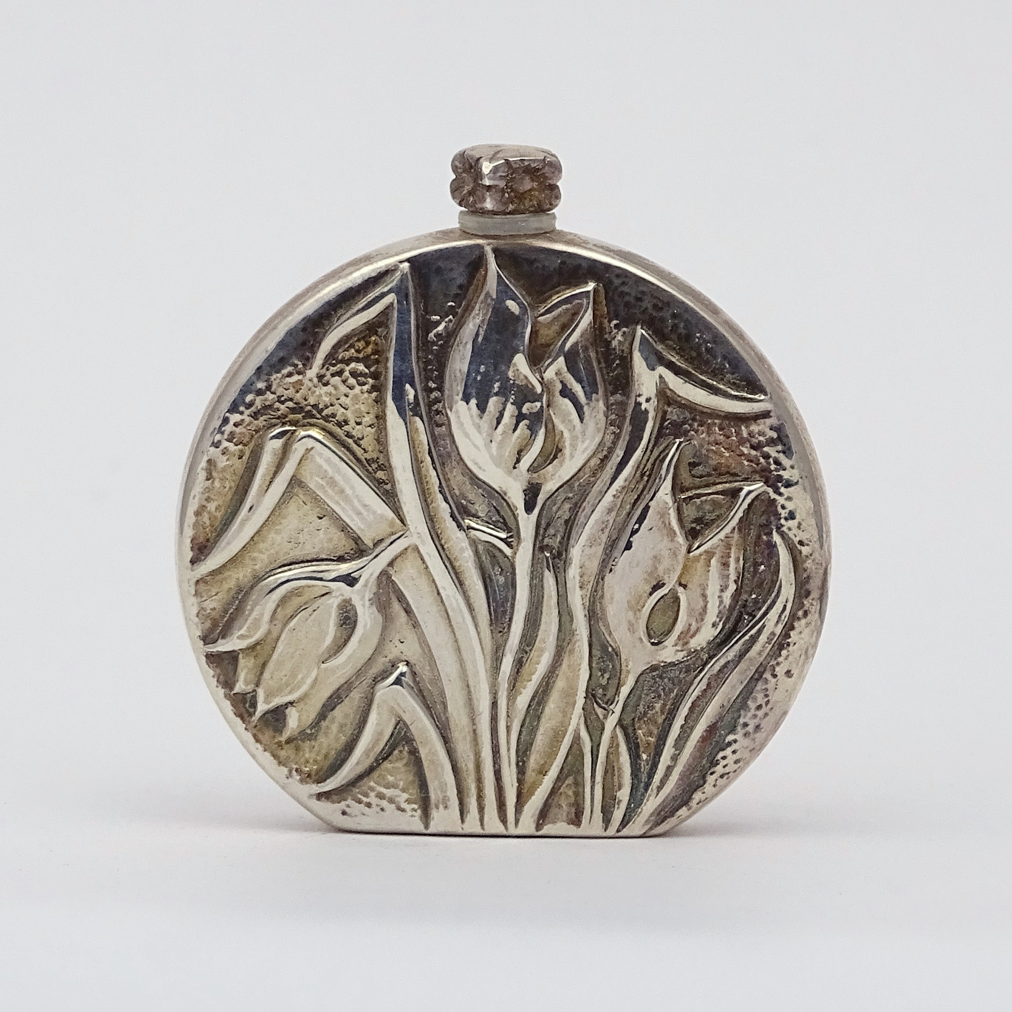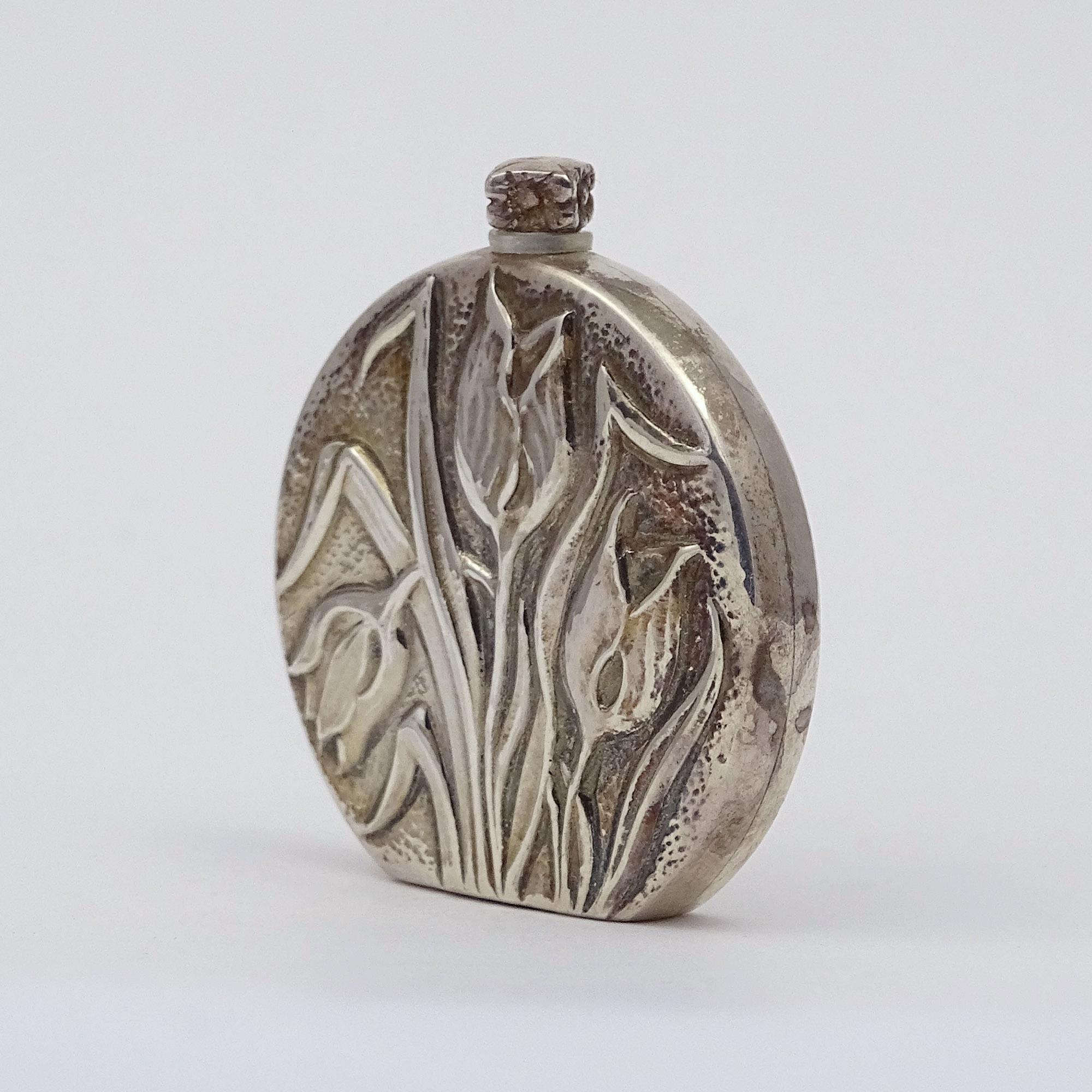 Home » Collection » Stamped silver scent bottle showing a bunch of tulips on both side