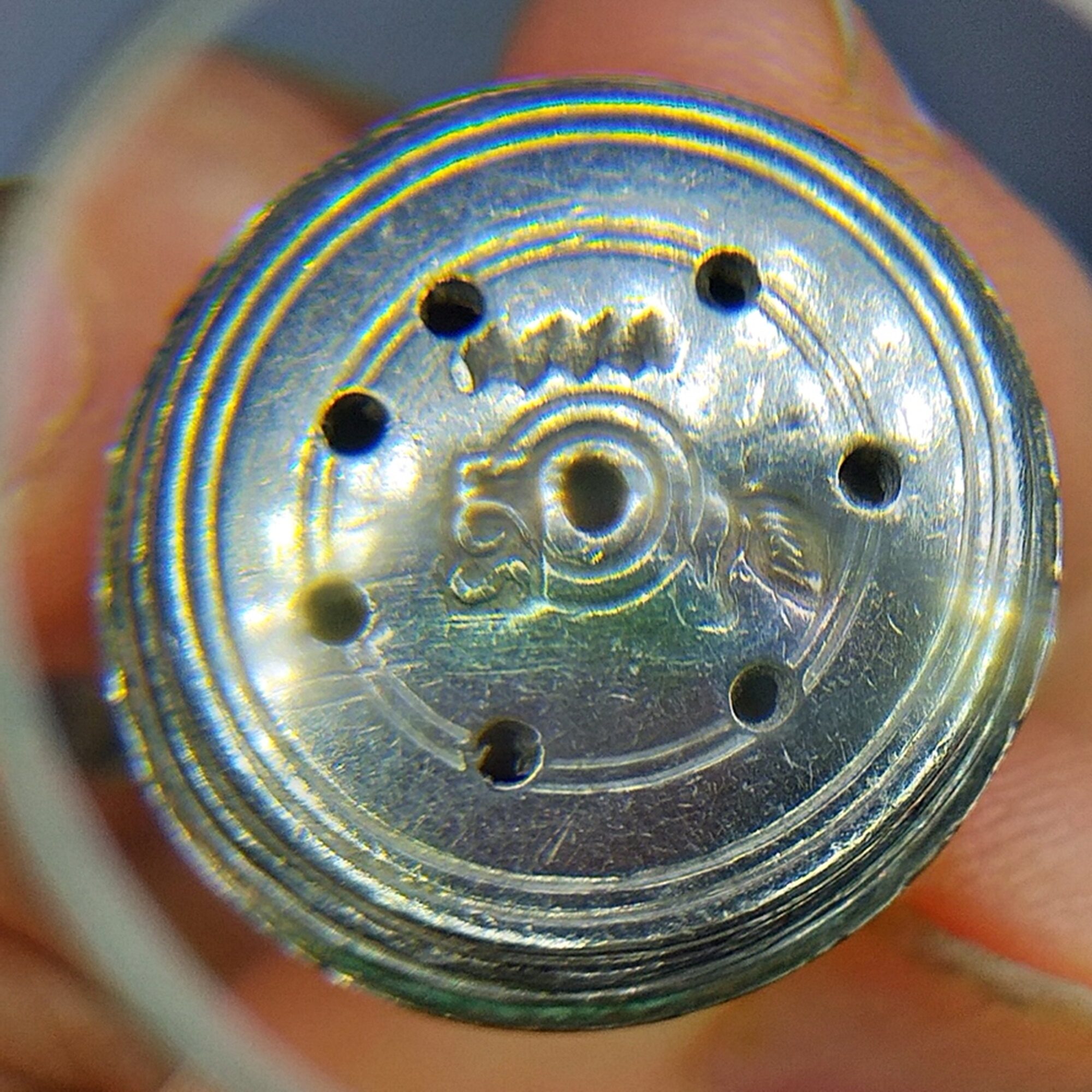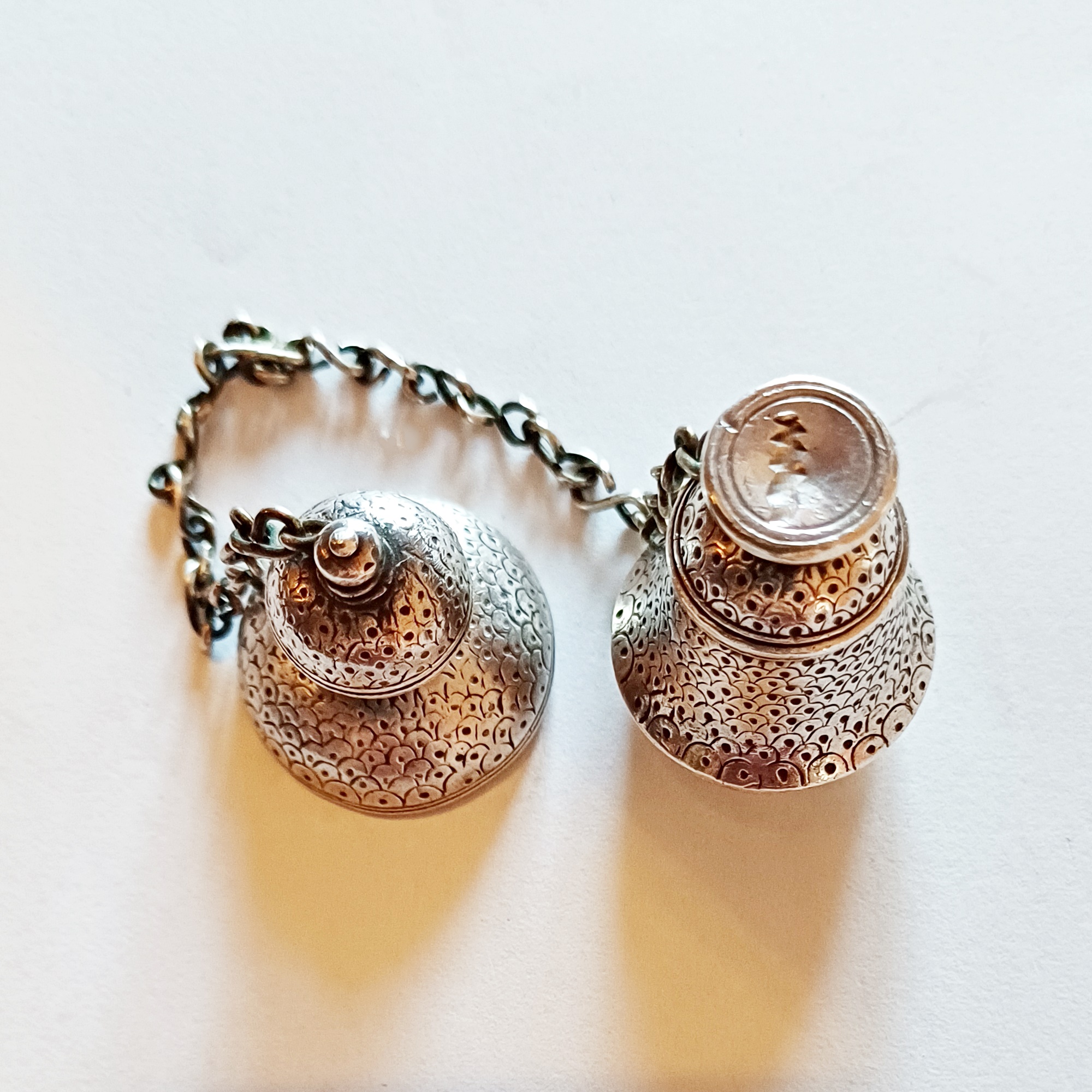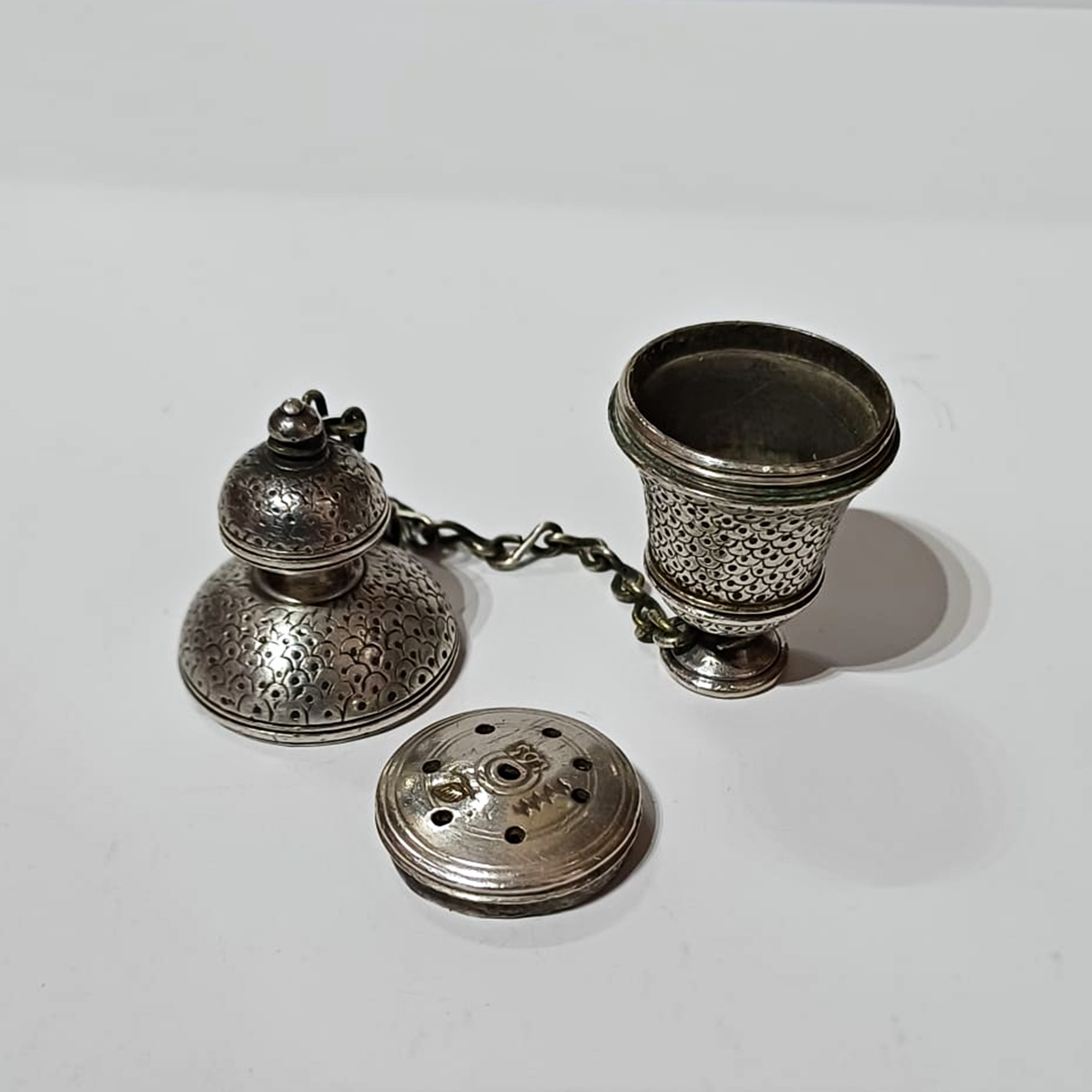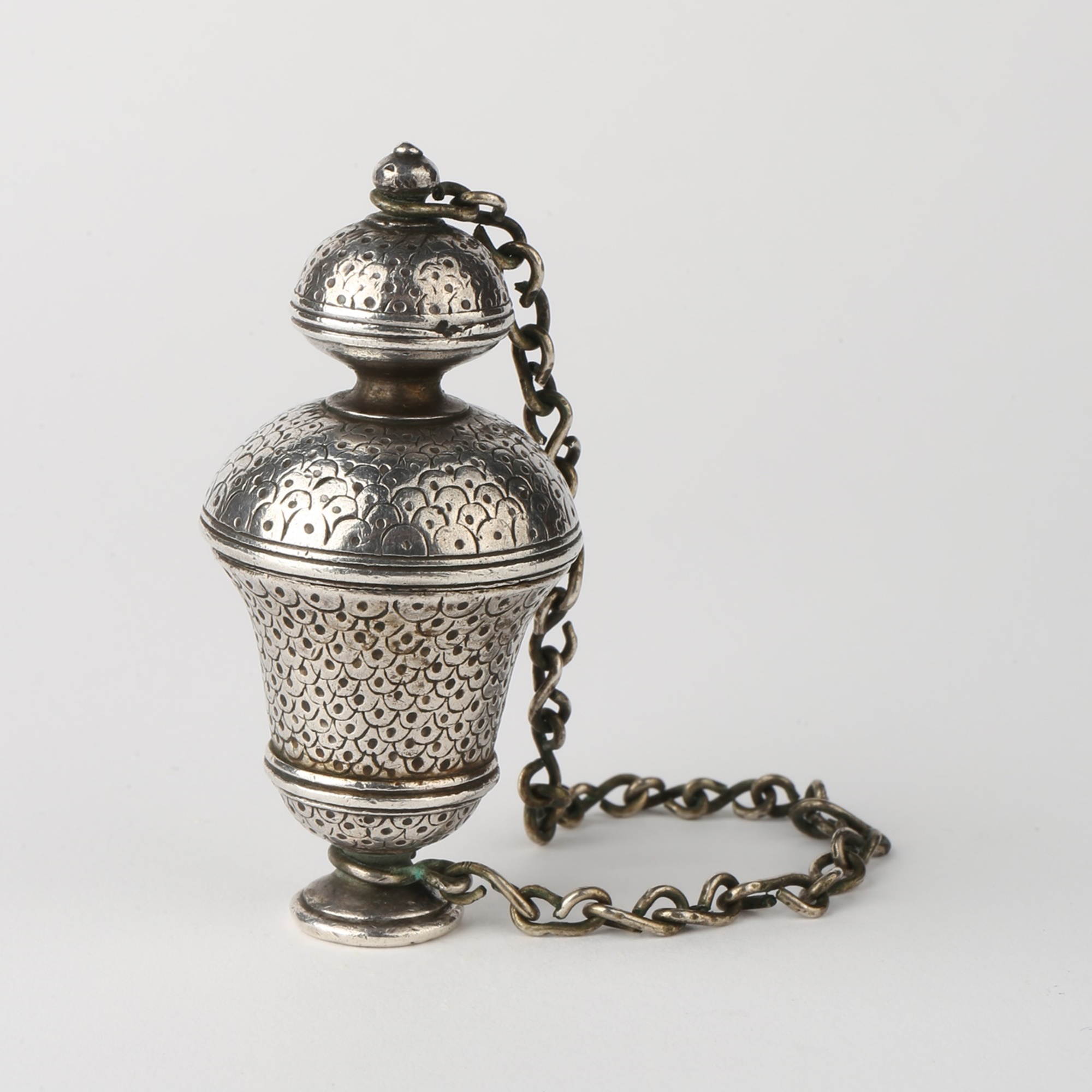 Riddled silver perfume box made of three pieces: a solid perfume container, a perforated cover and and a globular lid with chain linked to the base. Full hallmarks for Palermo, Sicily (Italy), 1649.