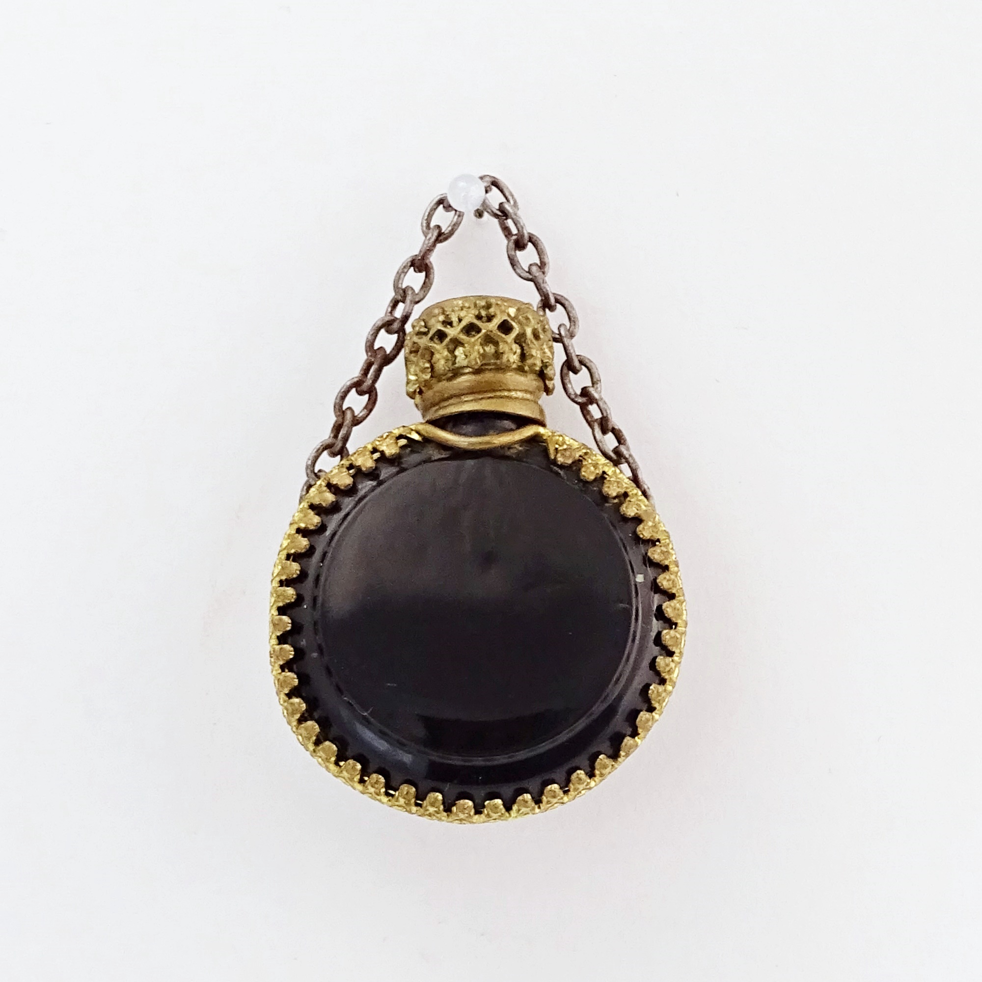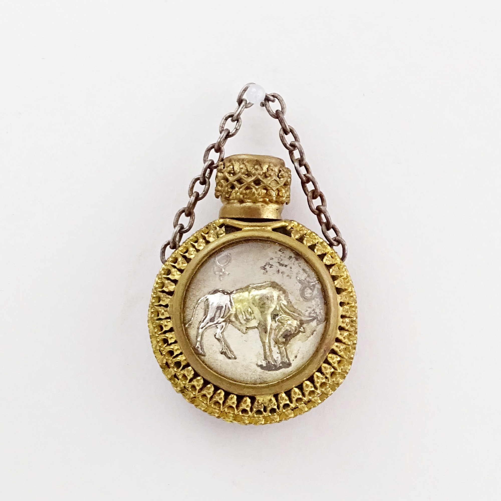Home » Collection » Round black glass scent bottle in a metal cage with the Zodiac Taurus sign
