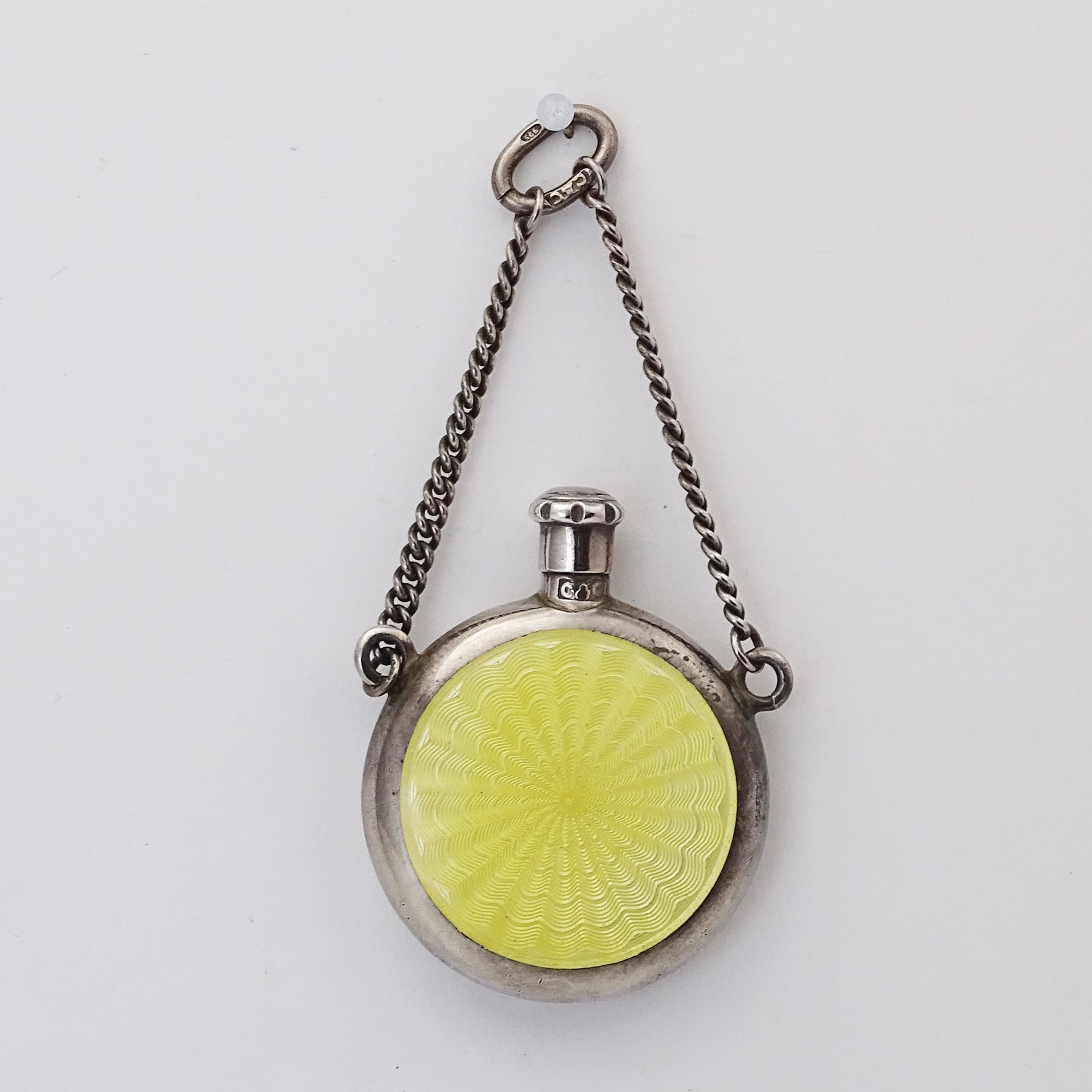 Round chatelaine scent bottle in silver with bright yolk yellow guillochè enamel. Screw tiny cap with marks: 925, C&C and other illegible marks. Suspension chain with little ring also marked