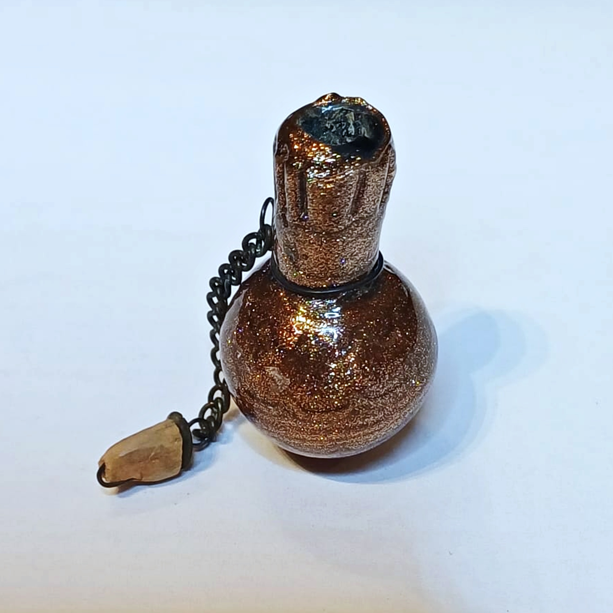 Round clear glass scent bottle totally wrapped up in lampwork aventurine glass. Long neck with chain and cork stopper.