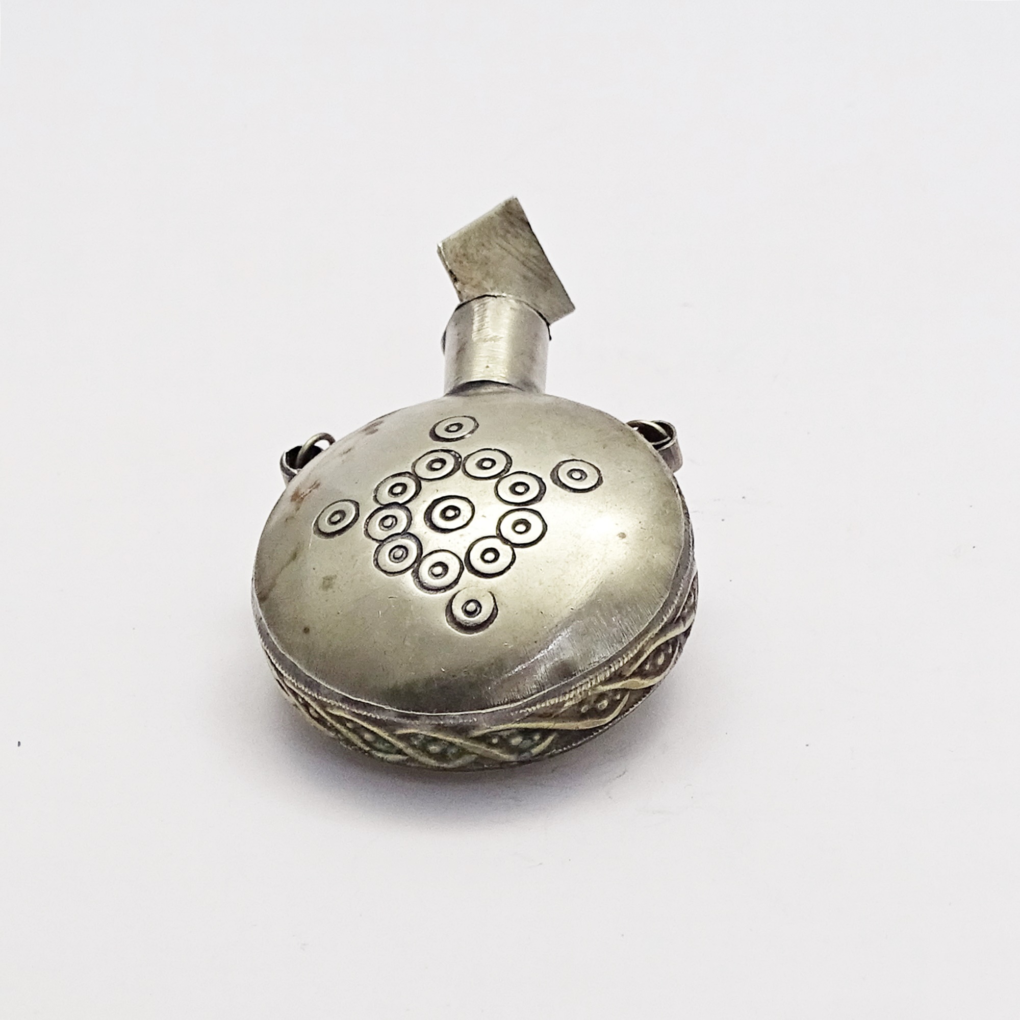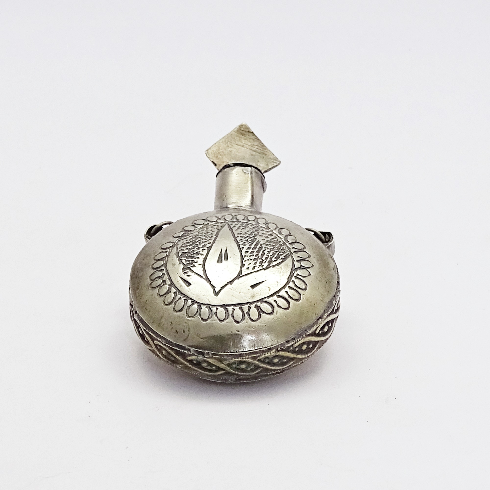 Round metal scent bottle with very naive carved decoration. Cap with short wand and suspension chain.