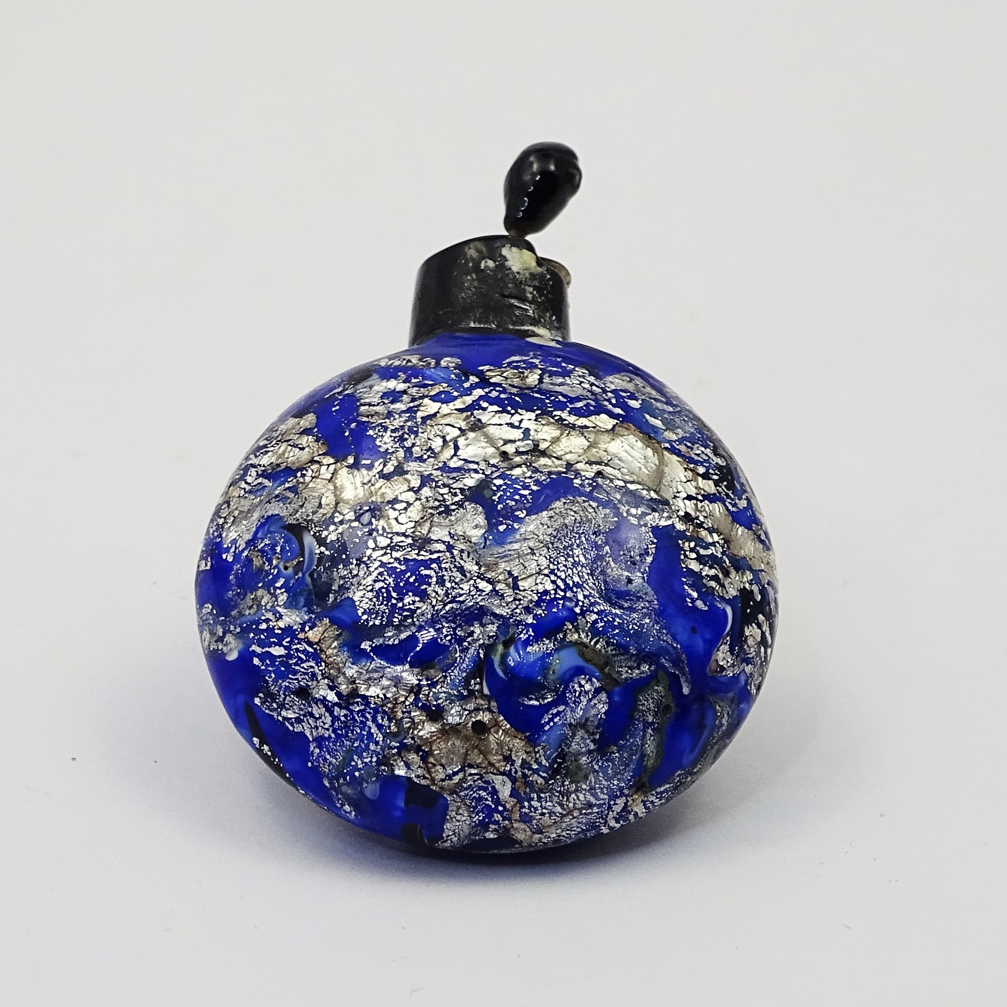 Home » Collection » Round Murano scent bottle in black and blue glass with silver sparkling aventurine