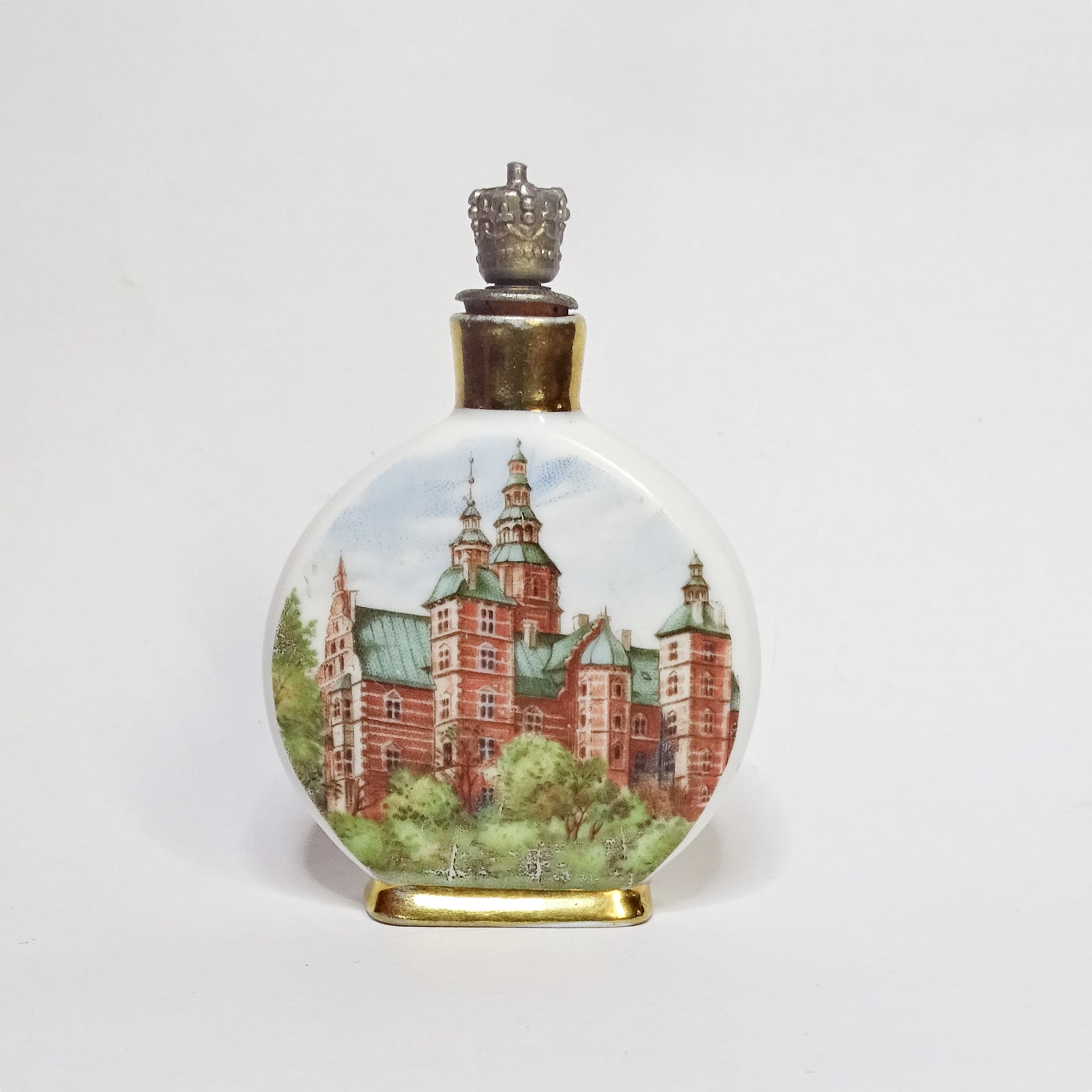 Round porcelain scent bottle souvenir of two Royal residences in Denmark. The two decals show Fredensborg on the lake Esrom and Rosenborg in Copenhagen, both famous for their architectures and their gardens. The metal crown top suggest a possible German production.