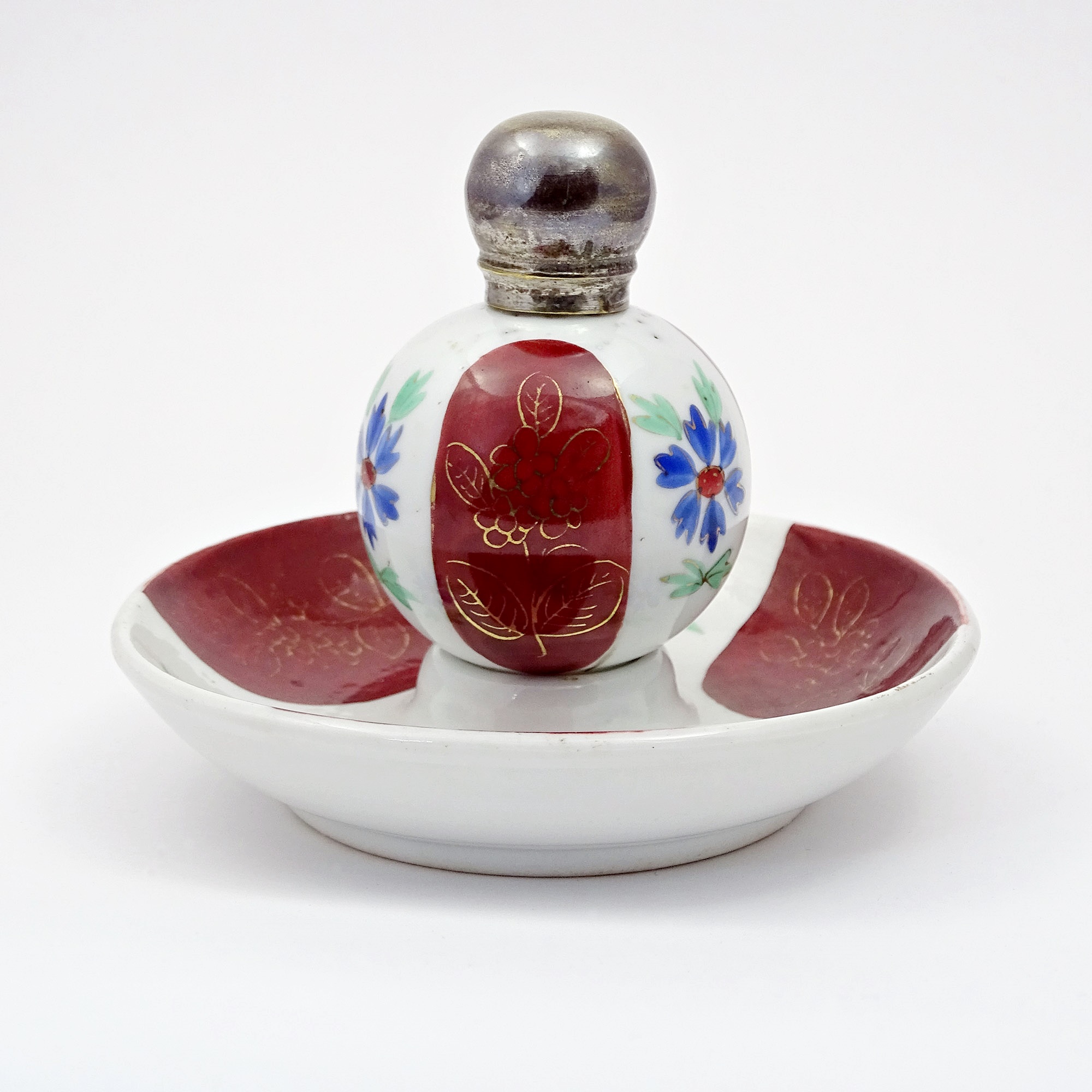 Home » Collection » Round porcelain scent bottle standing on a hair pins dish