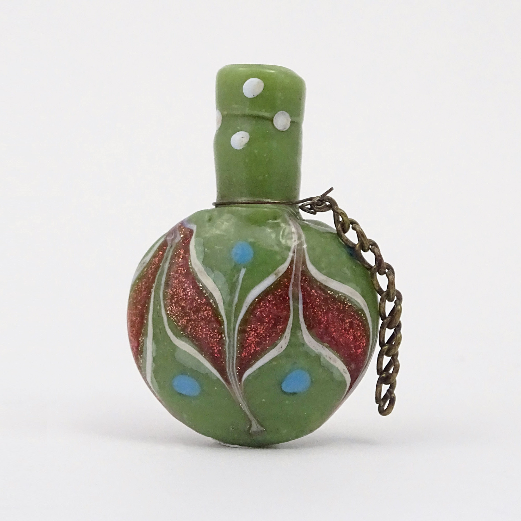 Round scent bottle in a olive green glass lampwork bead with aventurine leaves and blue dots.
