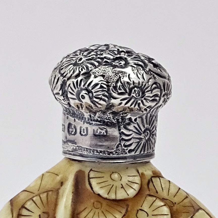 Royal Worcester porcelain scent bottle, simulating ivory, with Japanese design. Silver mount and cap with floral design matching the one on the bottle. Full hallmarked for Birmingham, 1888, double illegible marker punches: one Royal Worcester circular cream and brown repousse porcelain perfume bottle decorated with Japanese figures in the style of Satsuma. Modelled and coloured to appear as carved bone or ivory. One side depicts a nobleman holding a fan, behind him is a spray of large stylised flower heads; the other side shows two battling warriors. The bottle is complete with a silver screw collar and silver screw cap, with floral design matching the one on the bottle. Silver mount and cap with f Full hallmarked for Birmingham, 1888, double illegible marker punches: one is F.S. perhaps for Ford & Slater silversmith.
