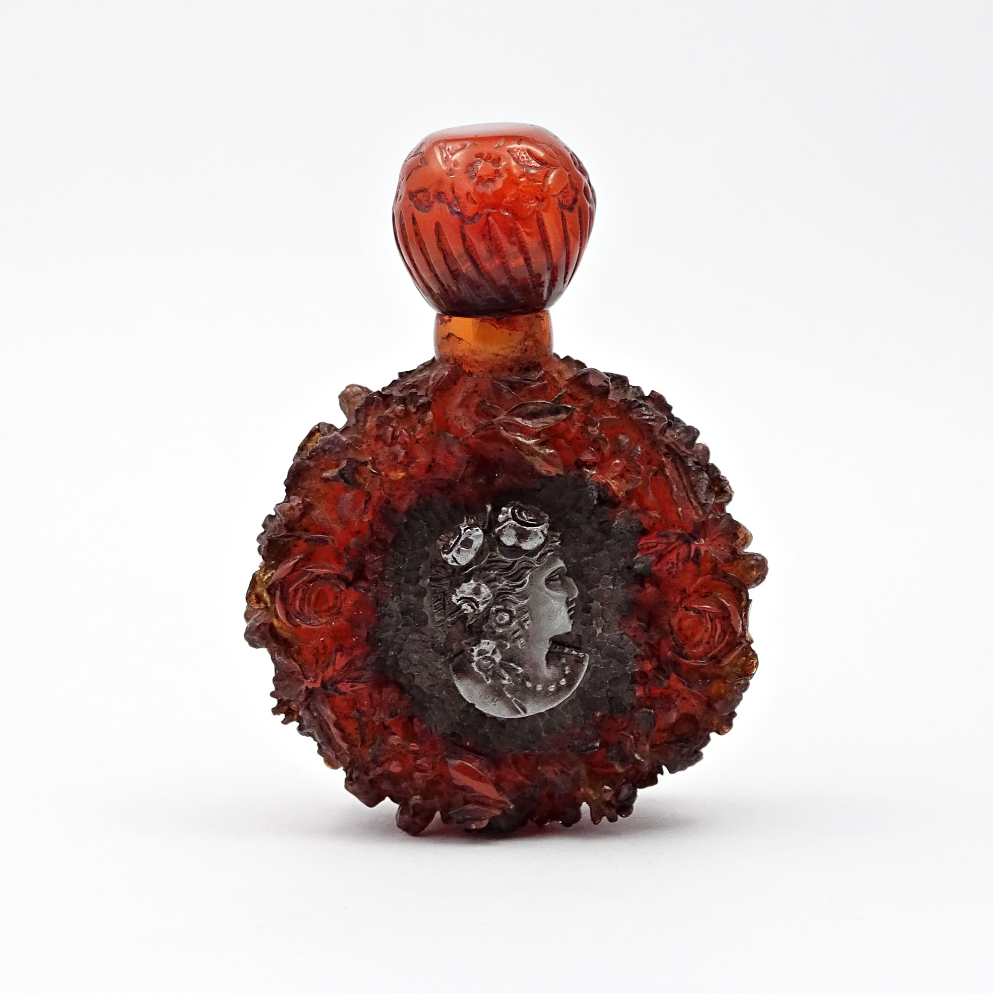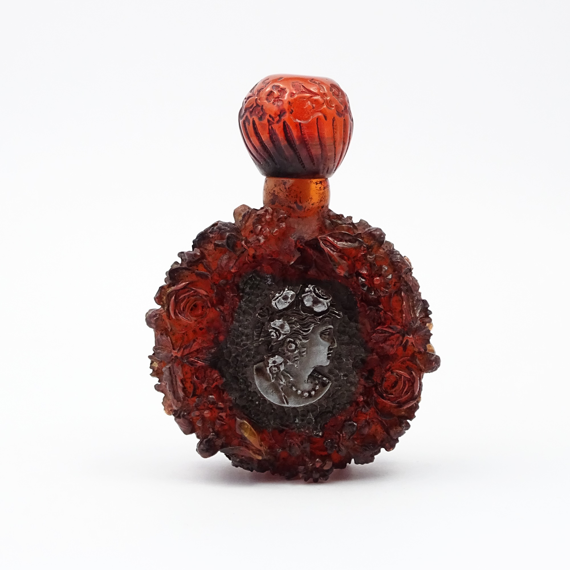 Scent bottle in amber bakelite with women profiles with head surrounded by flowers