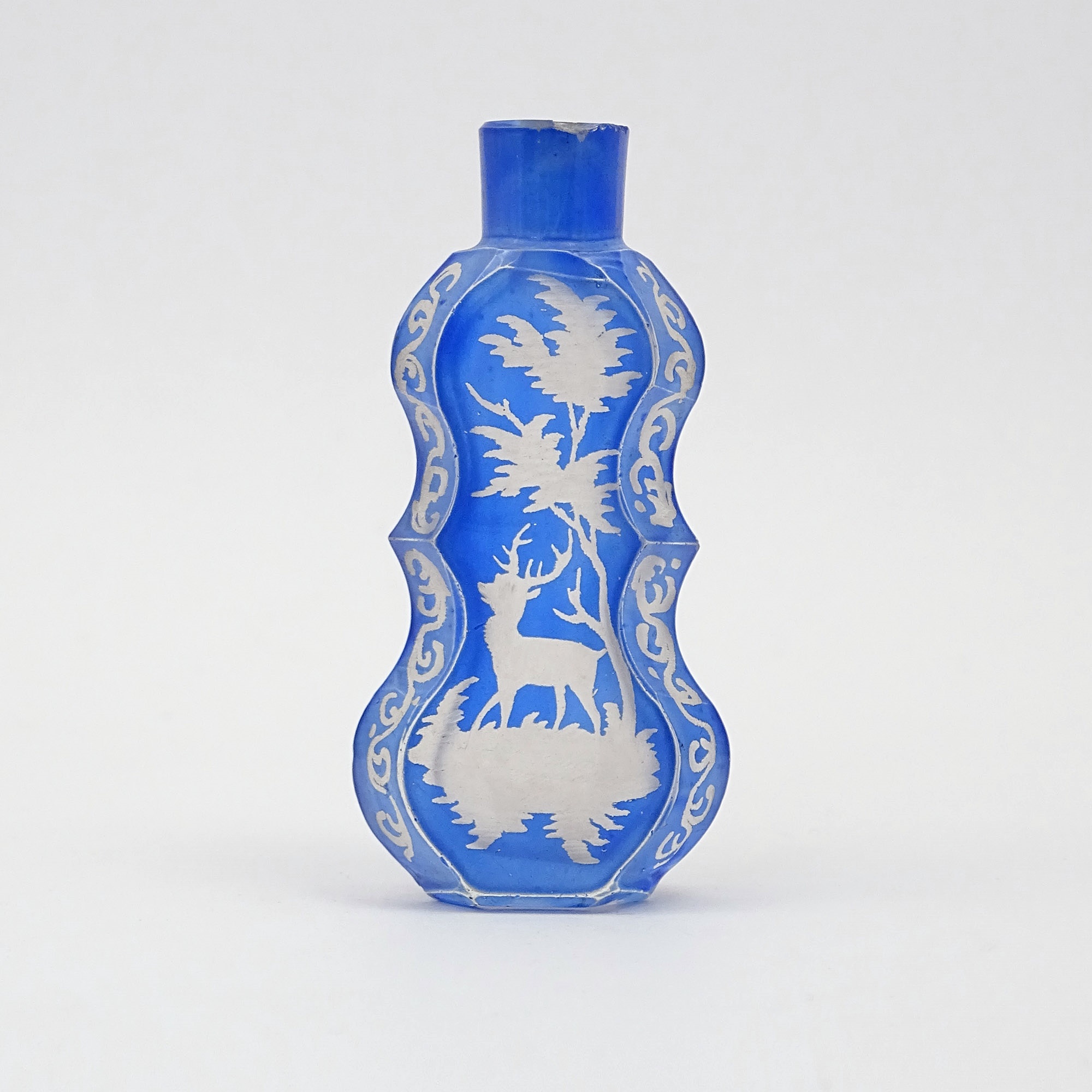 Home » Collection » Scent bottle in blue thick glass etched a scene of a deer in woodland