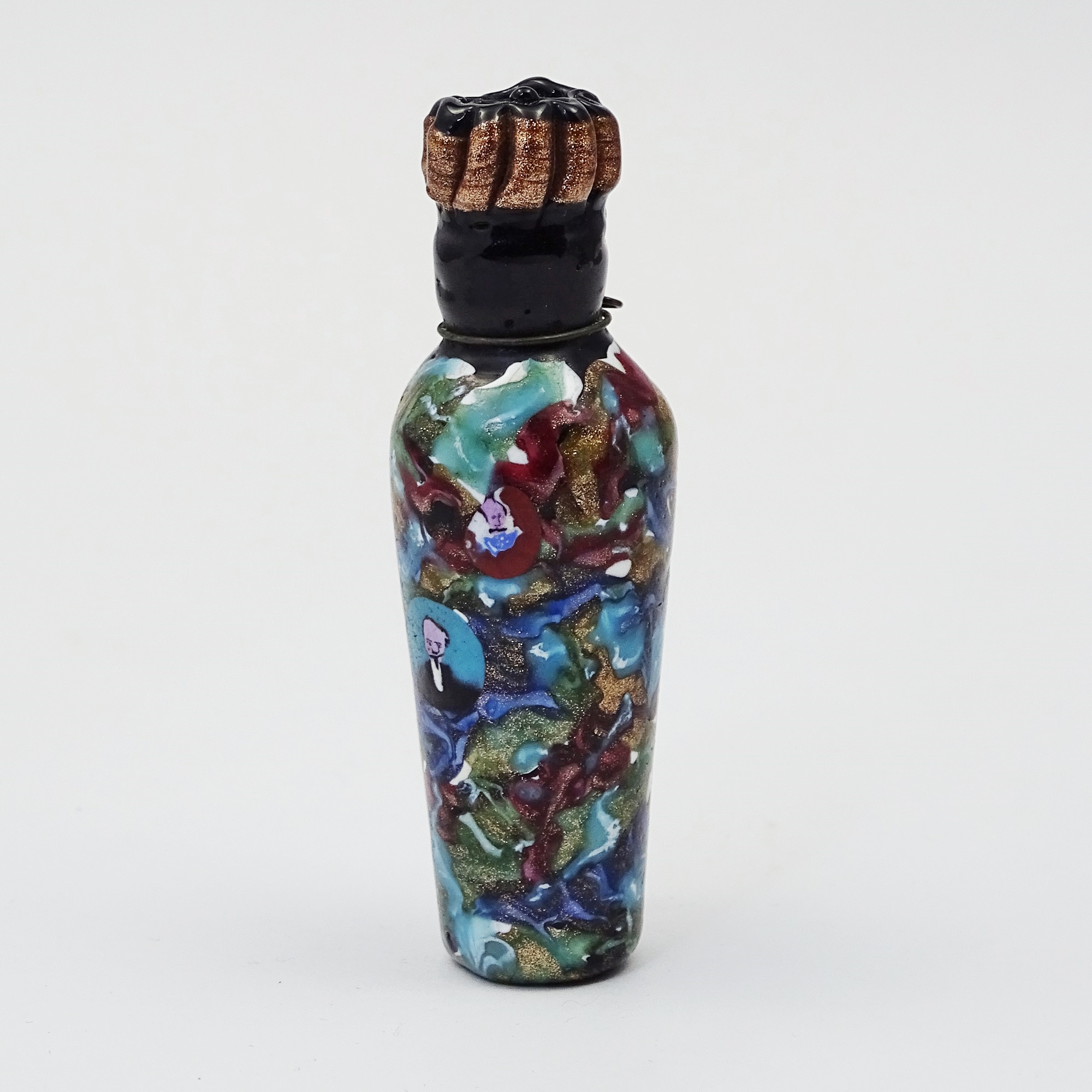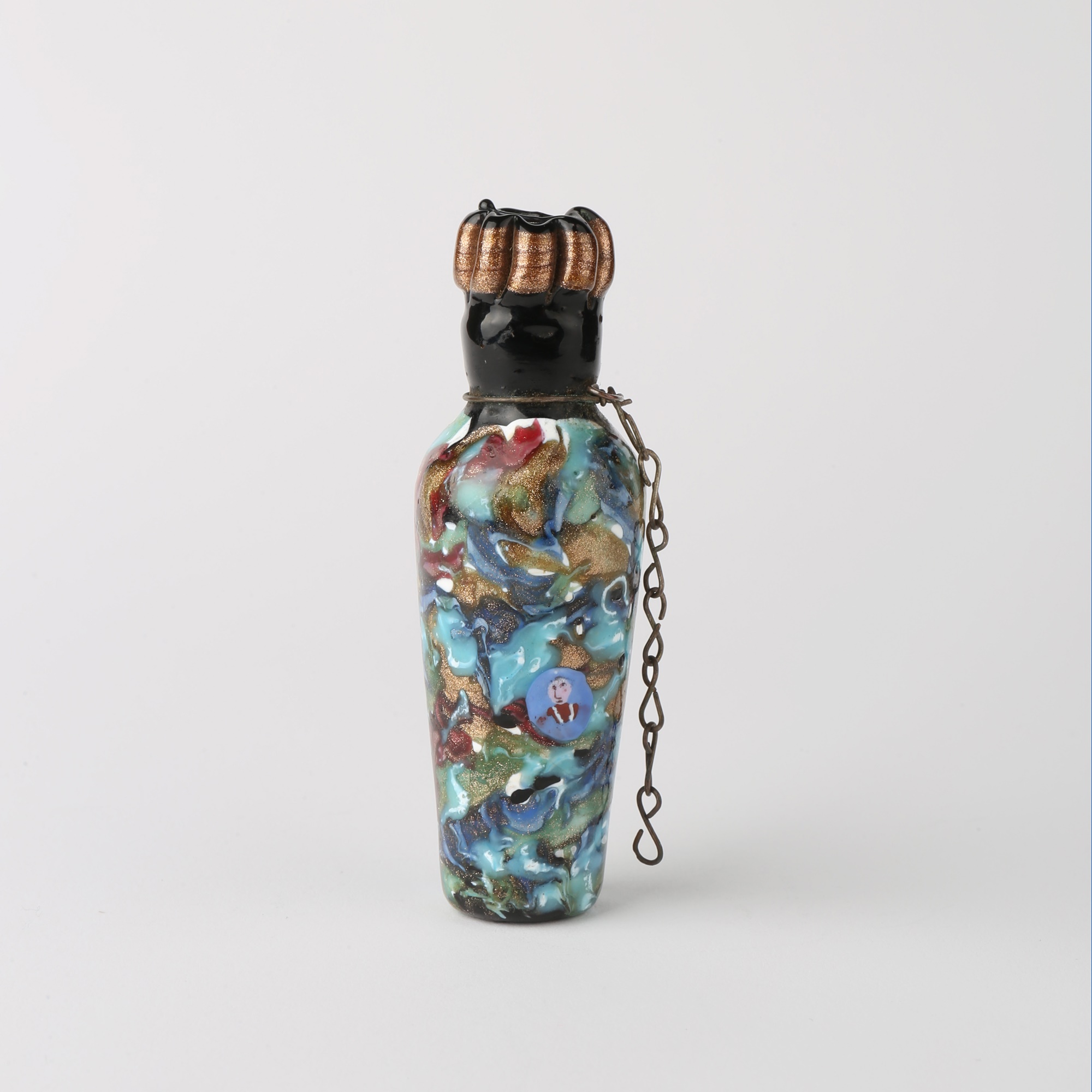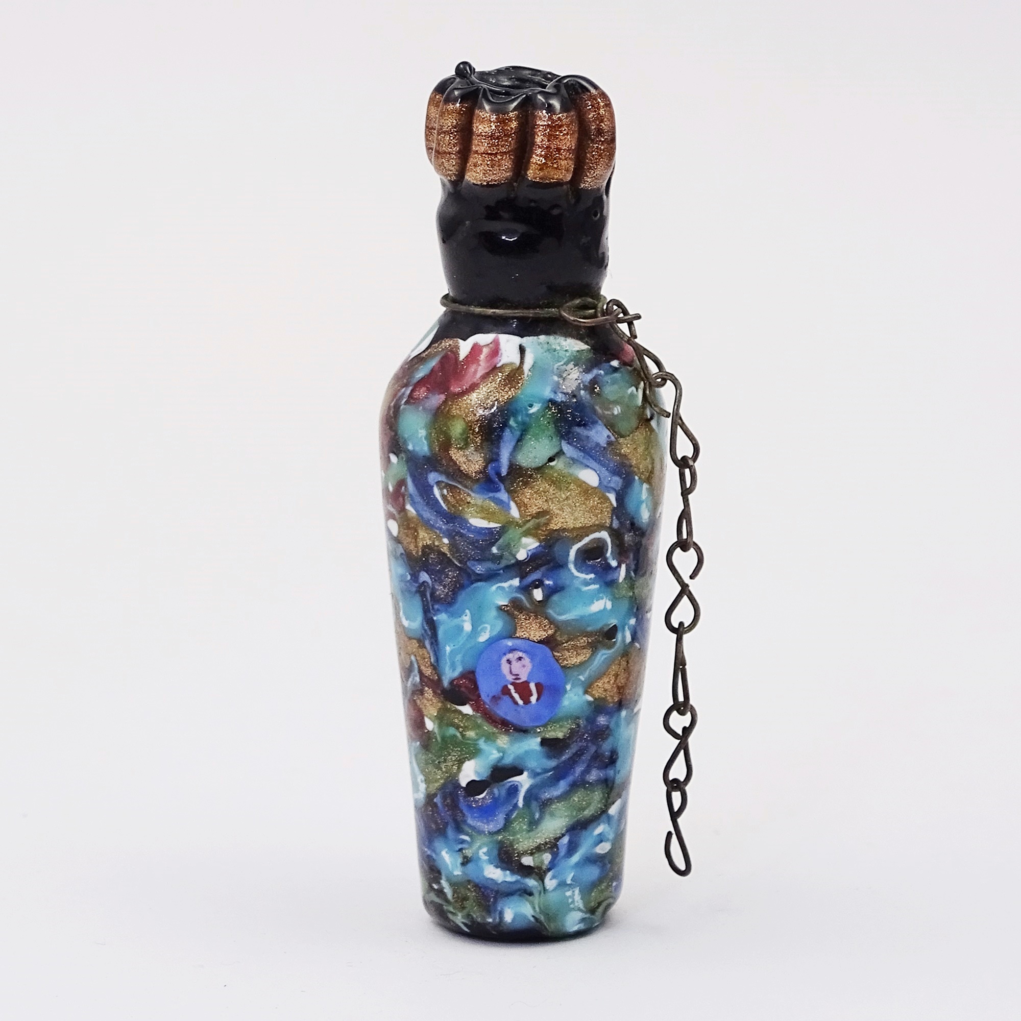 Rare standing scent bottle in Murano glass with aventurine. Three murrine with portraits: the Pope Pio IX, Giuseppe Mazzini and Napoleon III, the three main characters of the ” Roman Repubblic” in 1849. Missing cap (a cork or a tiny glass stopper) once attached to a little chain with wire collar.