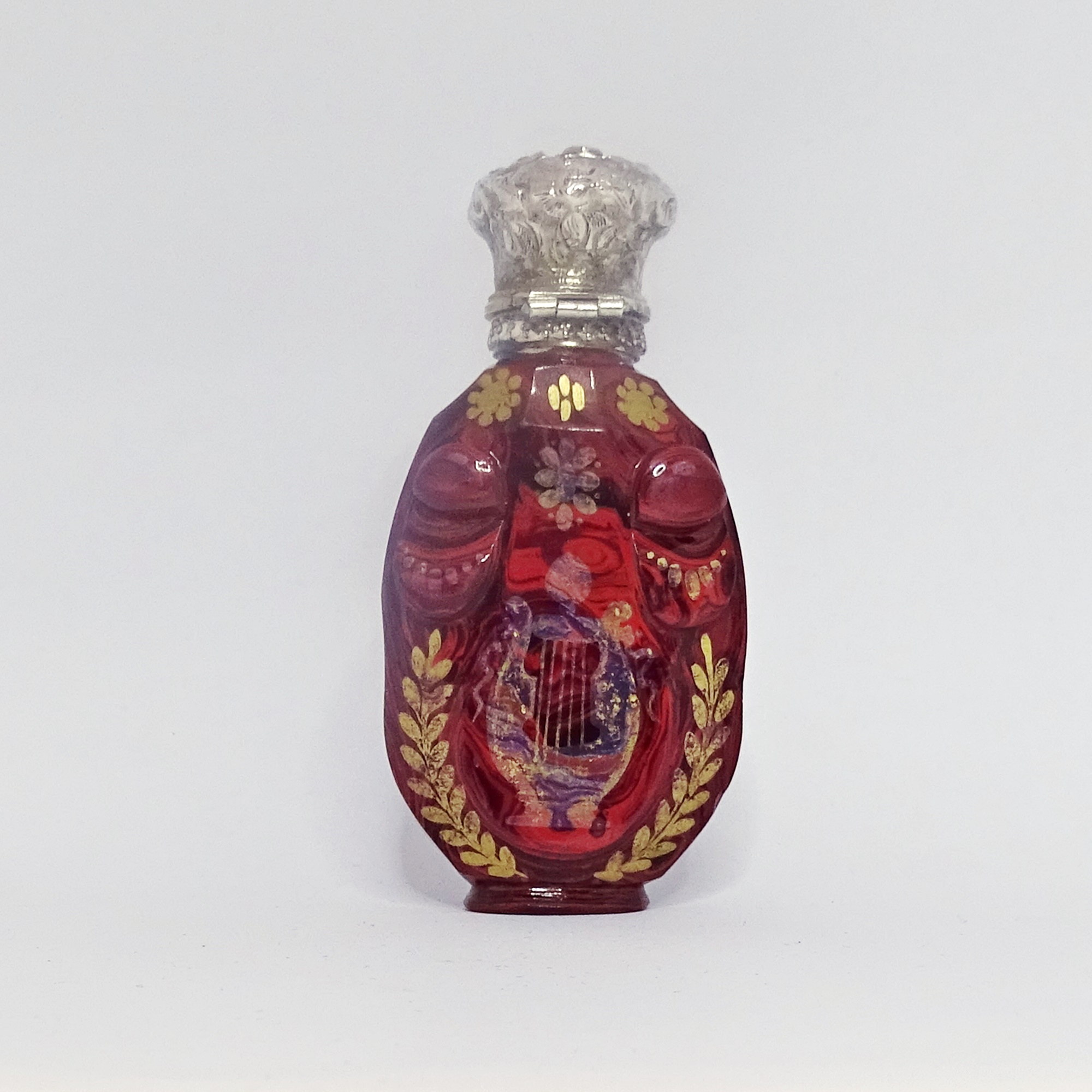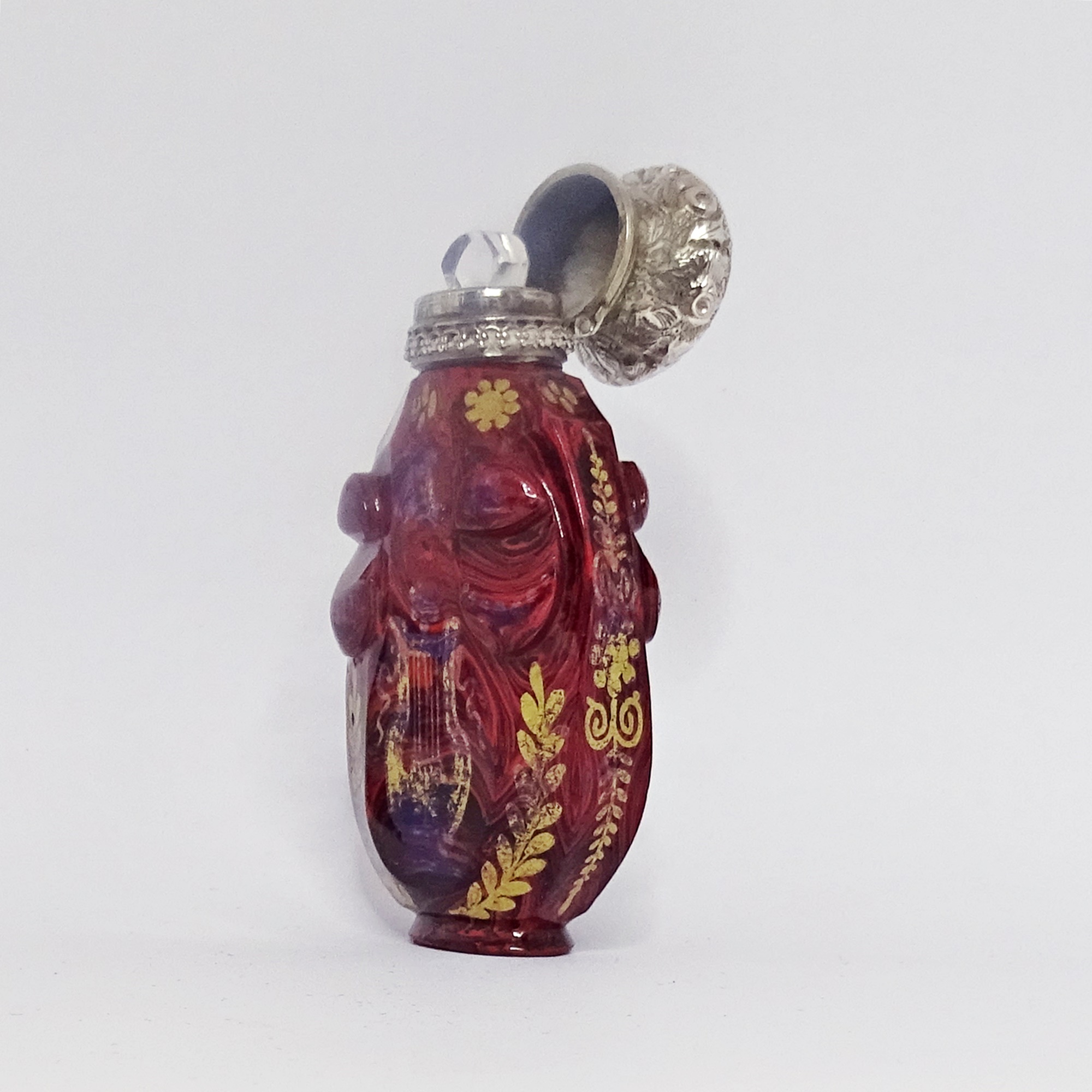 Unusual shaped scent bottle made in lithyalin glass with gold touches decors forming a lyre and a wreath on both sides. Silver mount and embossed cap. Possibly by Friedrich Egermann (1777-1864).