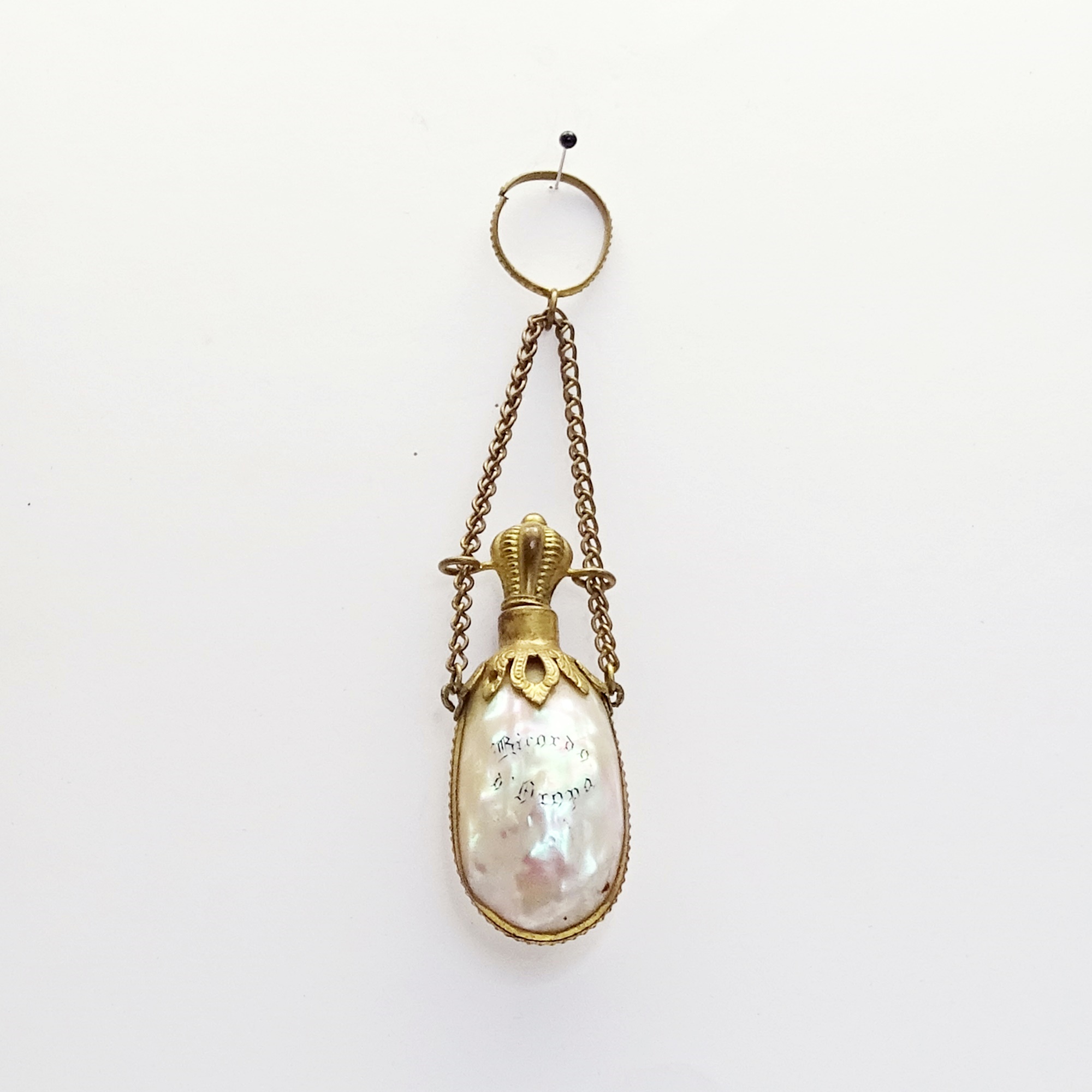 Scent bottle made of a pair of shells, glued together and harnessed with machine-tooled brass. It’s a souvenir of the town of Arona on the Lake Maggiore, as written on the front. The latch top like a crown with cork slides up the suspension chains ending with a finger ring.