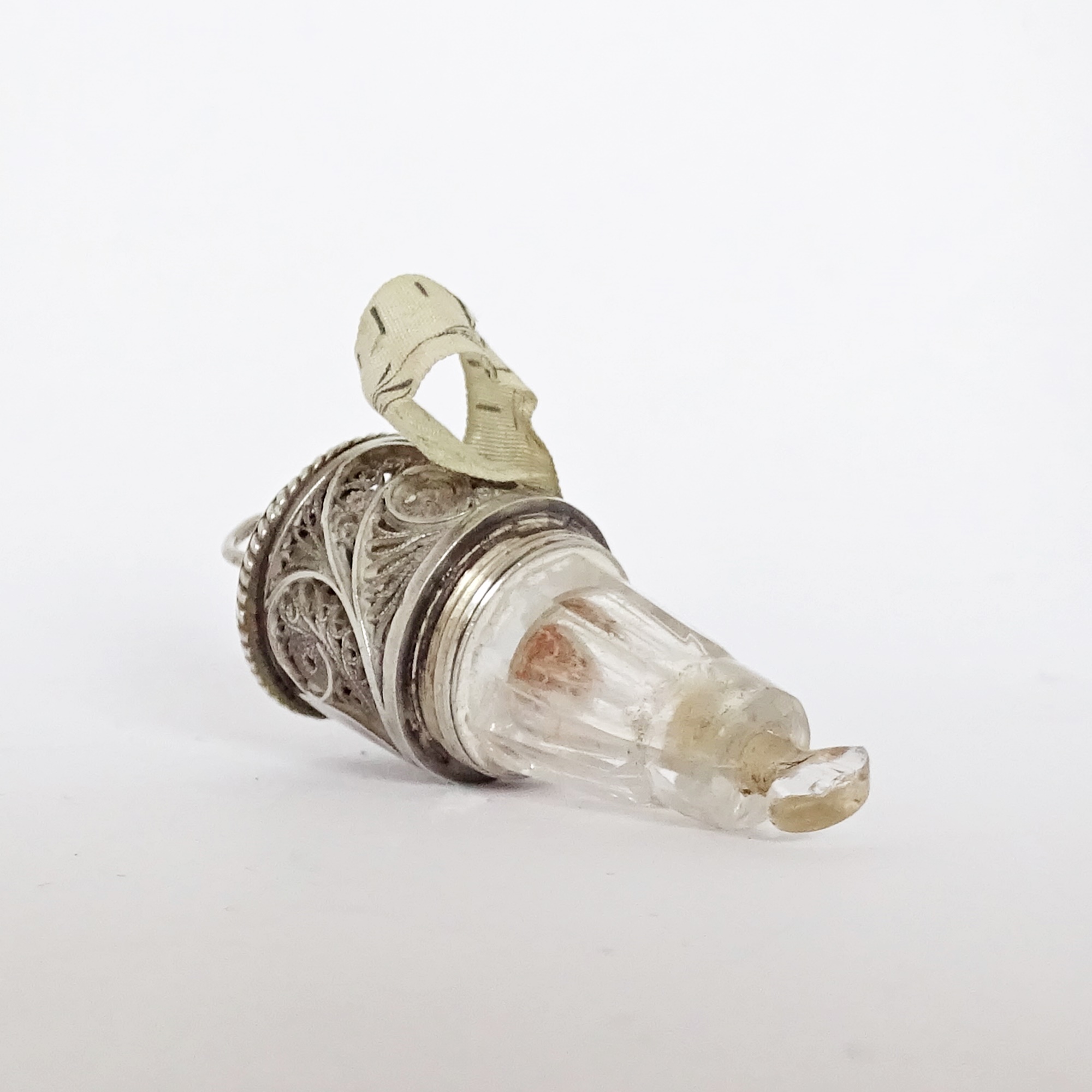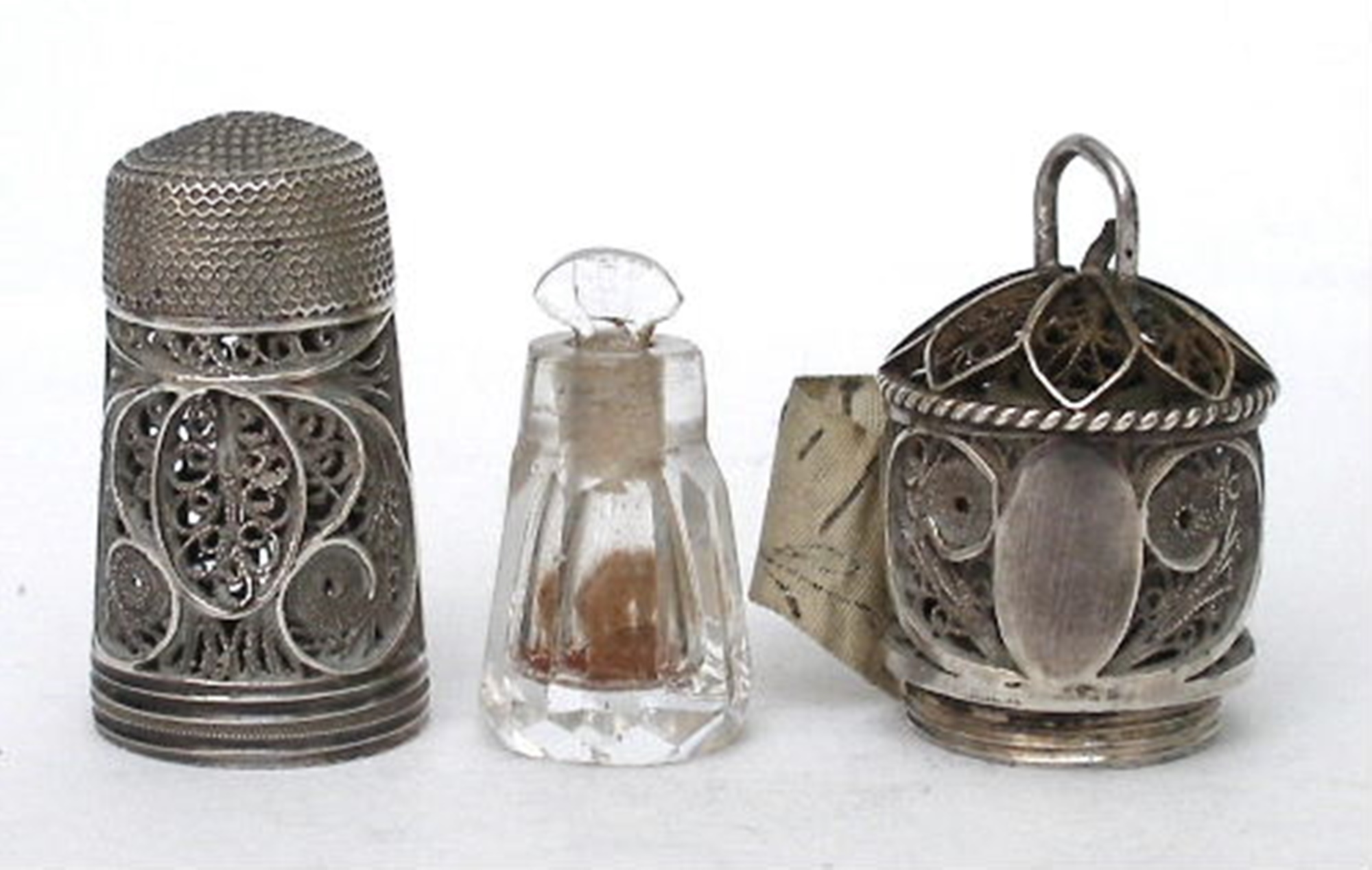 Home » Collection » Set made of glass perfume bottle, silver filigree thimble and silk tape measure
