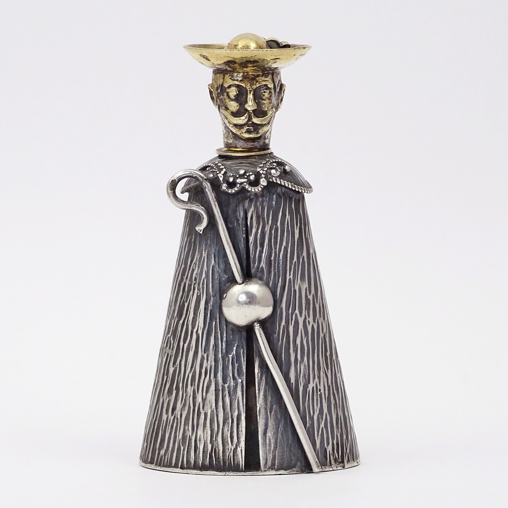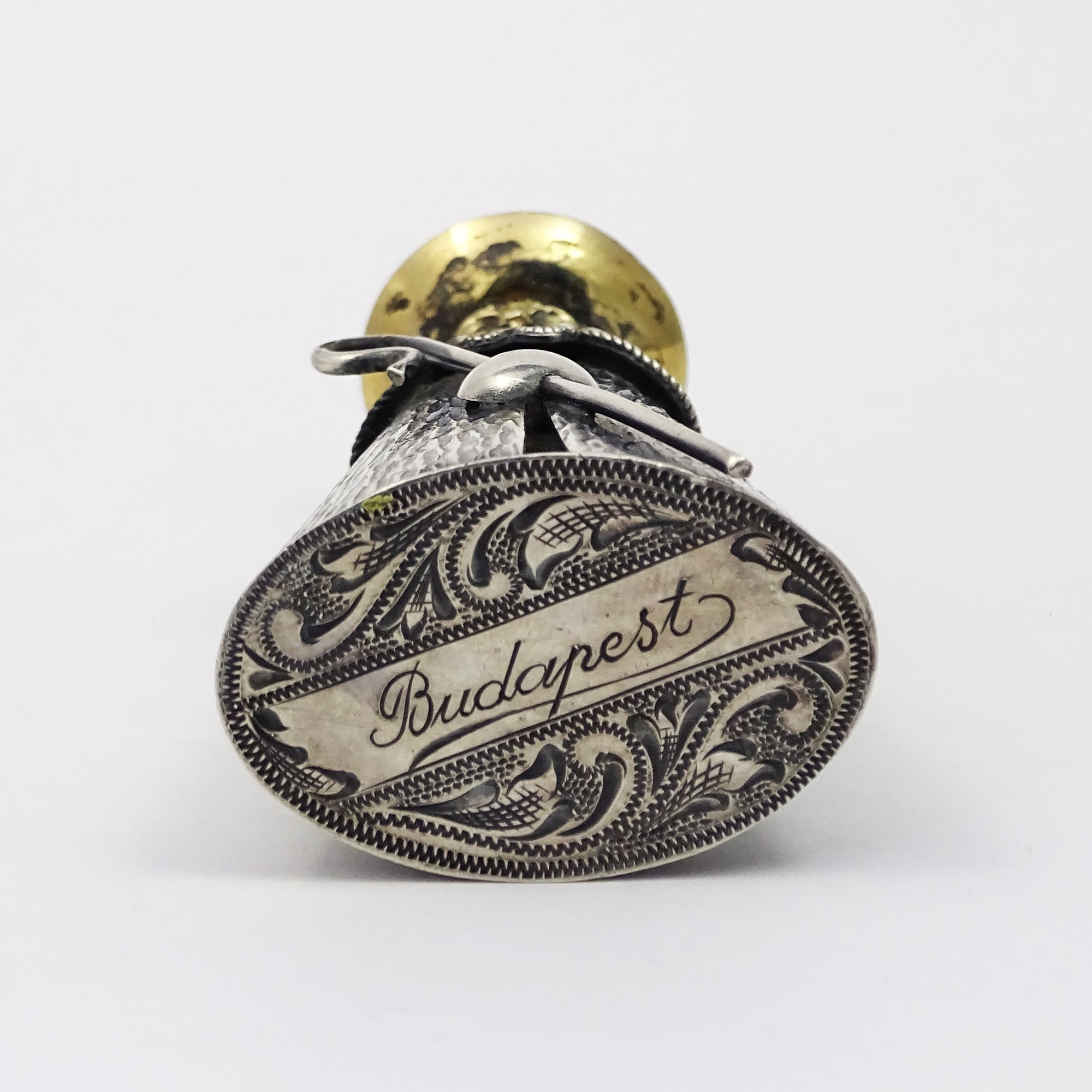 Silver bottle, souvenir from Budapest (written on the bottom). It depicts a “Hortobàgyi csikos,” a Hungarian knight of the Pustza. The head with the characteristic hat forms the cap.