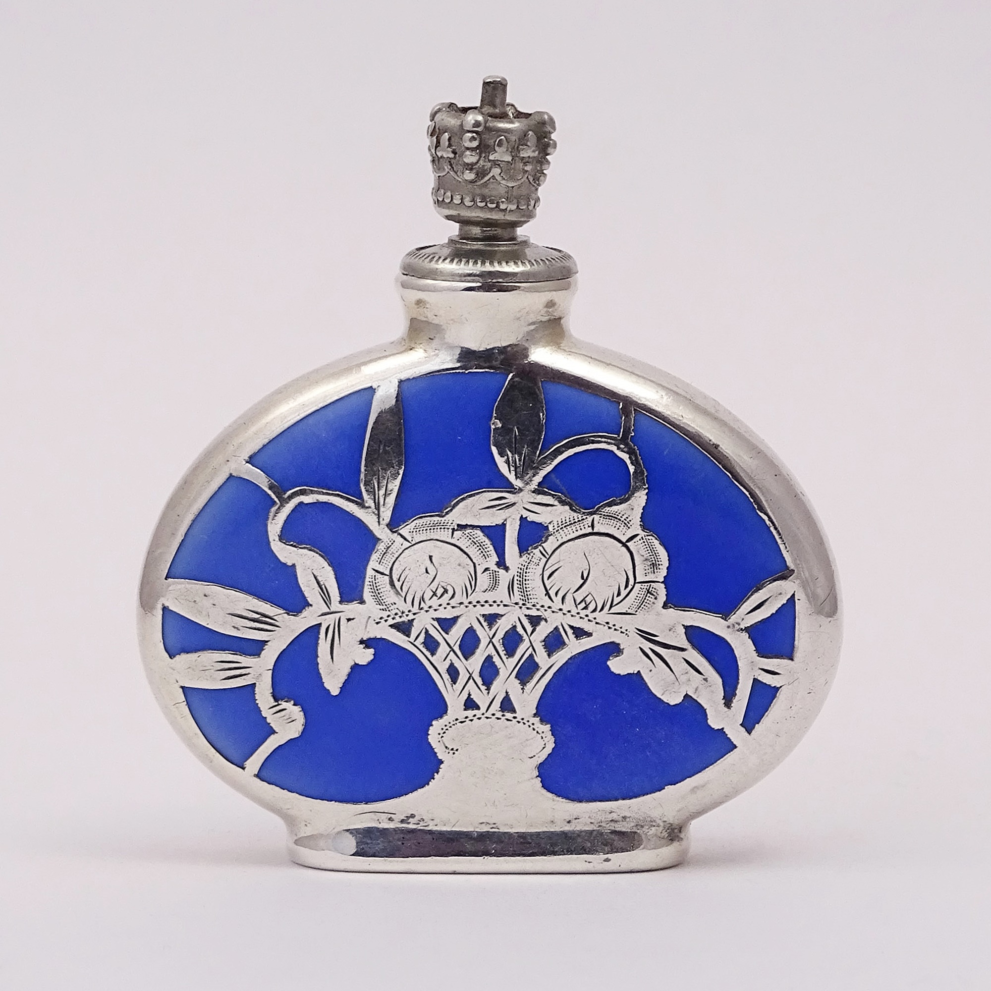 Silver overlay blue porcelain scent bottle with a basket of flowers