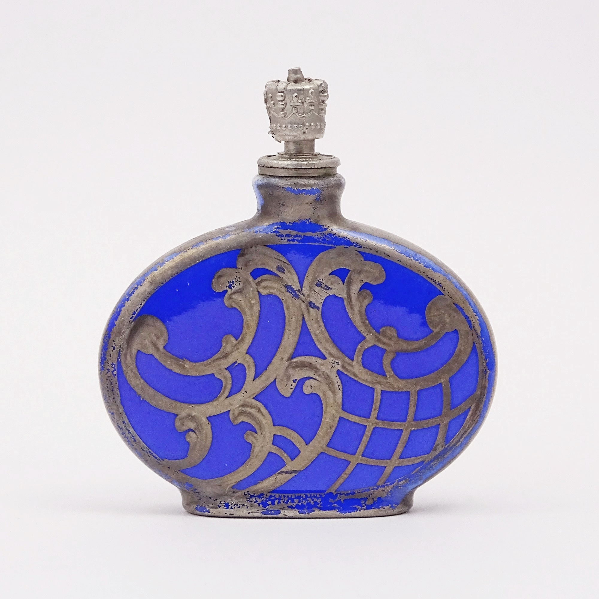 Home » Collection » Silver overlay blue porcelain scent bottle with a formal Baroque style decor