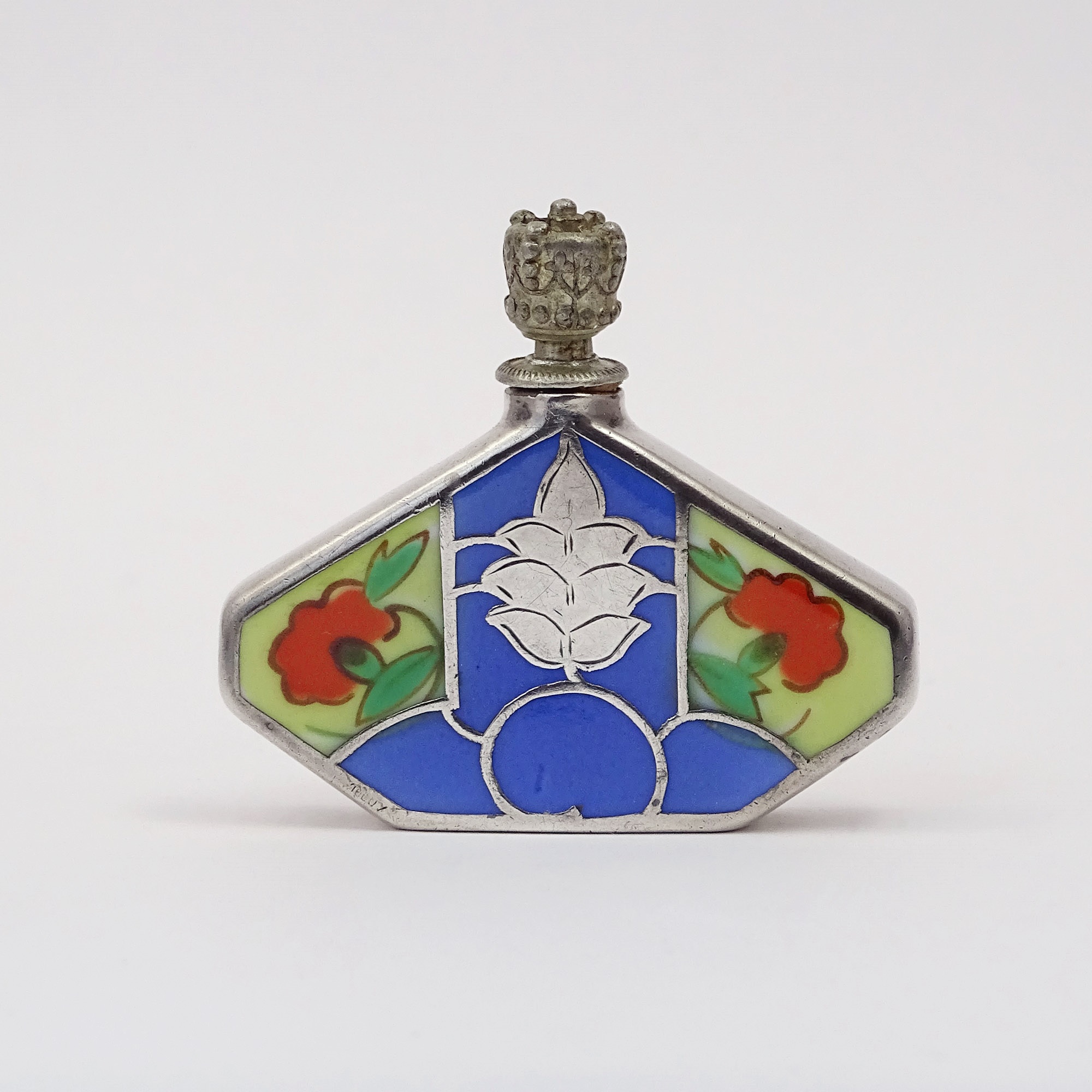 Home » Collection » Silver overlay coloured porcelain scent bottle with two red flowers and a silver pinecone