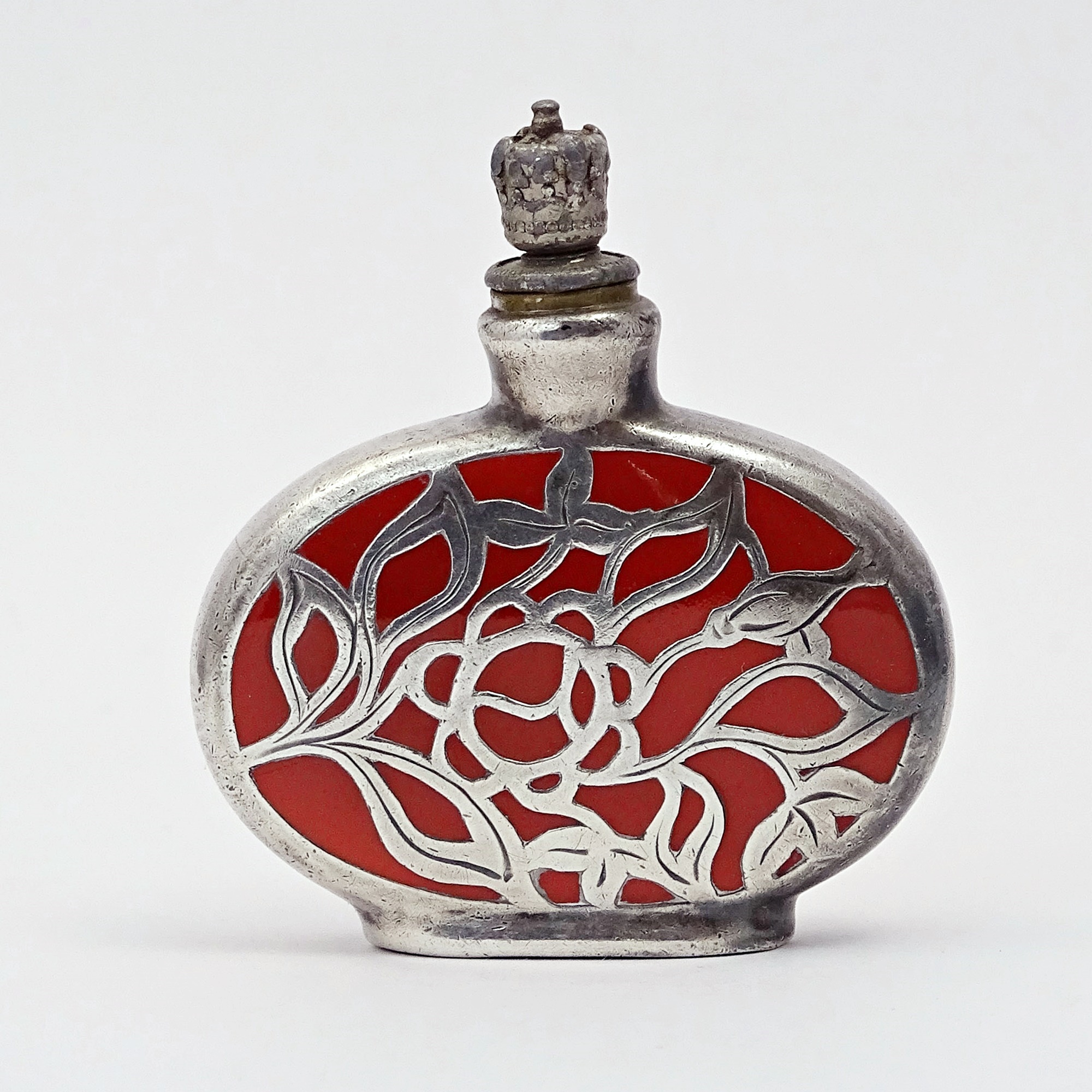Home » Collection » Silver overlay dark orange porcelain scent bottle with a design in Art Nouveau style